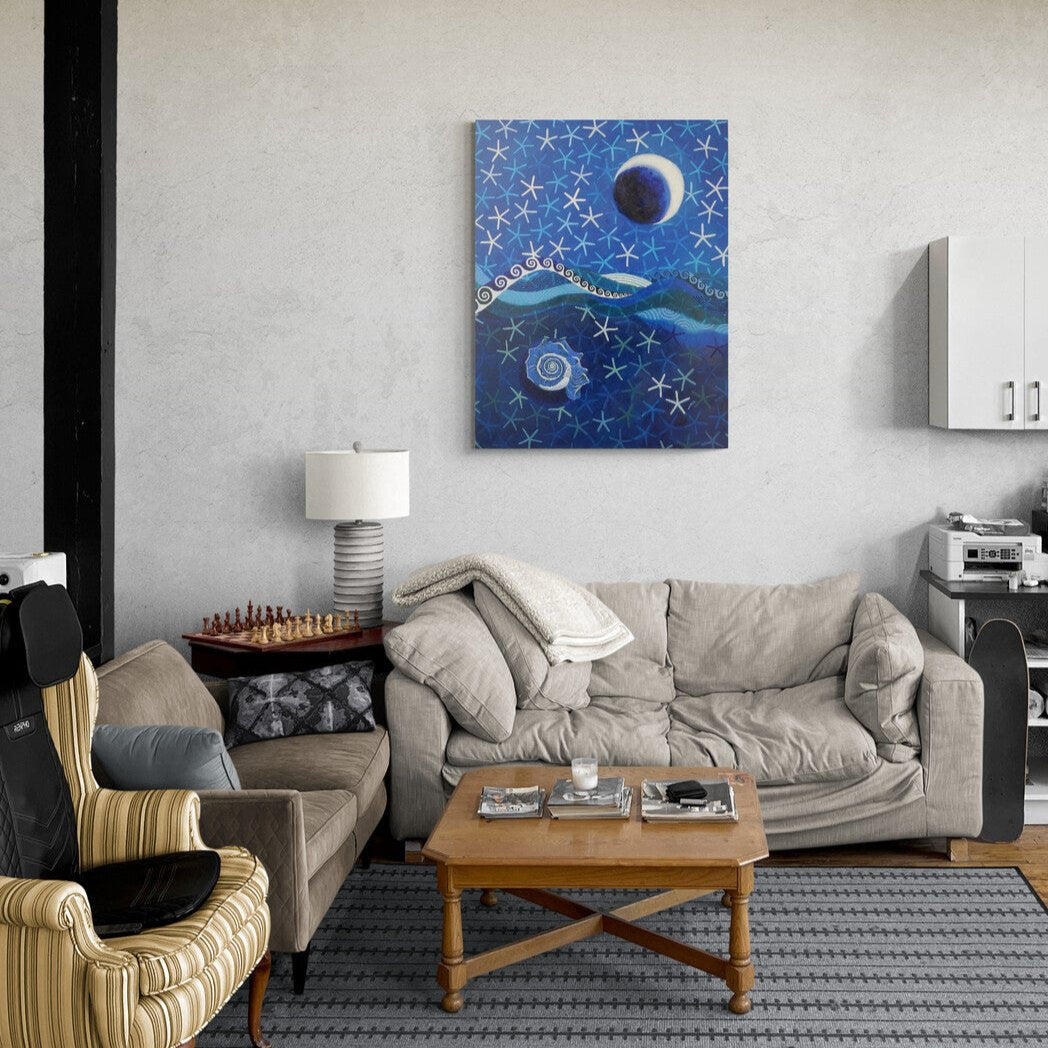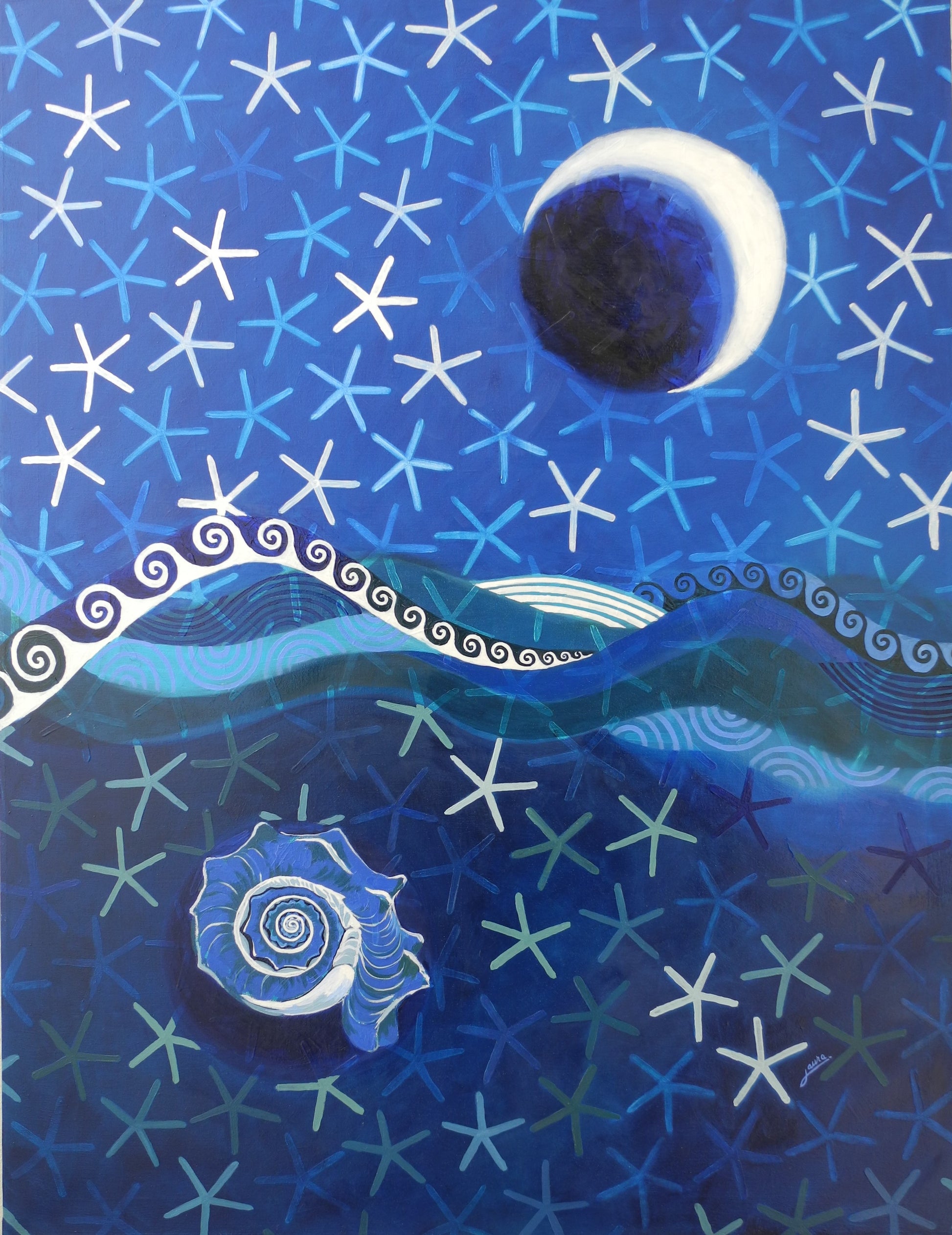 La Luna y la caracola establecen puntos de atención que equilibran la composición. Las estrellas, al repetirse en módulos, crean una textura visual que enriquece la obra. La repetición y contraste de las estrellas sirven como pretexto perfecto para crear un paisaje nocturno dinámico, donde se integran elementos espirales, circunferencia y líneas onduladas que se entrelazan.