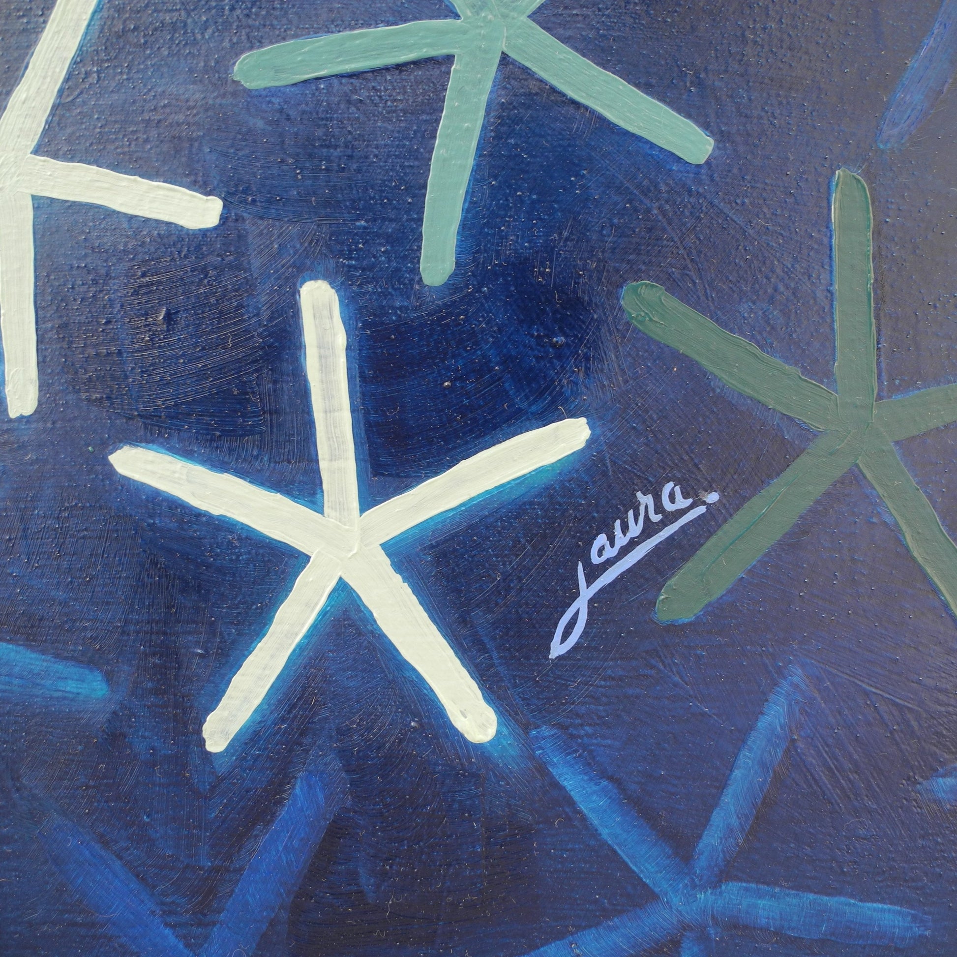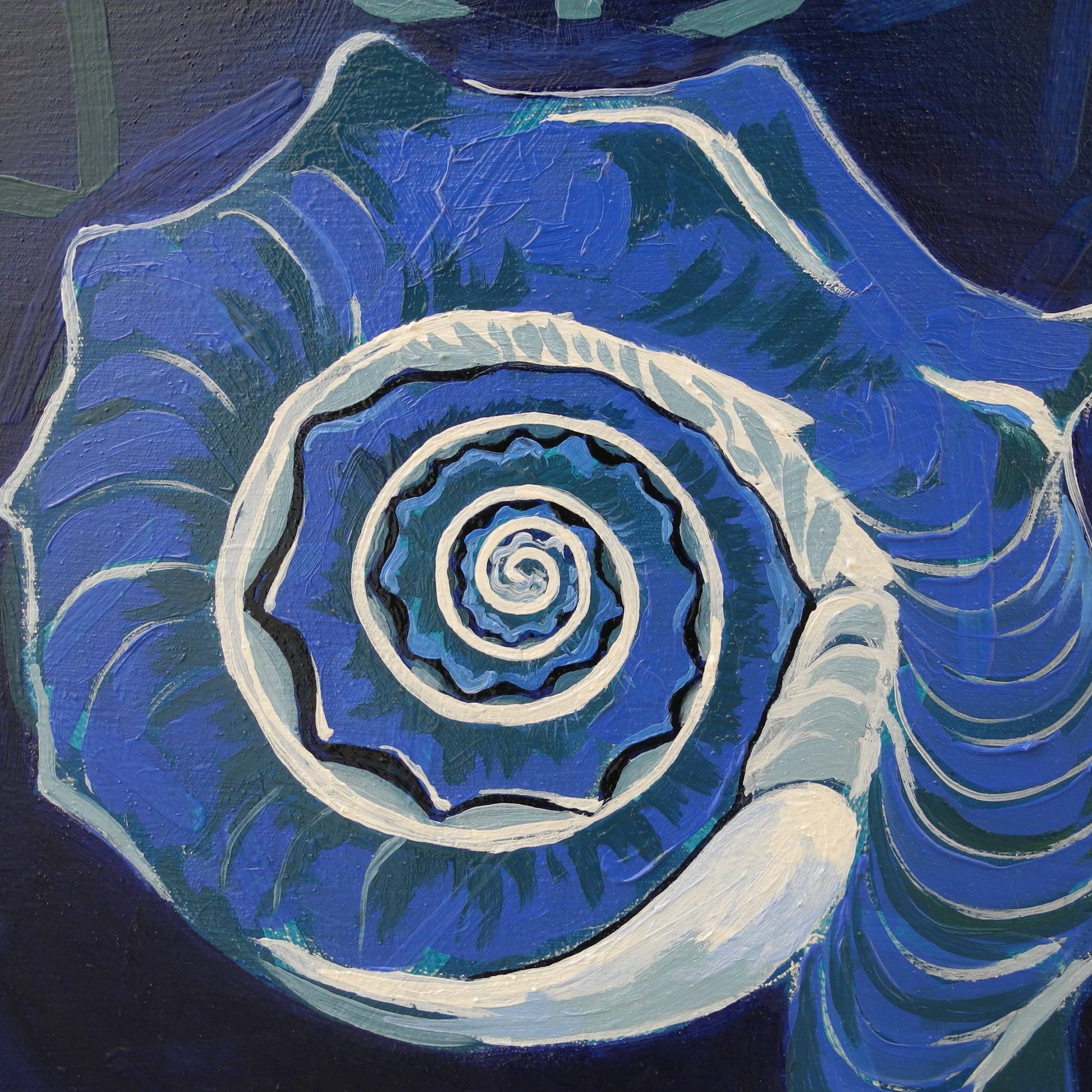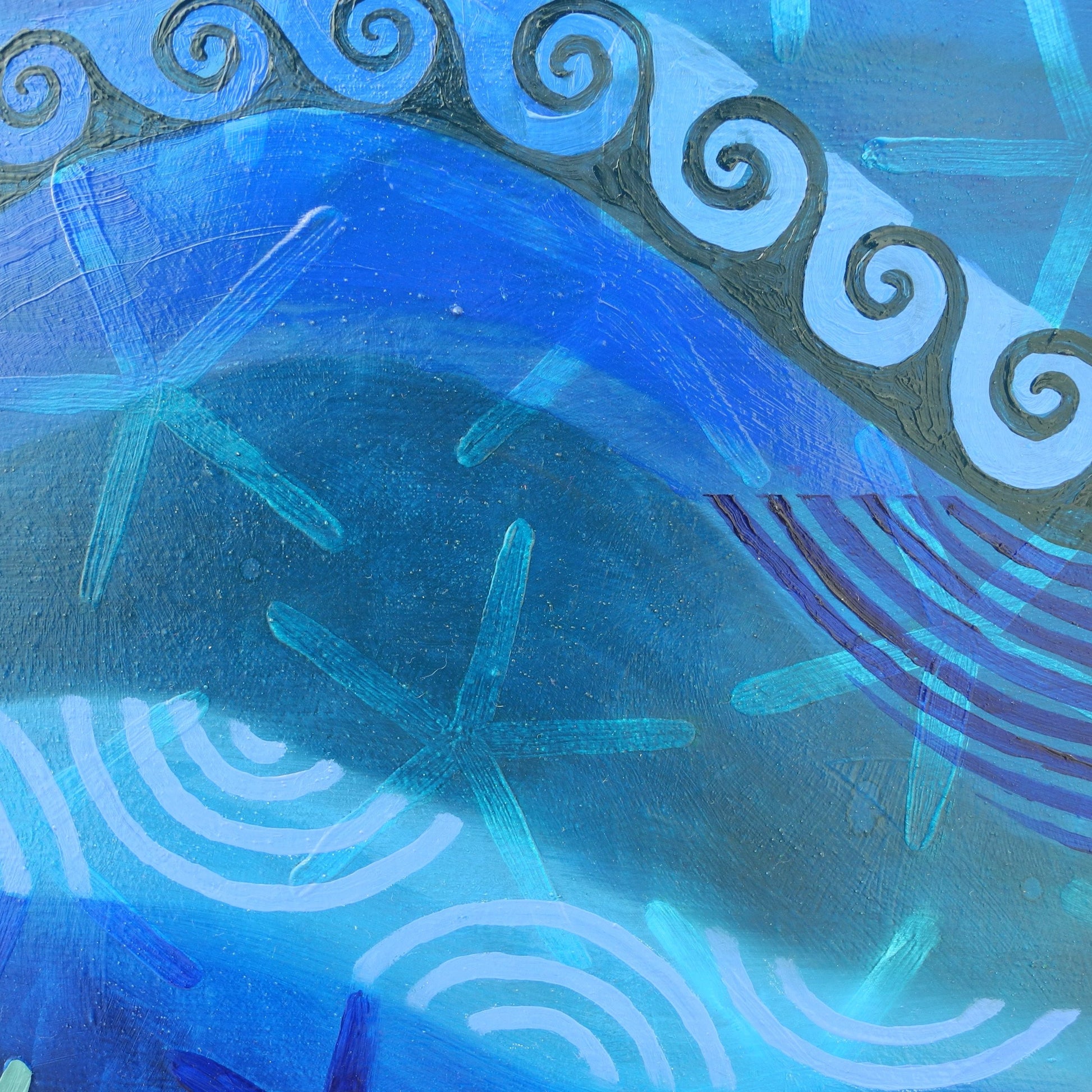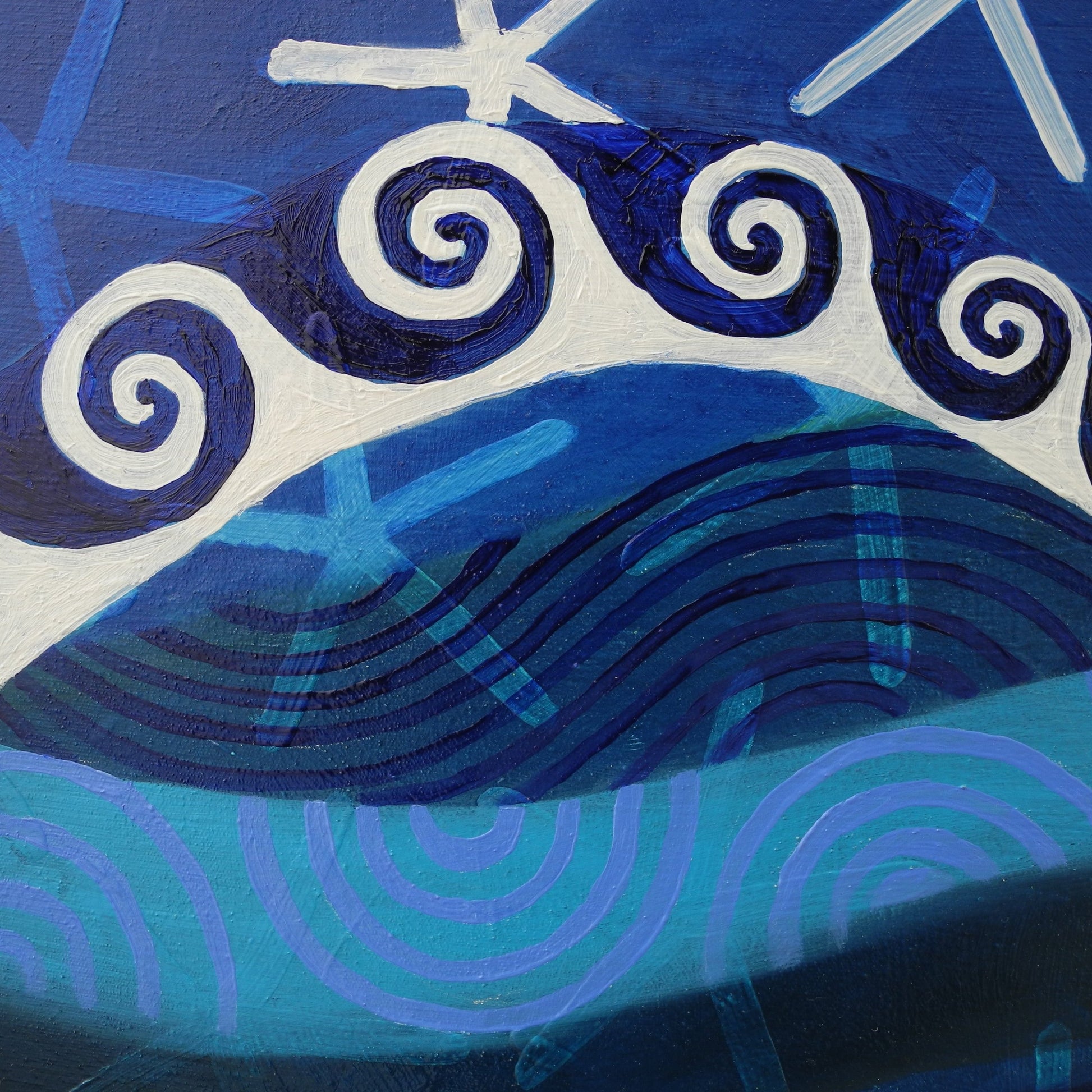 El azul es un color que genera una emoción serena, evocando sentimientos de tranquilidad y eternidad. La repetición de estrellas nos remite a la abundancia y a la plenitud. La brillante y apacible luna menguante, que se mece serenamente en el firmamento custodiando la noche, encuentra su par en las profundidades marinas, en la caracola, cuya espiral nos hipnotiza en un movimiento constante y sereno.