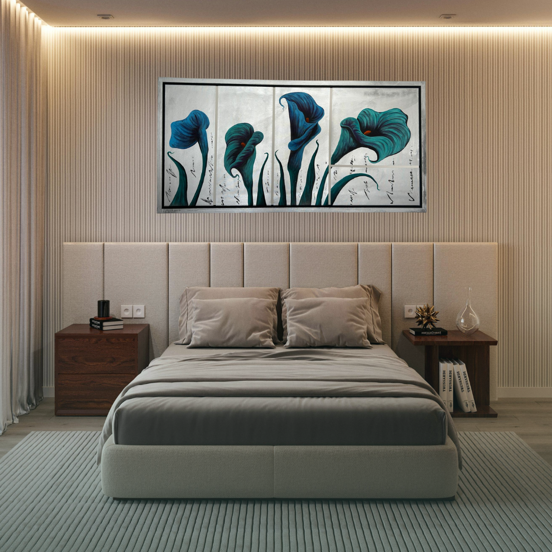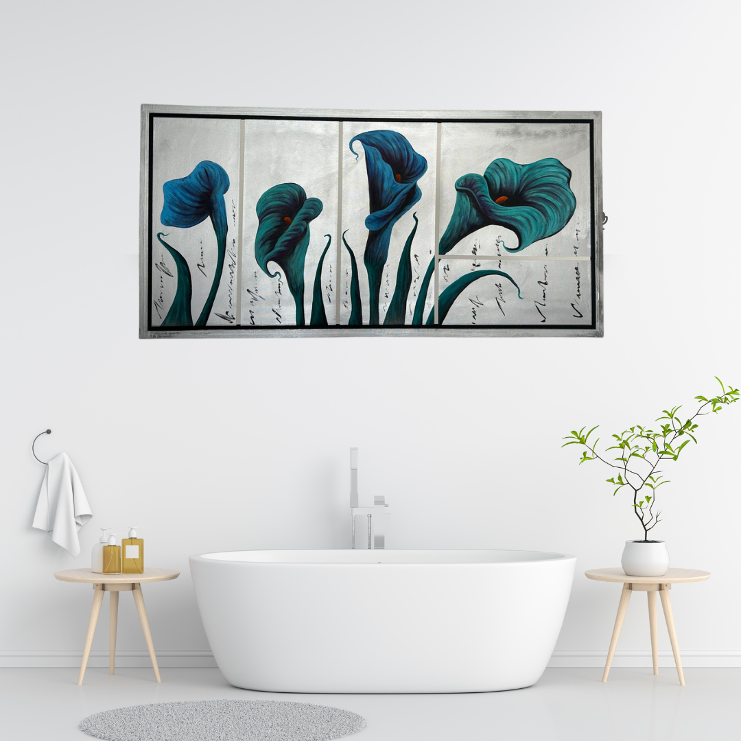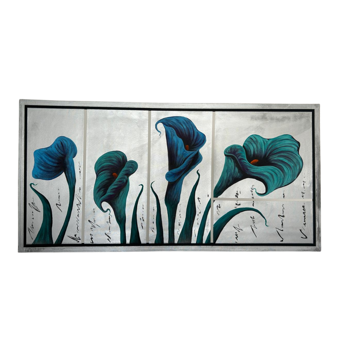 Cada trazo se entrelaza con texturas audaces y destellos metálicos, revelando capas de un jardín oculto. Los colores vibrantes y las sombras profundas te invitan a explorar los secretos que guarda la flora, mientras que los sutiles brillos capturan la luz de una manera mágica, como si el lienzo cobrara vida.
