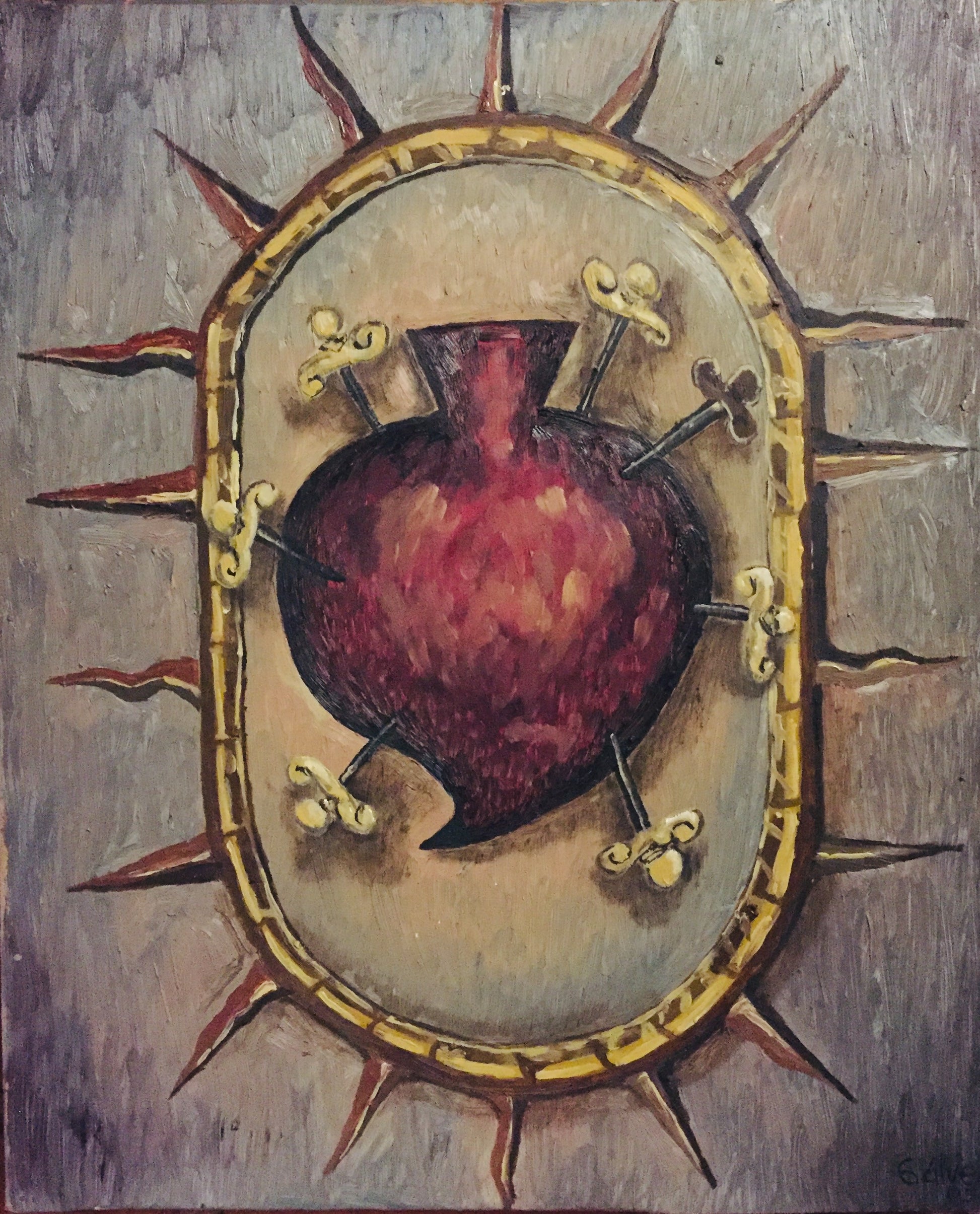 Novum Cordis Culpae óleo sobre lámina pintado a la manera barroca retomando iconografía del corazón sacrificado como una nueva culpa del corazón, mientras que en la época prehispánica el corazón representaba la vida