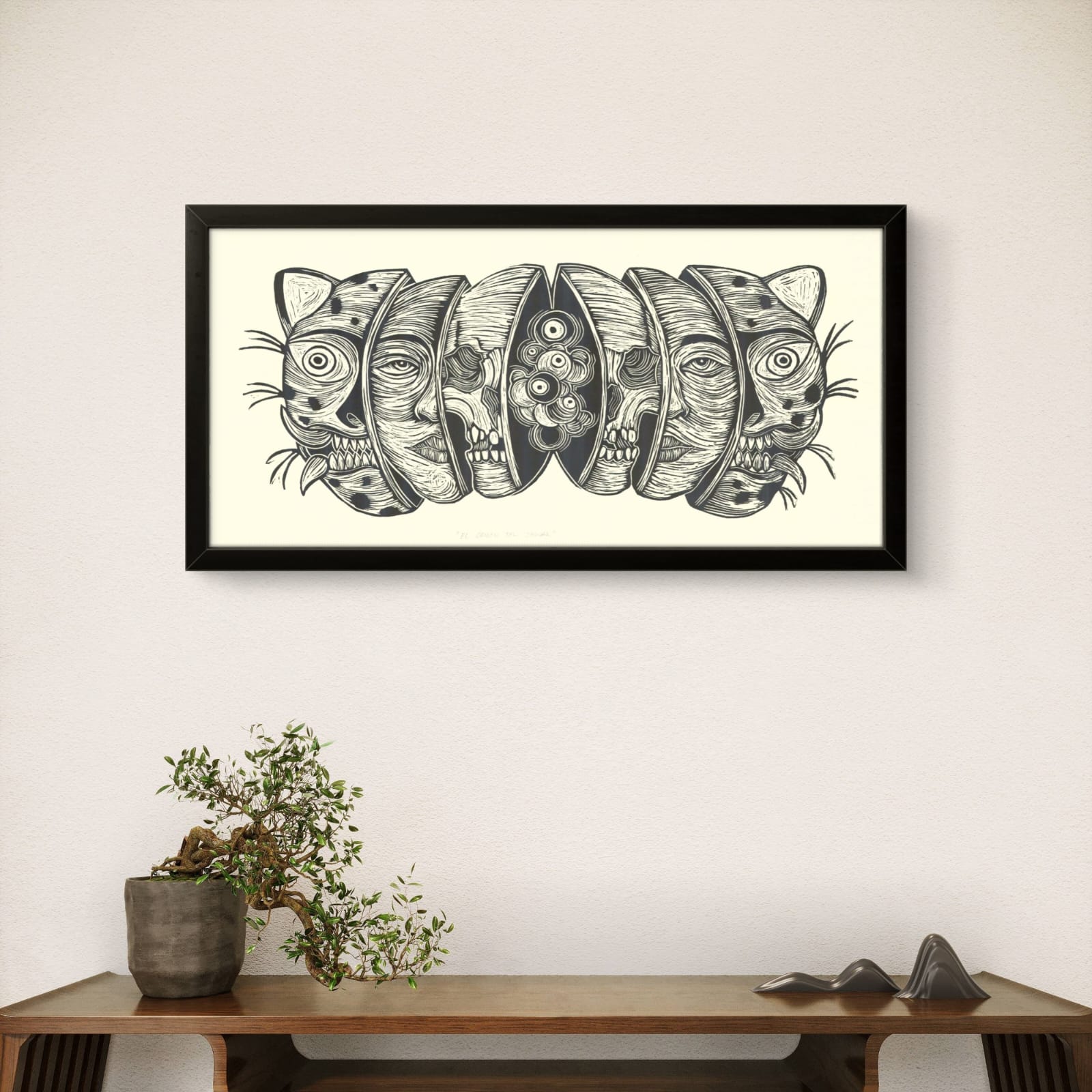 El despertar del jaguar hace un homenaje a esa tradición, combinando arte, folclore y tradición. Esta linografia hará vibrar el lugar dónde sea colocada por su belleza y su vibrante originalidad.