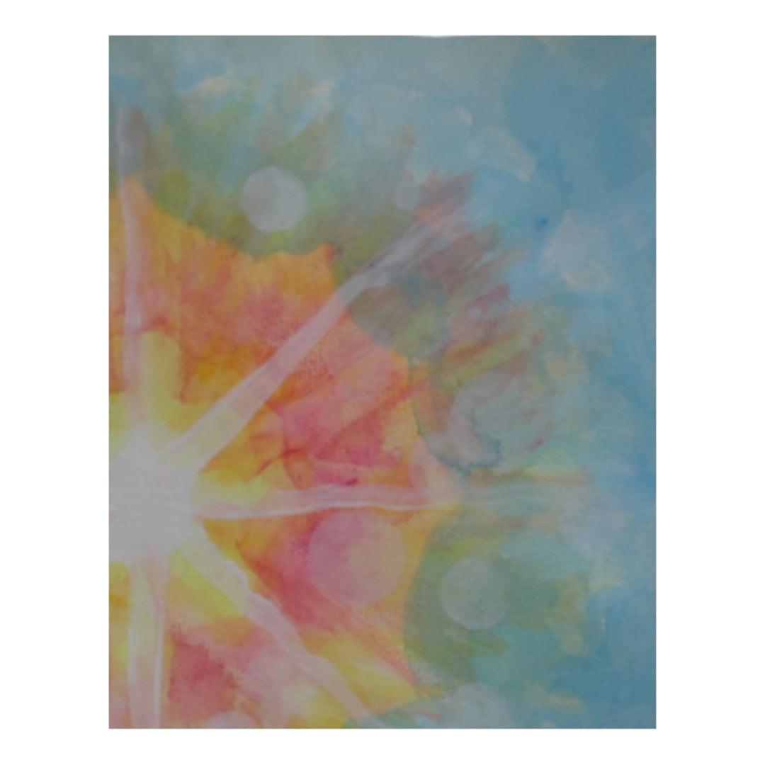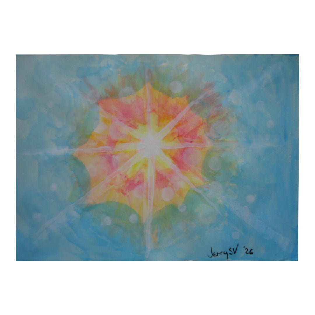 Evoca la idea de la paz como luz interna que se expande, de forma contenida, casi espiritual. Atrae al espectador hacia el centro y lo retiene en calma.