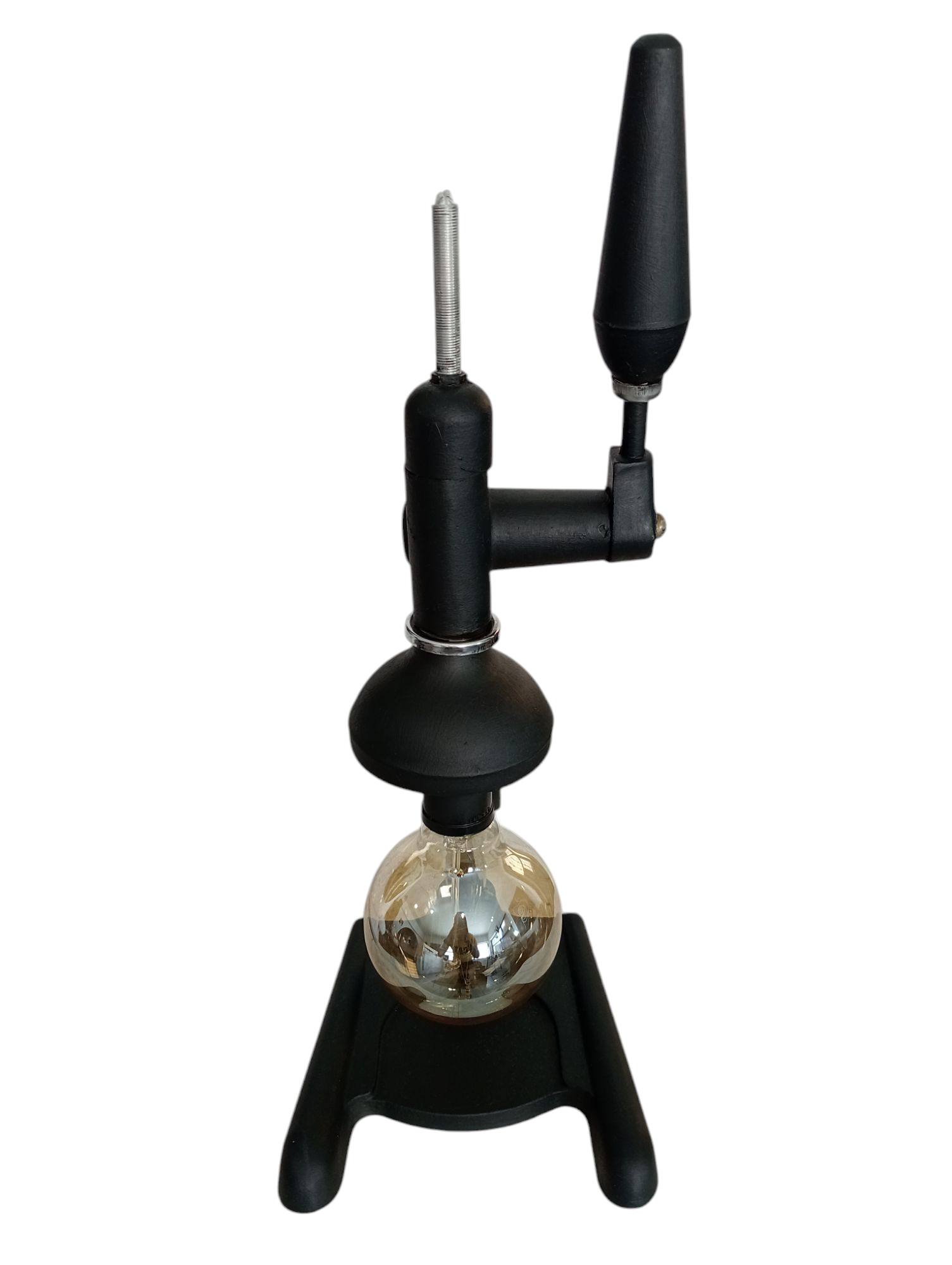 La lámpara “Orange Press” es una pieza única que fusiona nostalgia, funcionalidad y arte reciclado. Creada a partir de una exprimidora de naranjas antigua, esta obra de Luis Argumedo transforma un objeto cotidiano del pasado en una fuente de luz contemporánea.