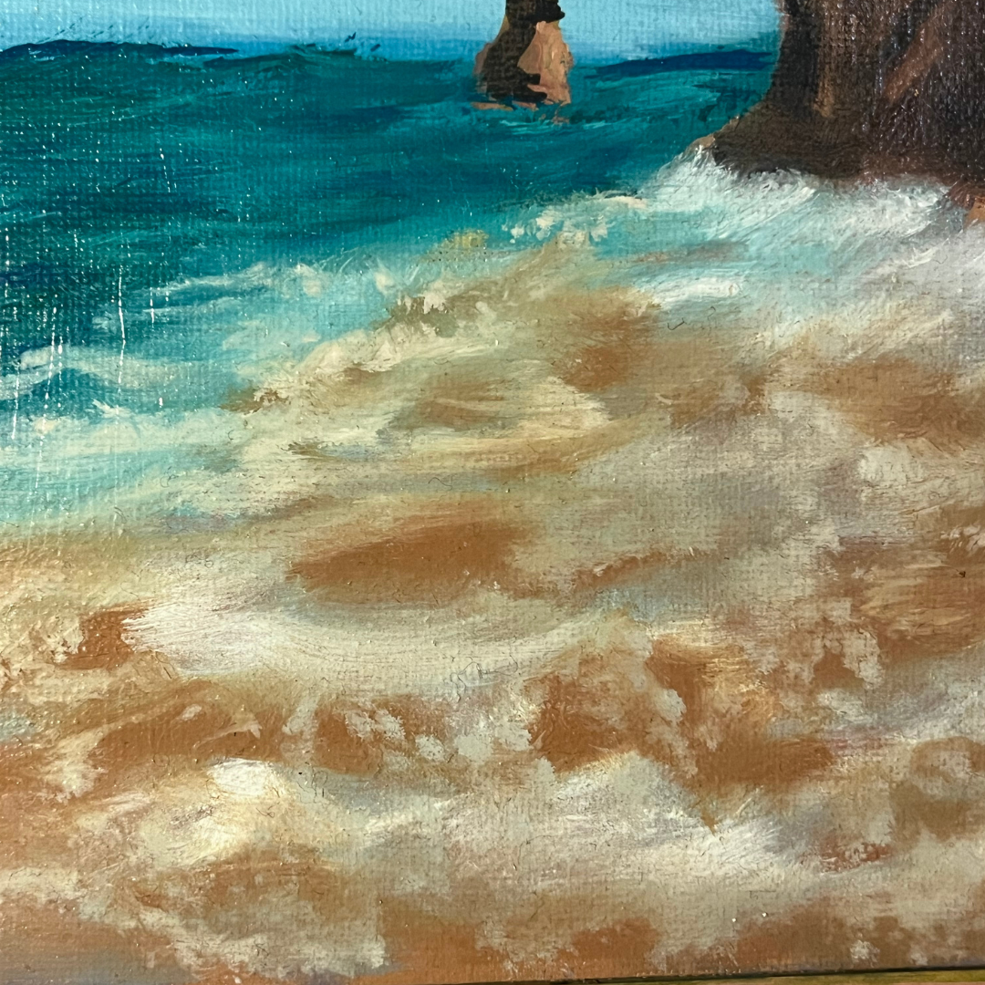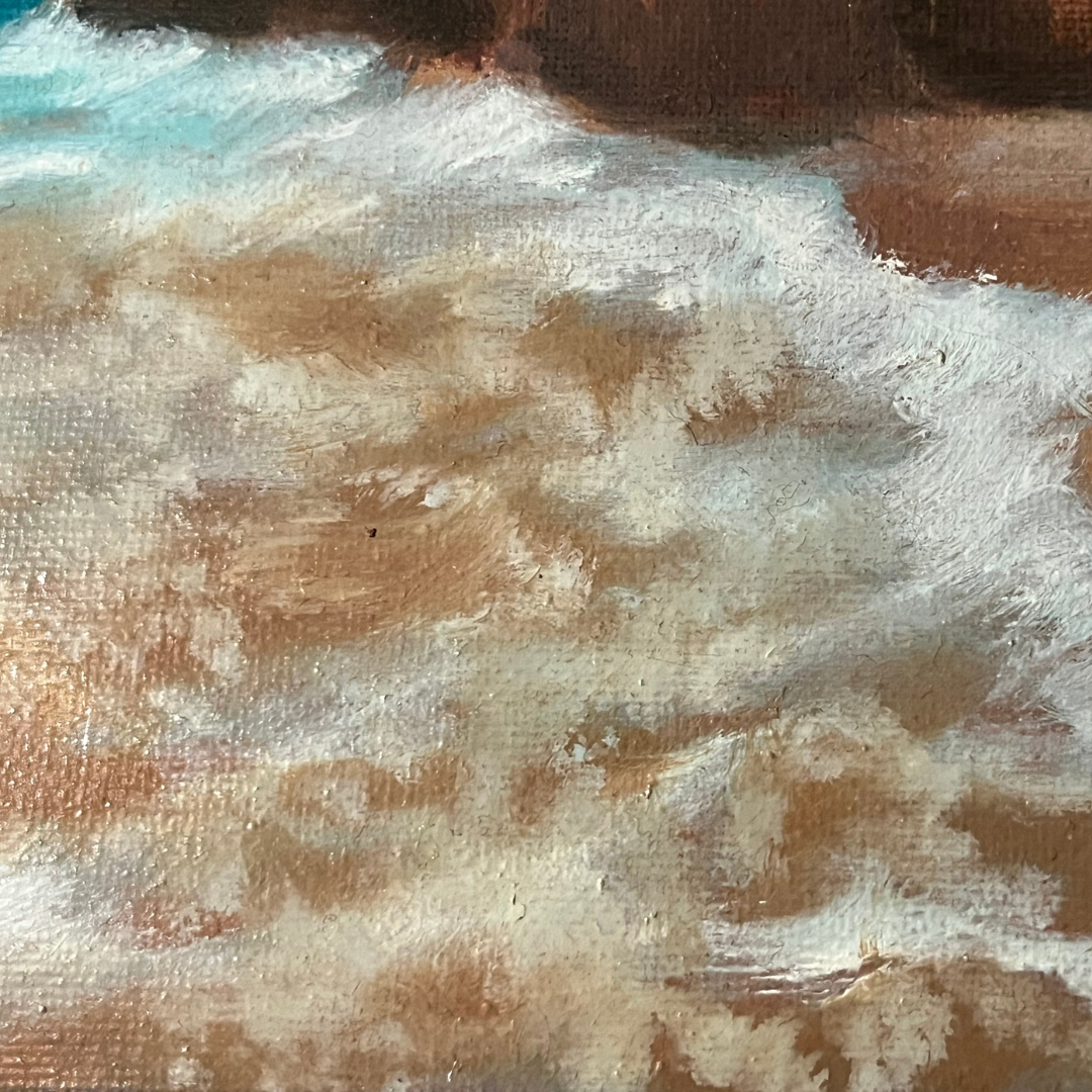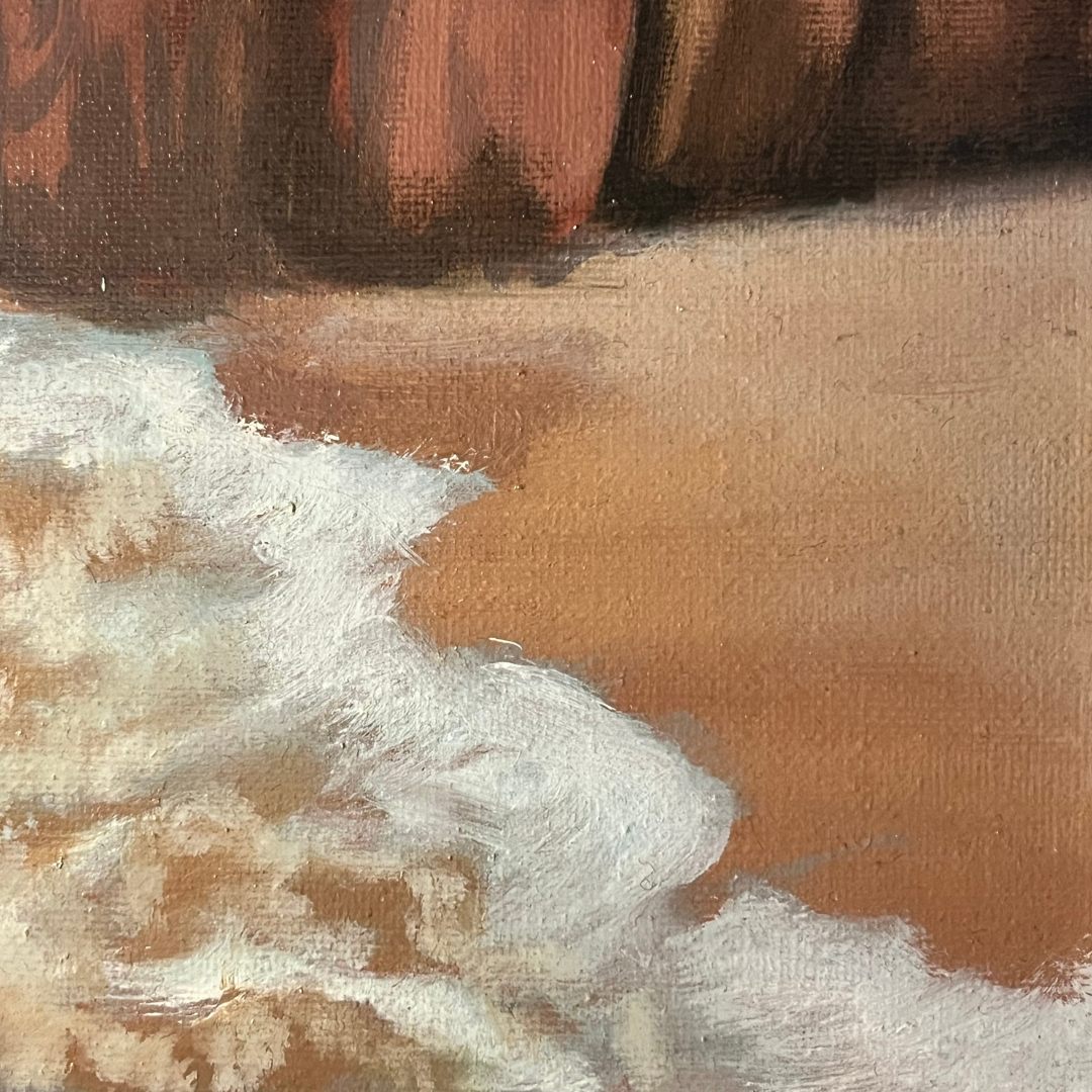 Las texturas del óleo dan vida al movimiento del agua y al calor de la luz sobre las piedras rojizas, transportando al espectador a una playa donde la tierra y el mar conversan en silencio.