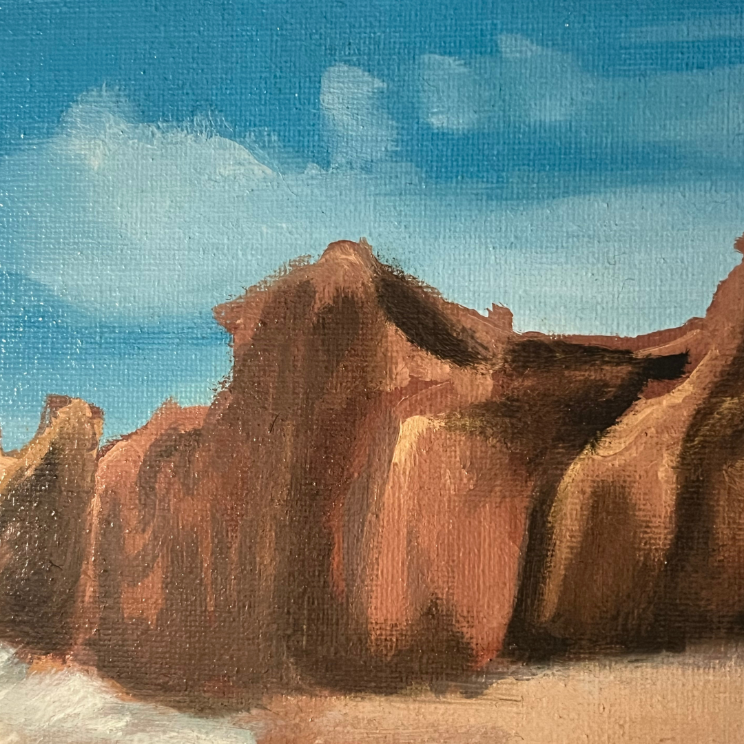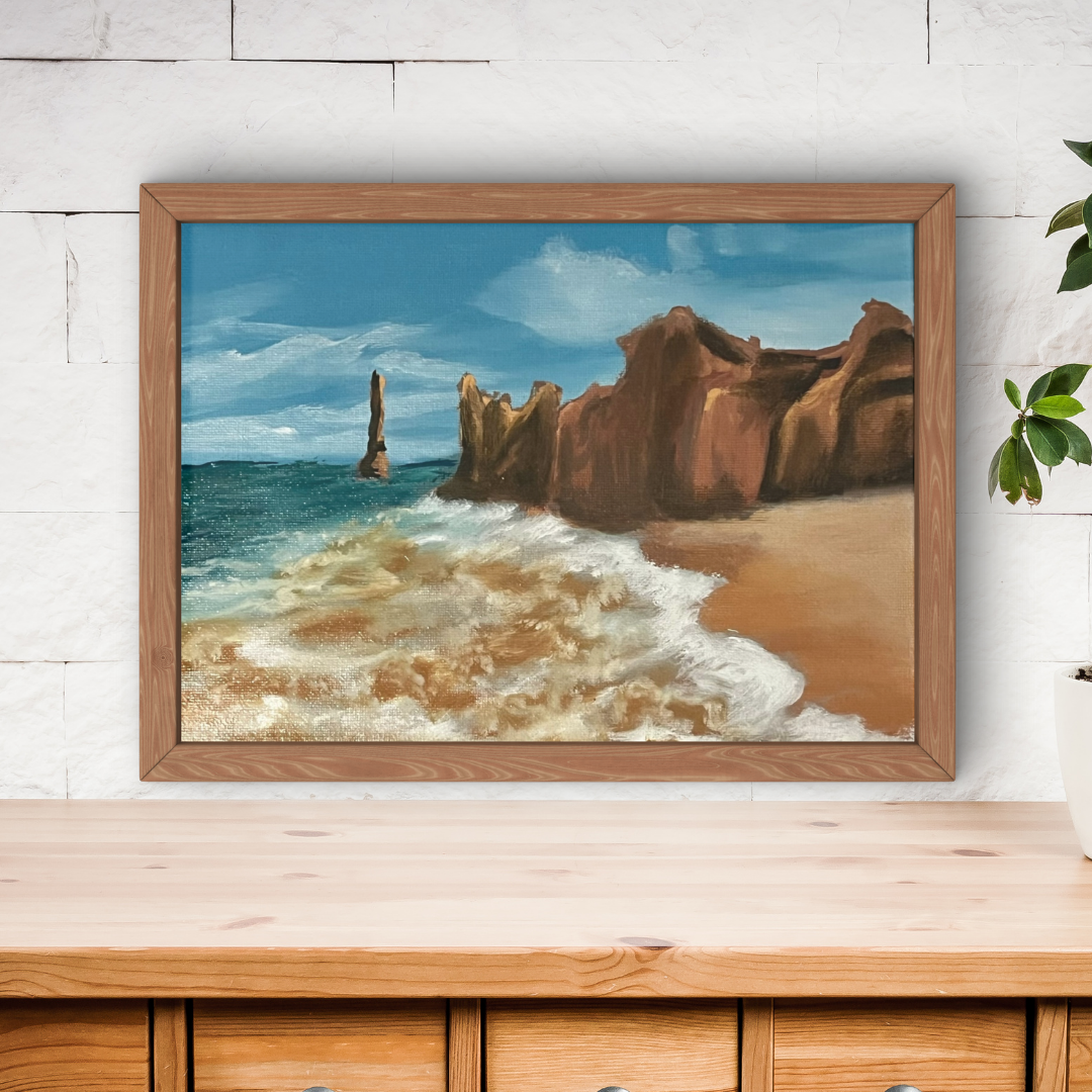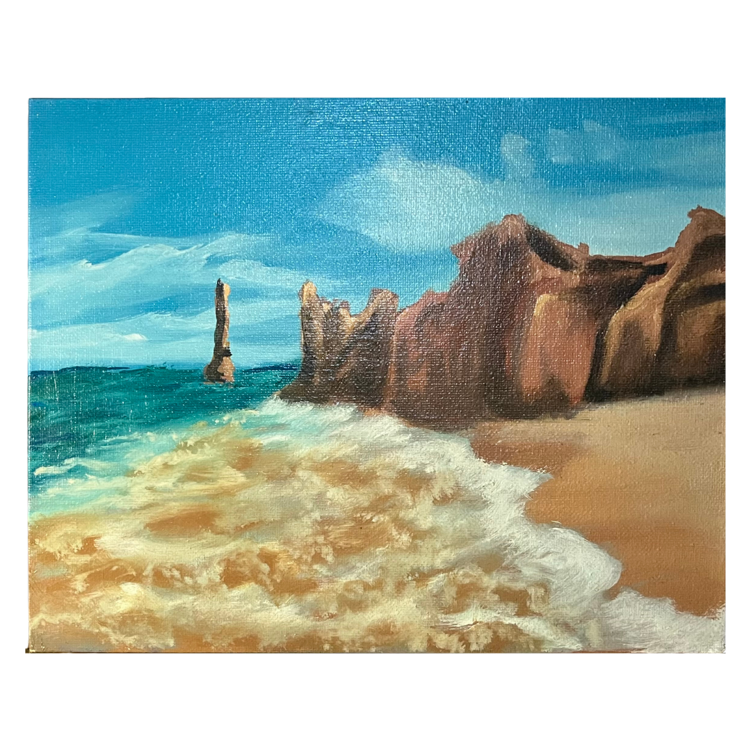 Las texturas del óleo dan vida al movimiento del agua y al calor de la luz sobre las piedras rojizas, transportando al espectador a una playa donde la tierra y el mar conversan en silencio.