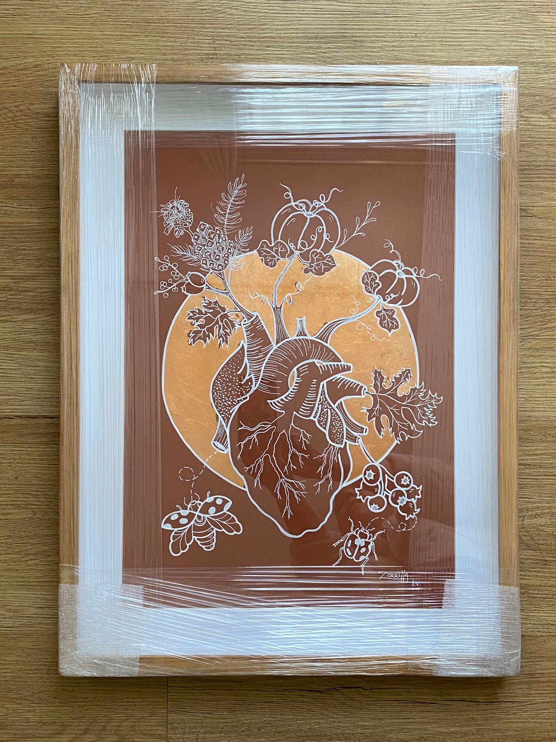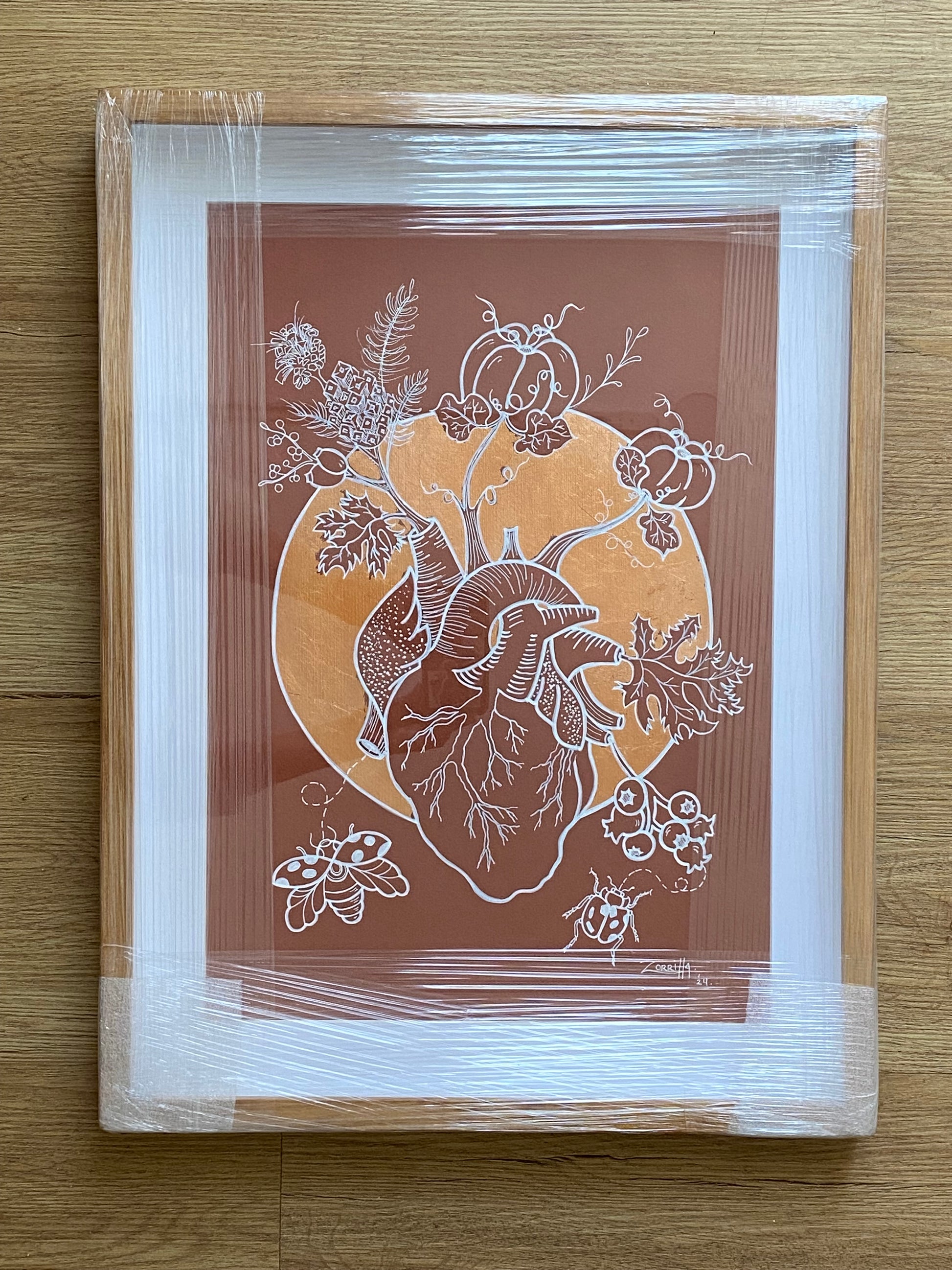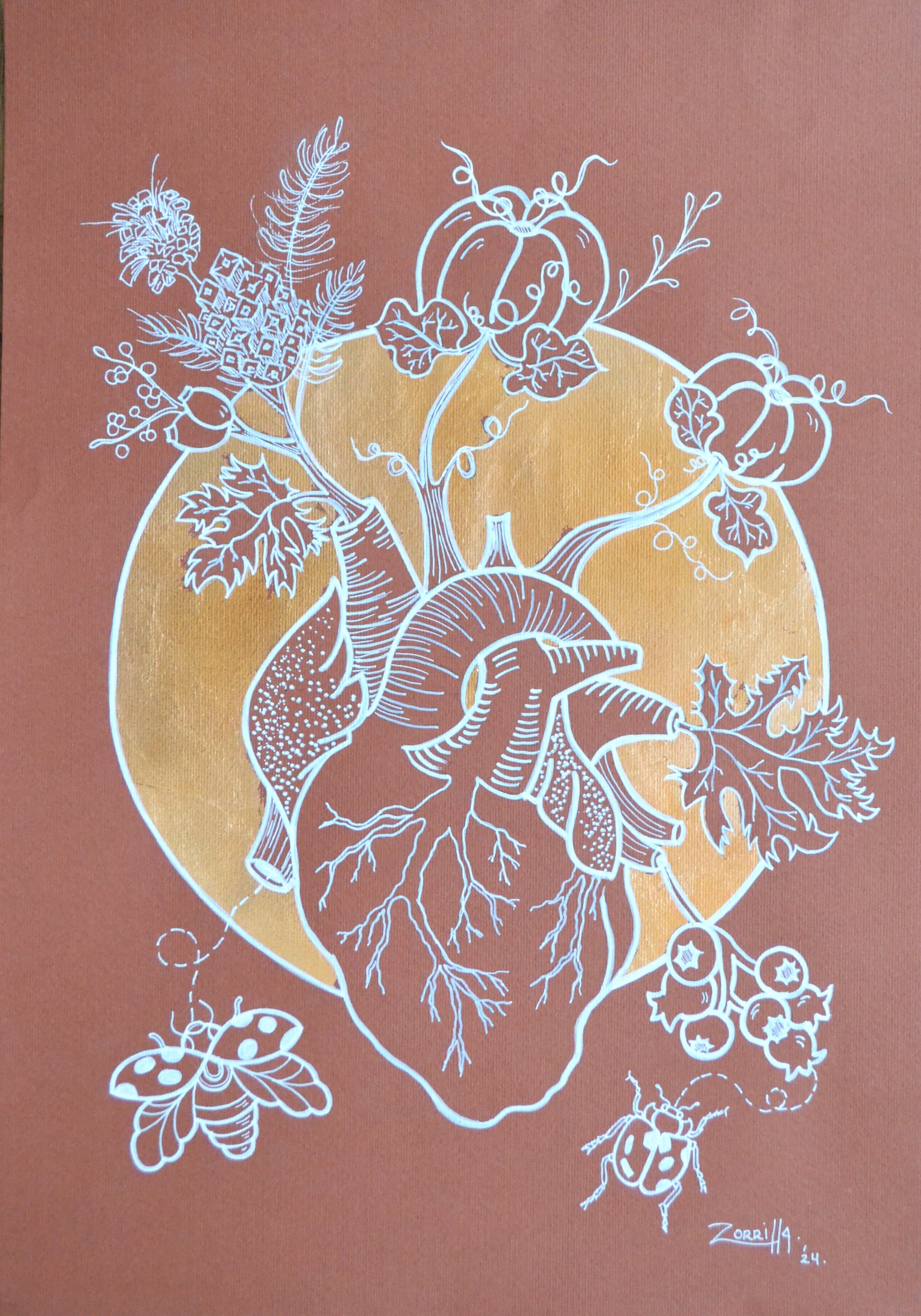 Esta obra es parte de una colección de 4 dibujos realizados con acrílico y hojas de oro, plata y cobre en las que se representa al corazón en sus cuatro estaciones, la colección forma parte de la serie "Habitáculo del Alma".
