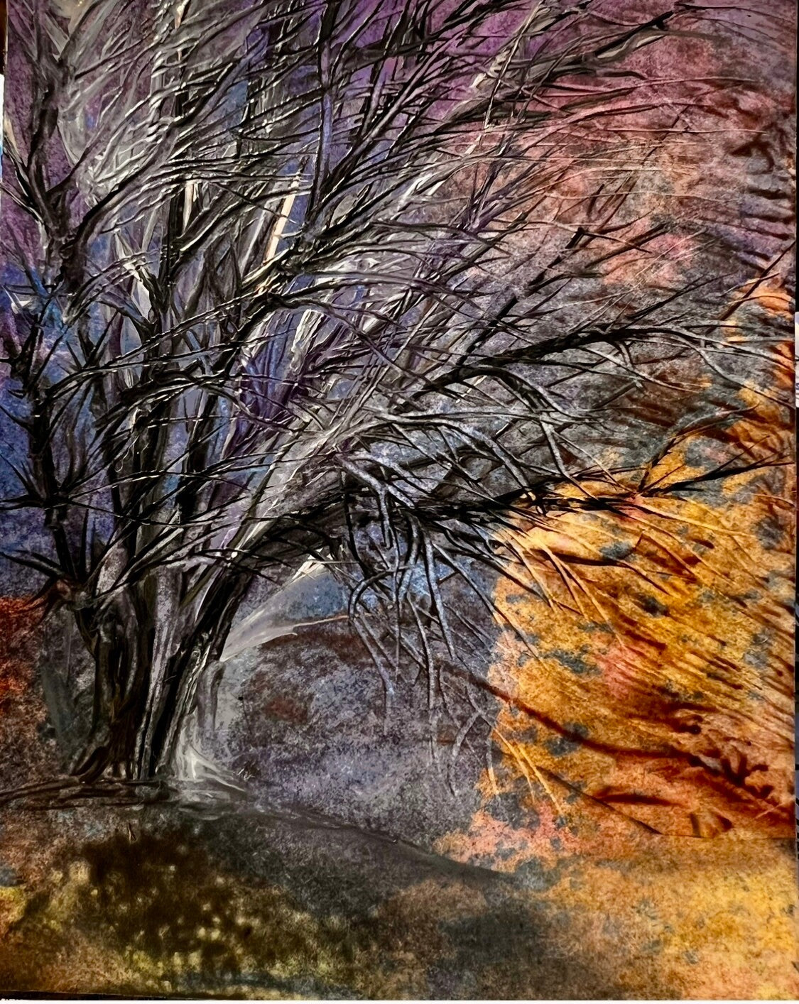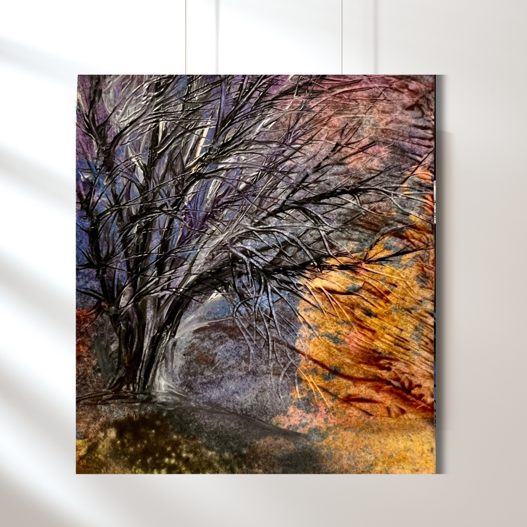 La representación de un árbol con ramas desnudas es central en la composición, destacándose contra un fondo de colores otoñales apagados, en tonos morados, grises y anaranjados. Las hojas, que alguna vez estuvieron llenas de vida, ahora son solo un recuerdo en el viento, mientras el árbol parece estar en un estado de quietud, casi en espera.