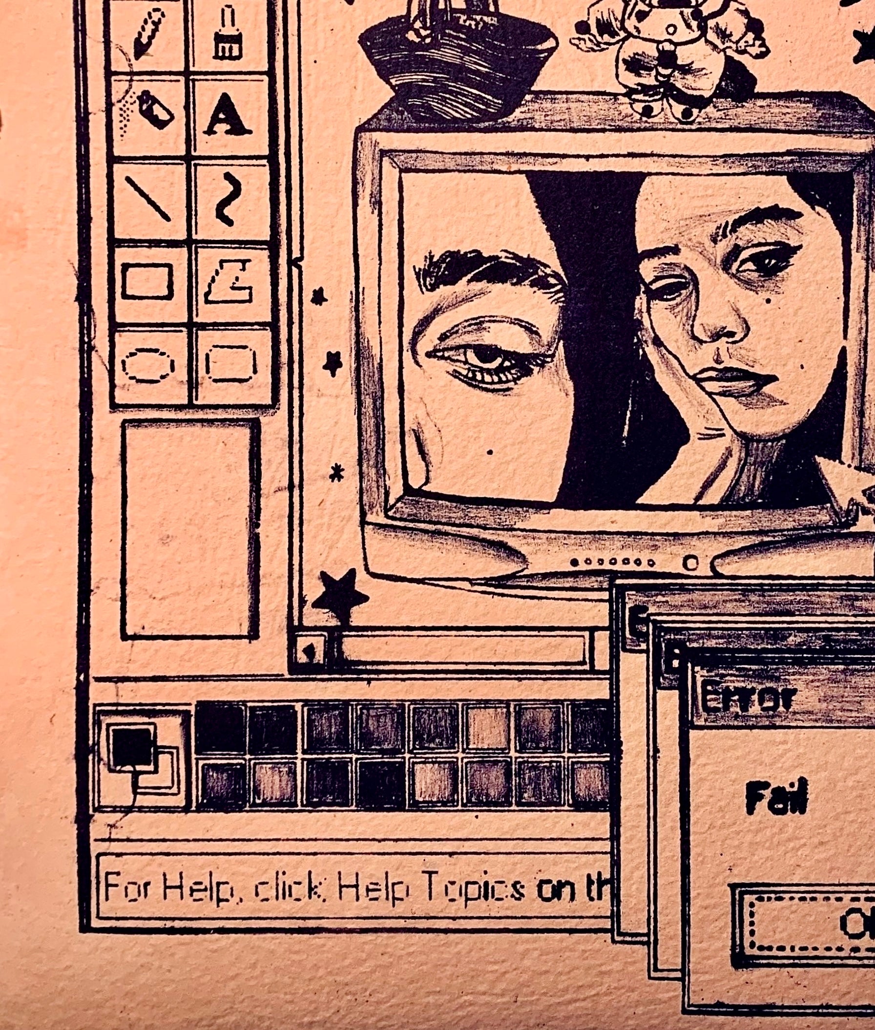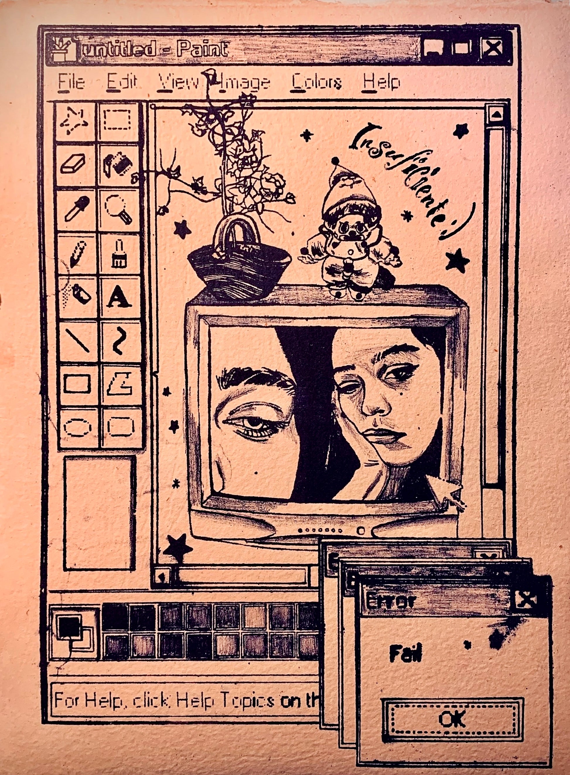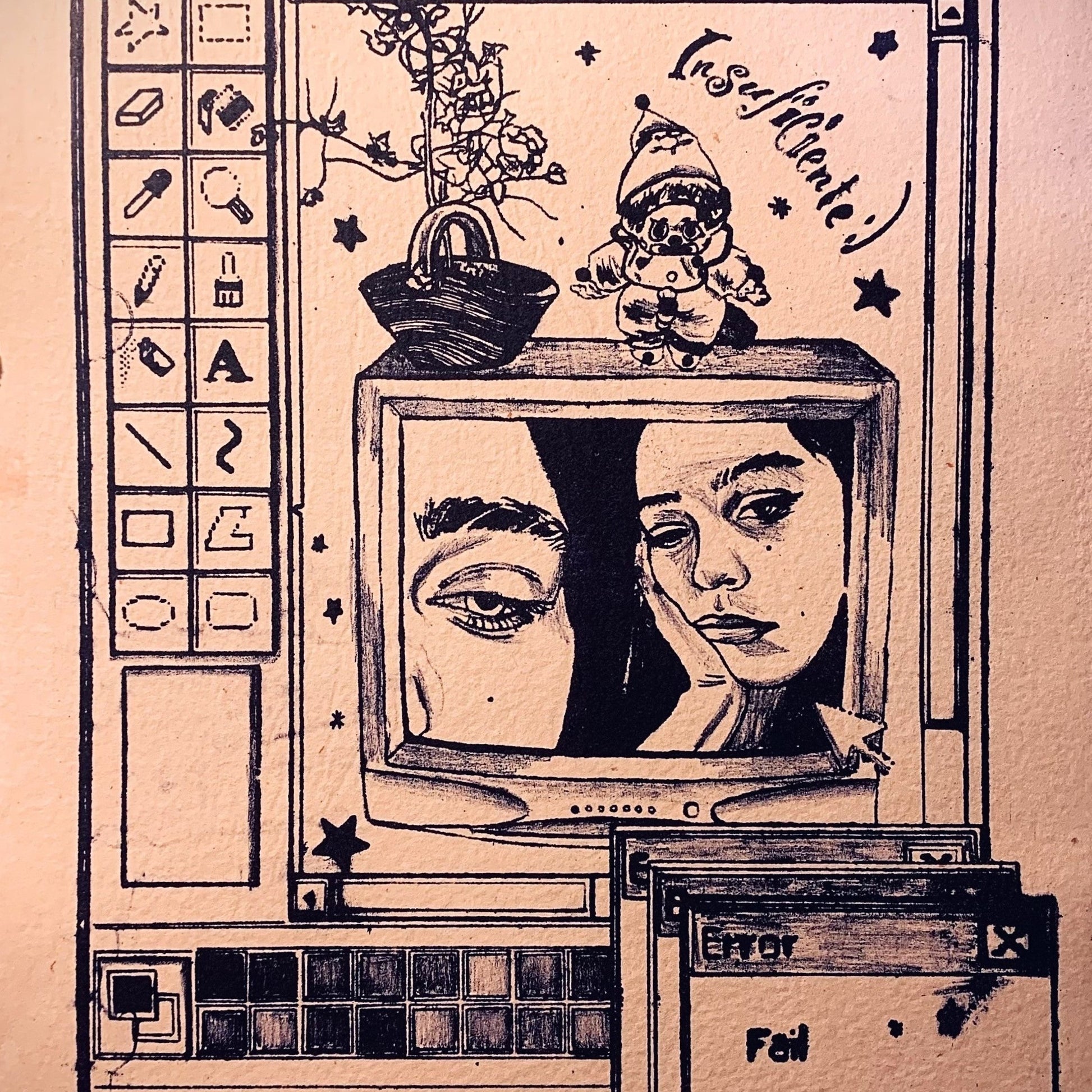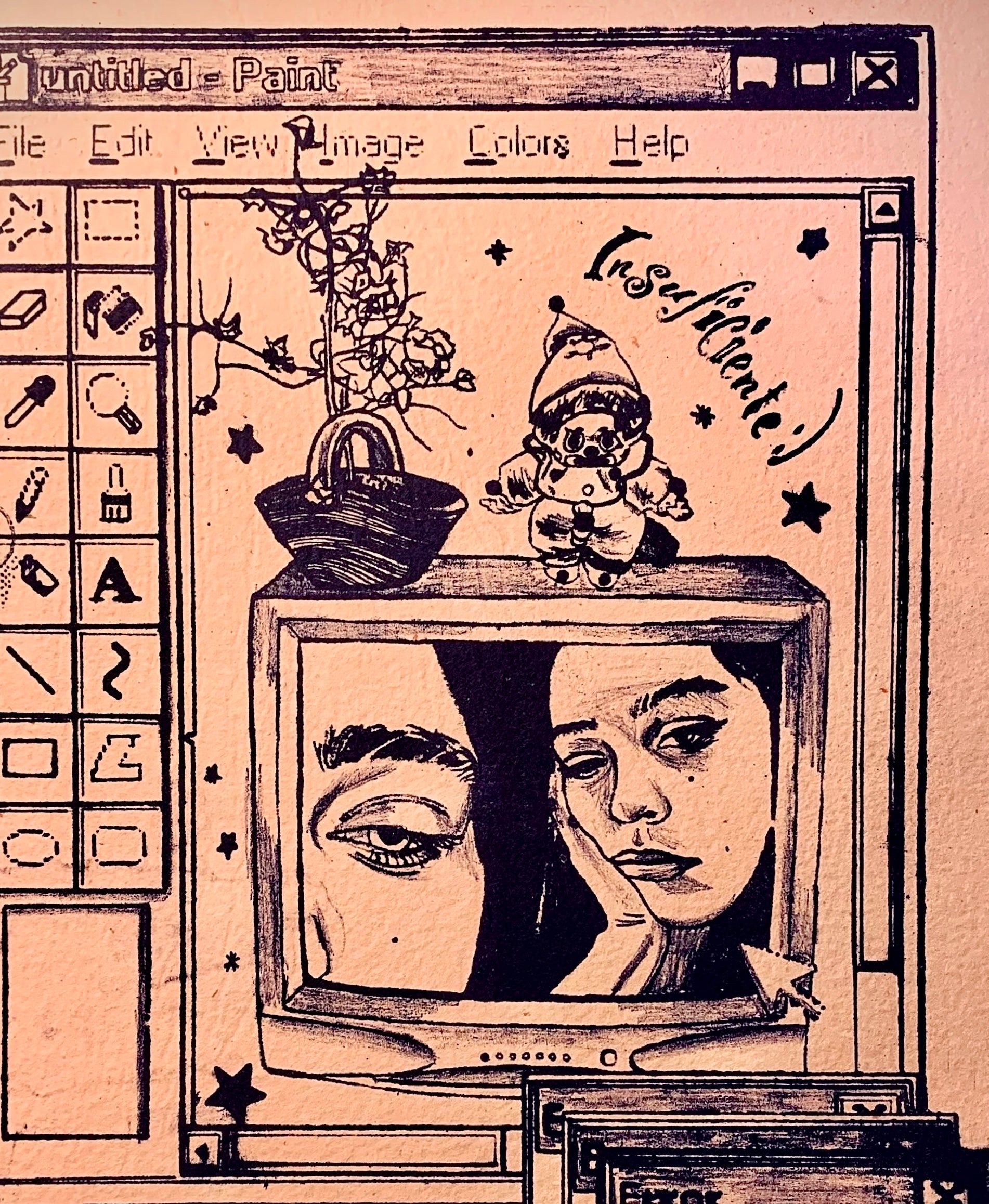 Esta obra combina elementos de la nostalgia digital con un retrato íntimo, explorando temas de insuficiencia emocional a través del contraste entre la estética del software antiguo y la expresión humana.