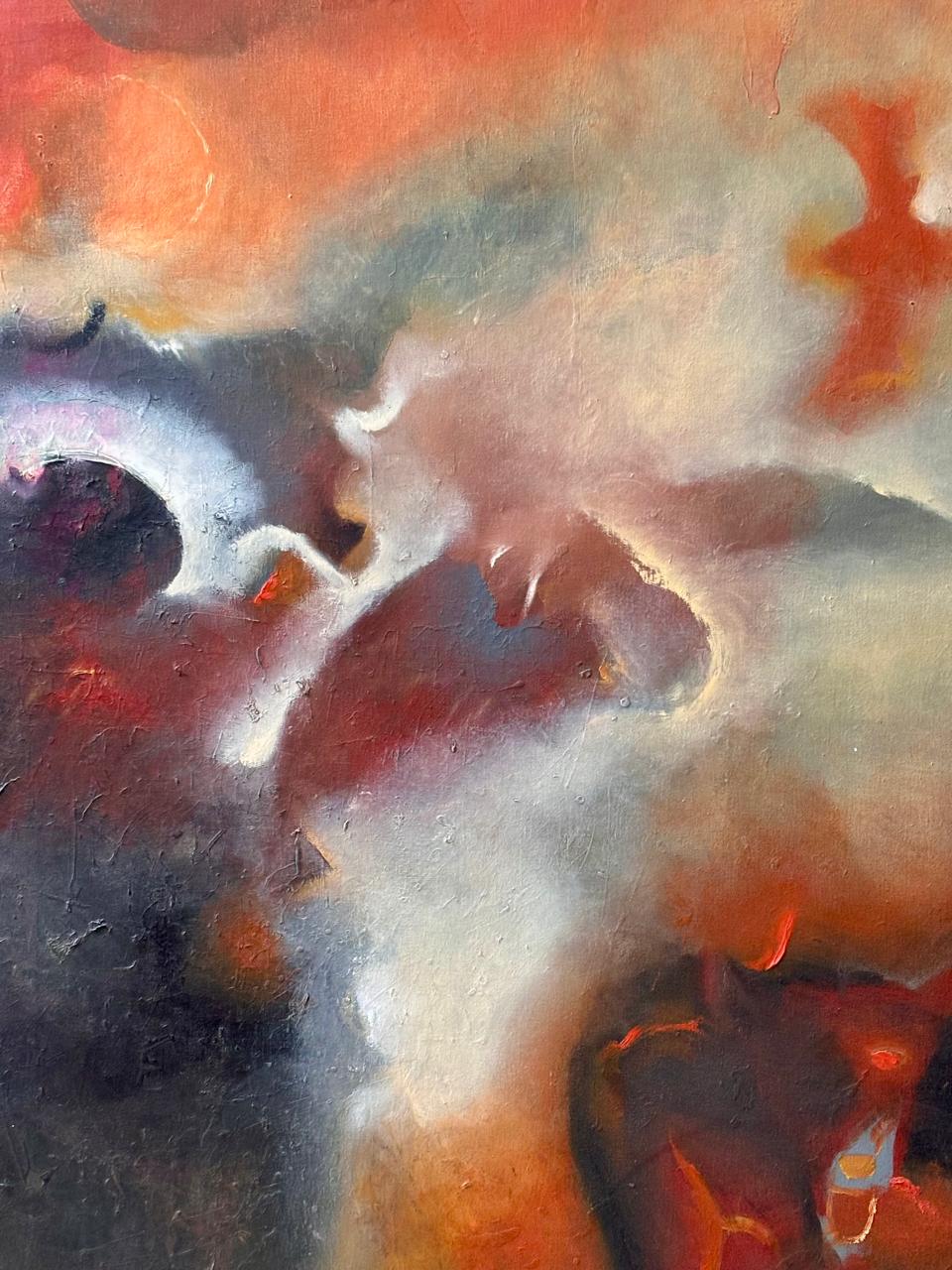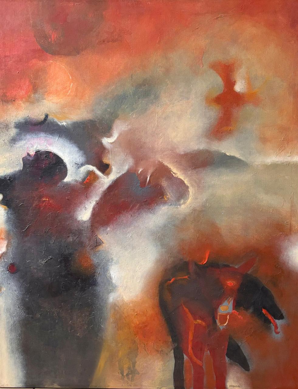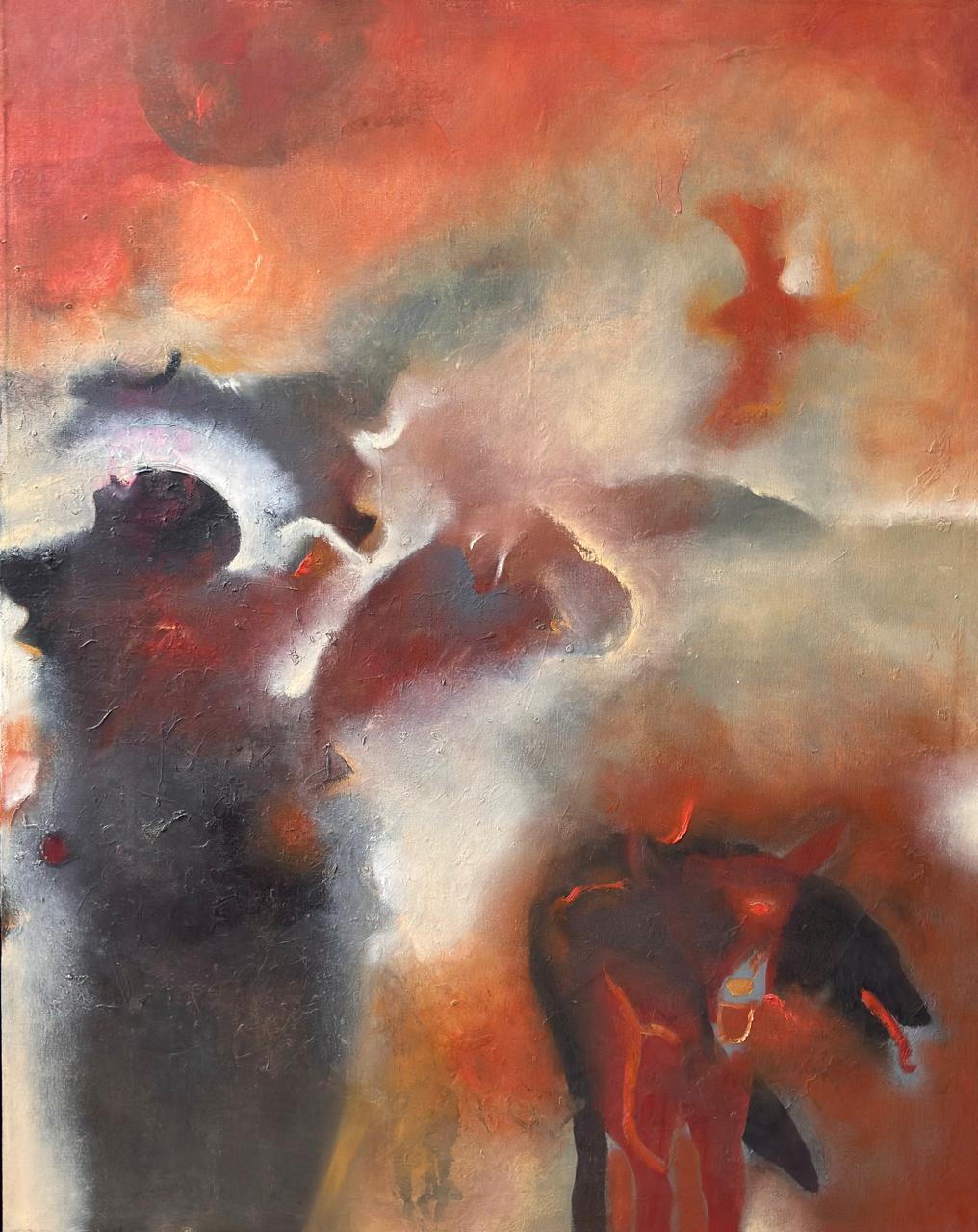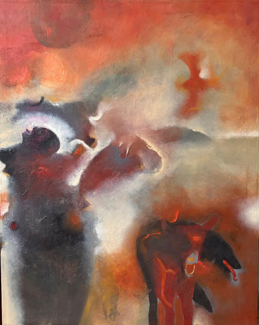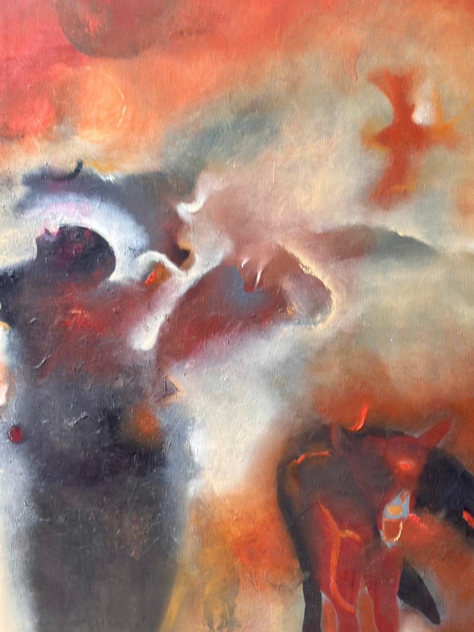 La obra captura la esencia de un atardecer mediante una composición abstracta que sugiere figuras y paisajes sin definirlos del todo, evocando la luz dorada del sol al descender lentamente. En medio del cromatismo vibrante y la textura espesa de óleo, se distingue una figura central: un perro negro. Su silueta está ligeramente estilizada, casi como una sombra viva que contrasta con la calidez del fondo.