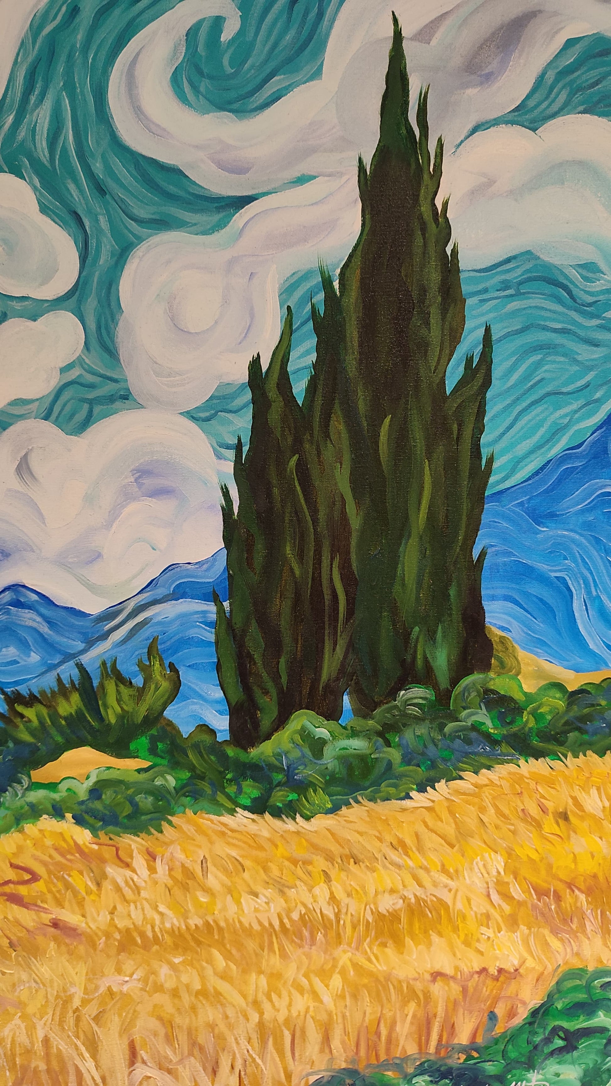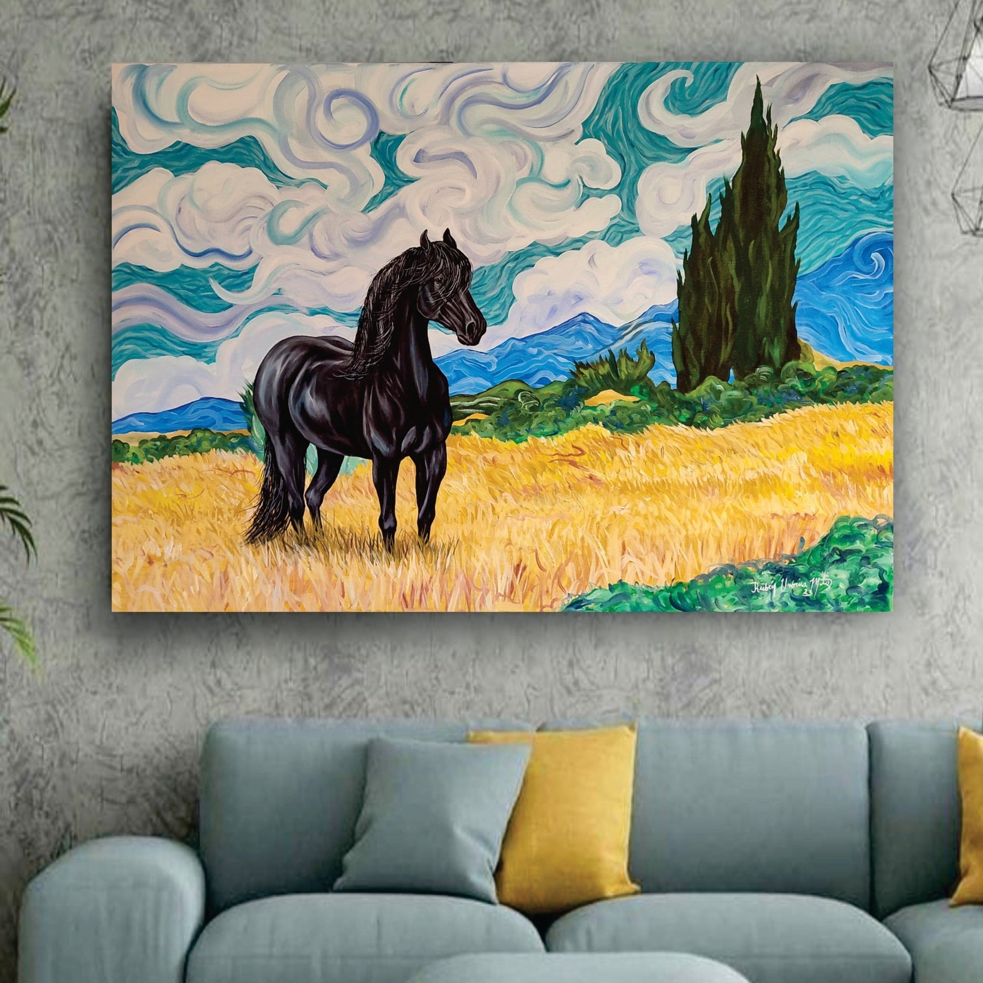 Pintura inspirada en la famosa creación de Vincent Van Gogh, donde muestra el "Campo de trigo y cipreses" realizada por la mano del artista bajo su propia visión, pero colocando un elemento adicional, el cual es un poderoso caballo negro Frisian, el cual resalta en el fondo claro; esta pintura es complementaria con la obra "Noche estrellada a caballo"