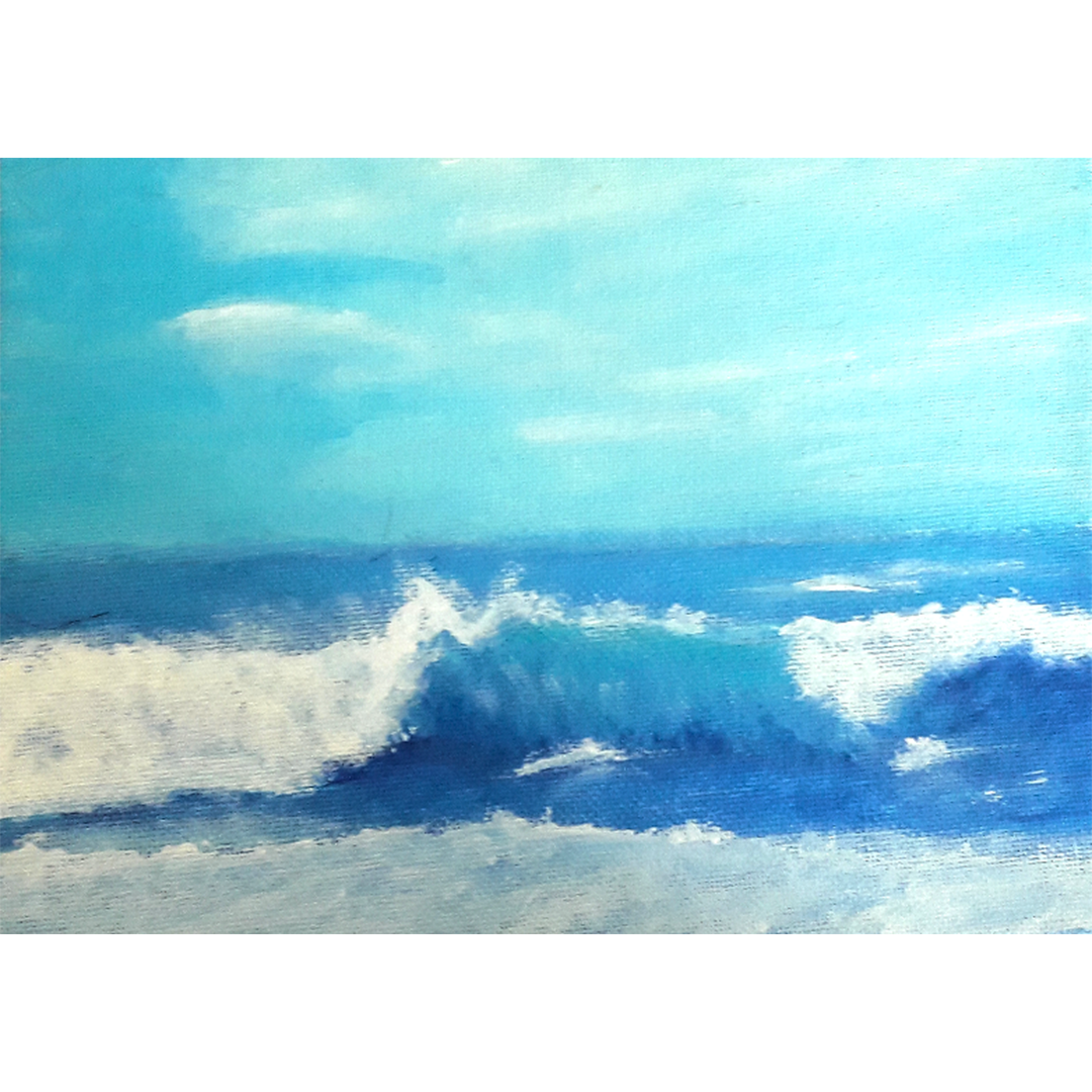 Escena marítima, donde la calma se ve interrumpida por el suave golpeteo de las olas, mientras se esparce la brisa por el aire. A través de esta panorámica, se muestra la grandeza en los detalles que pasan desapercibidos o parecen sencillos, pero que recuerdan que estamos vivos. La obra no incluye marco.