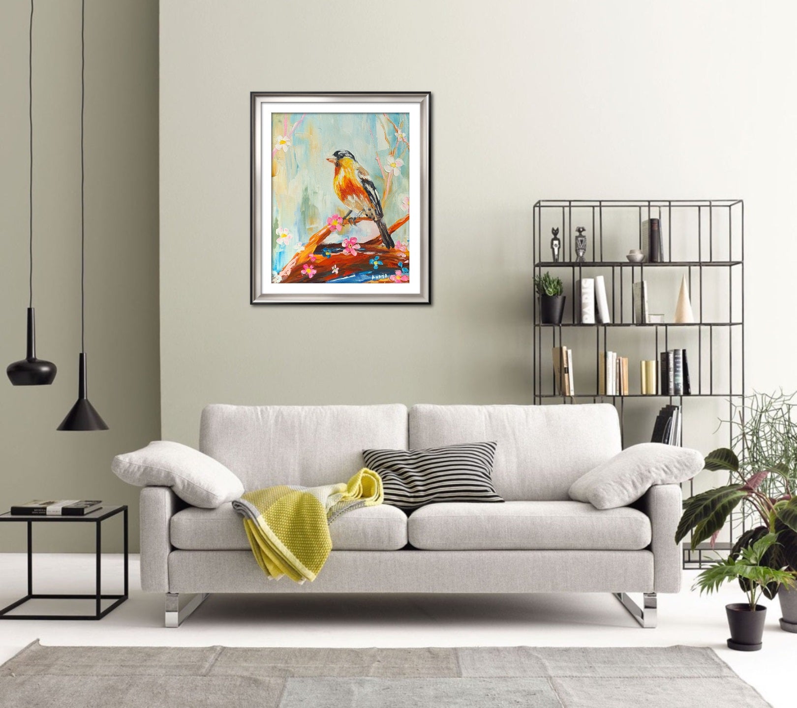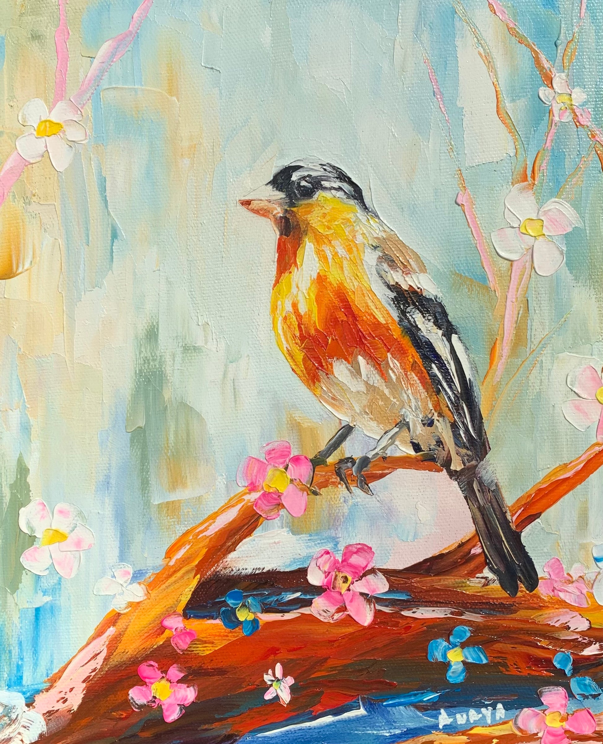 En esta serie de Pajaritos el artista quiere expresar el gran color y belleza del ave, transmitiéndolo con los colores y textura.