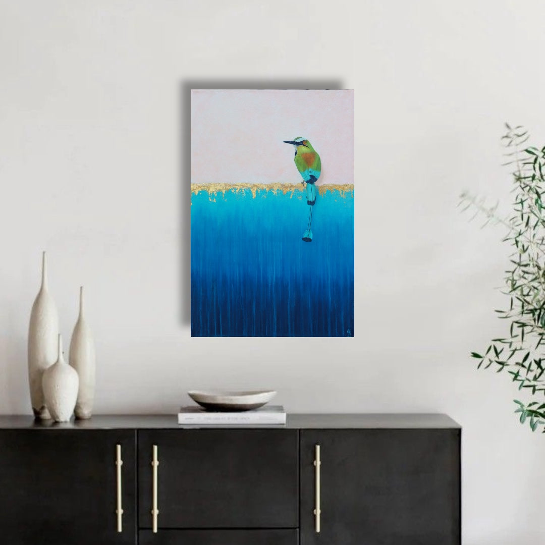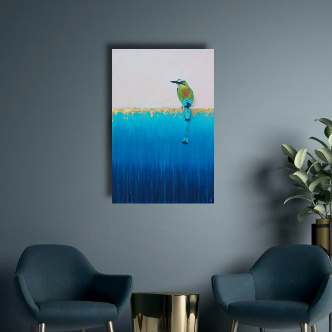 Tributo a las sagradas aguas cristalinas de los cenotes mayas, cuyas intensas tonalidades azules contrastan con la piedra caliza que los resguarda. En este hábitat único es el hogar del majestuoso pájaro Toh, un ave de la región maya, reconocida por su plumaje vibrante en verdes y turquesas, por el singular movimiento pendular de su cola, recibe el nombre de “Toh”, significa “reloj” en lengua maya.
