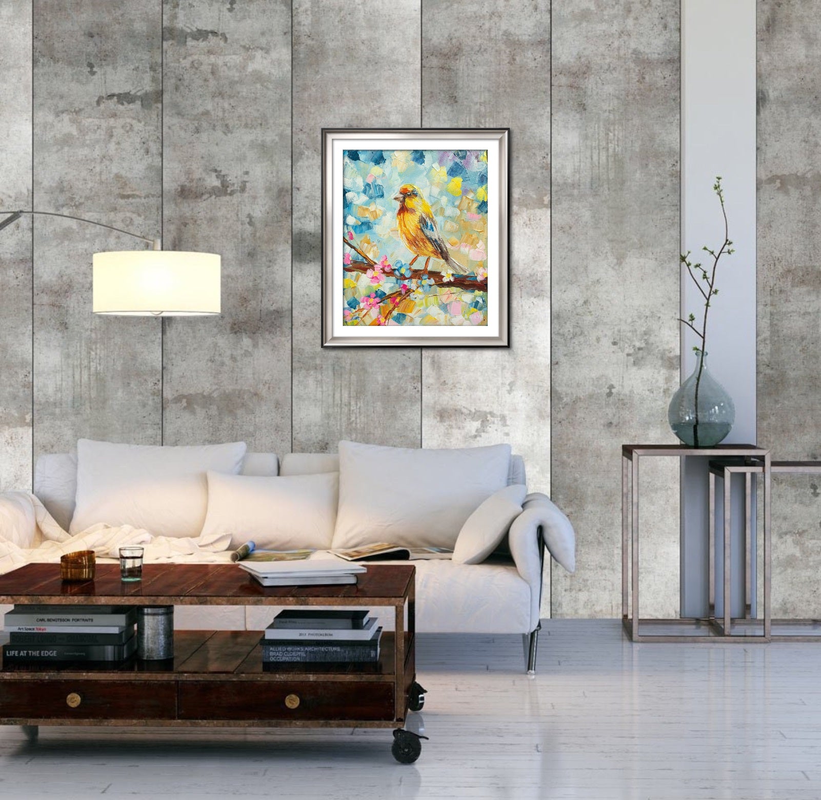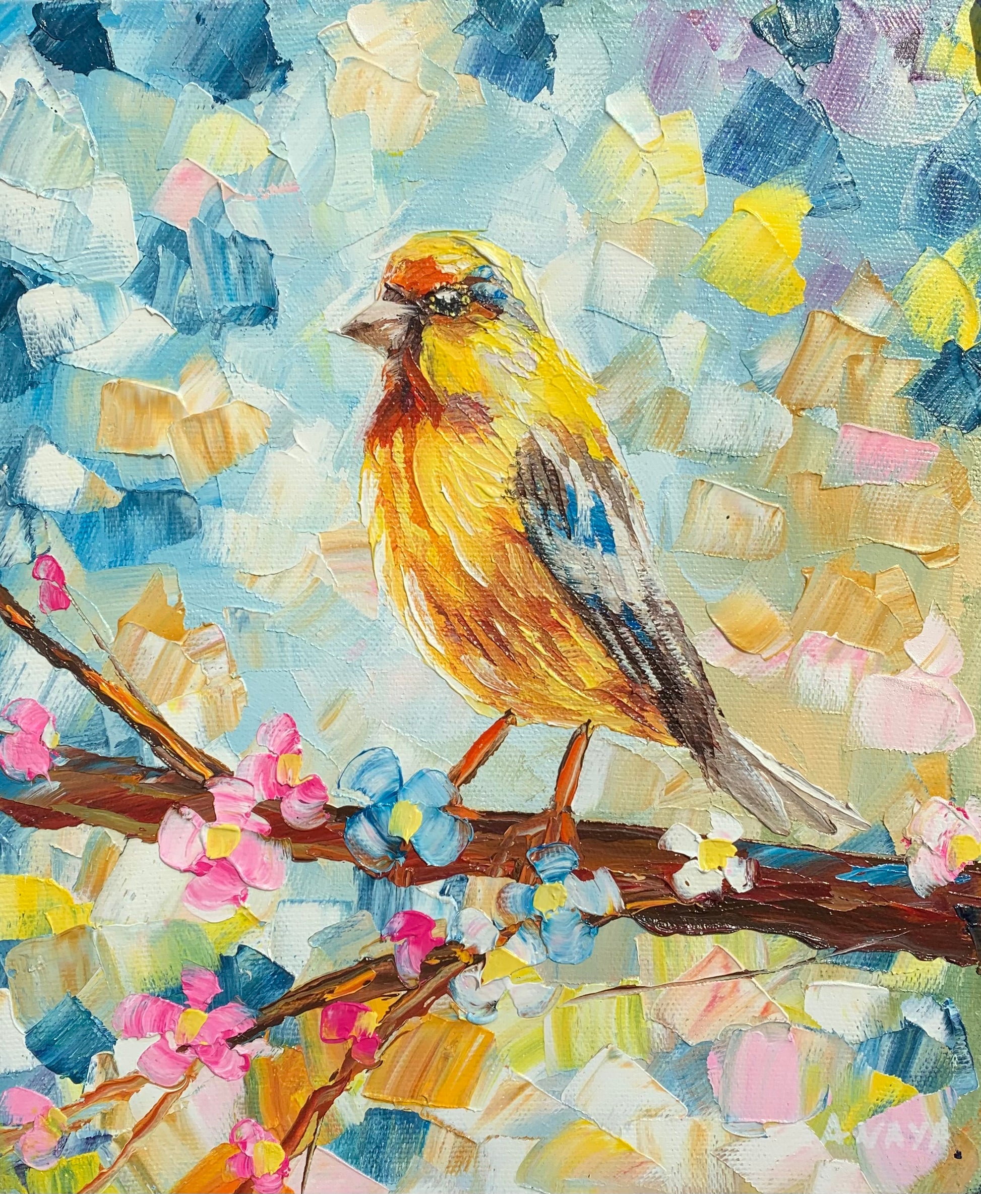 En esta serie de Pajaritos el artista quiere expresar el gran color y belleza del ave, transmitiéndolo con los colores y textura.