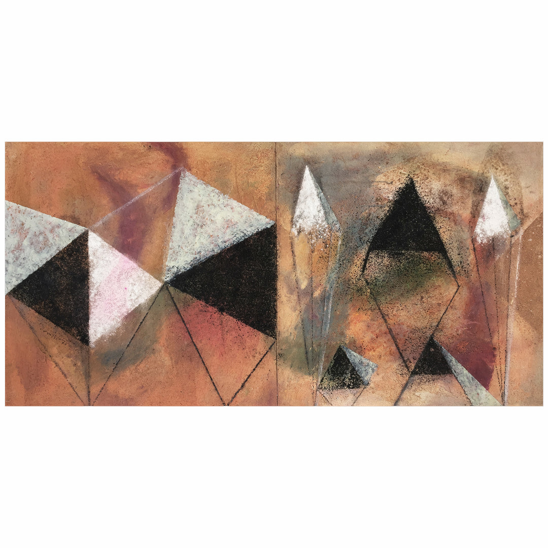 Esta obra forma parte de una serie de pinturas que contienen aspectos de carácter abstracto y simbólico, utilizando la dualidad y el equilibrio como eje principal. La asimetría como eje estético, un elemento para crear composiciones dinámicas usando formatos duales horizontales y verticales. El uso del color, tierras, carbón. ceniza, ceras, oleó, acrílico y pigmentos, materiales que contienen en si aspectos simbólicos, Formas geométricas que interactúan con ambientes orgánicos.
