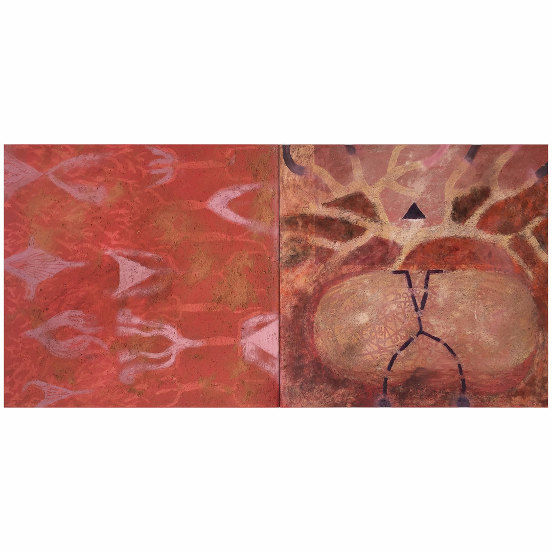 Esta obra forma parte de una serie de pinturas que contienen aspectos de carácter abstracto y simbólico, utilizando la dualidad y el equilibrio como eje principal. La asimetría como eje estético, un elemento para crear composiciones dinámicas usando formatos duales horizontales y verticales. El uso del color, tierras, carbón. ceniza, ceras, oleó, acrílico y pigmentos, materiales que contienen en si aspectos simbólicos, Formas geométricas que interactúan con ambientes orgánicos.