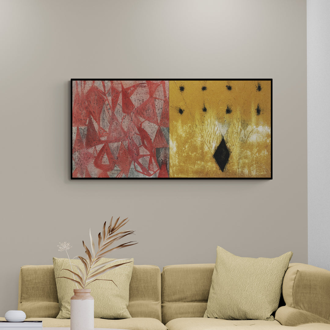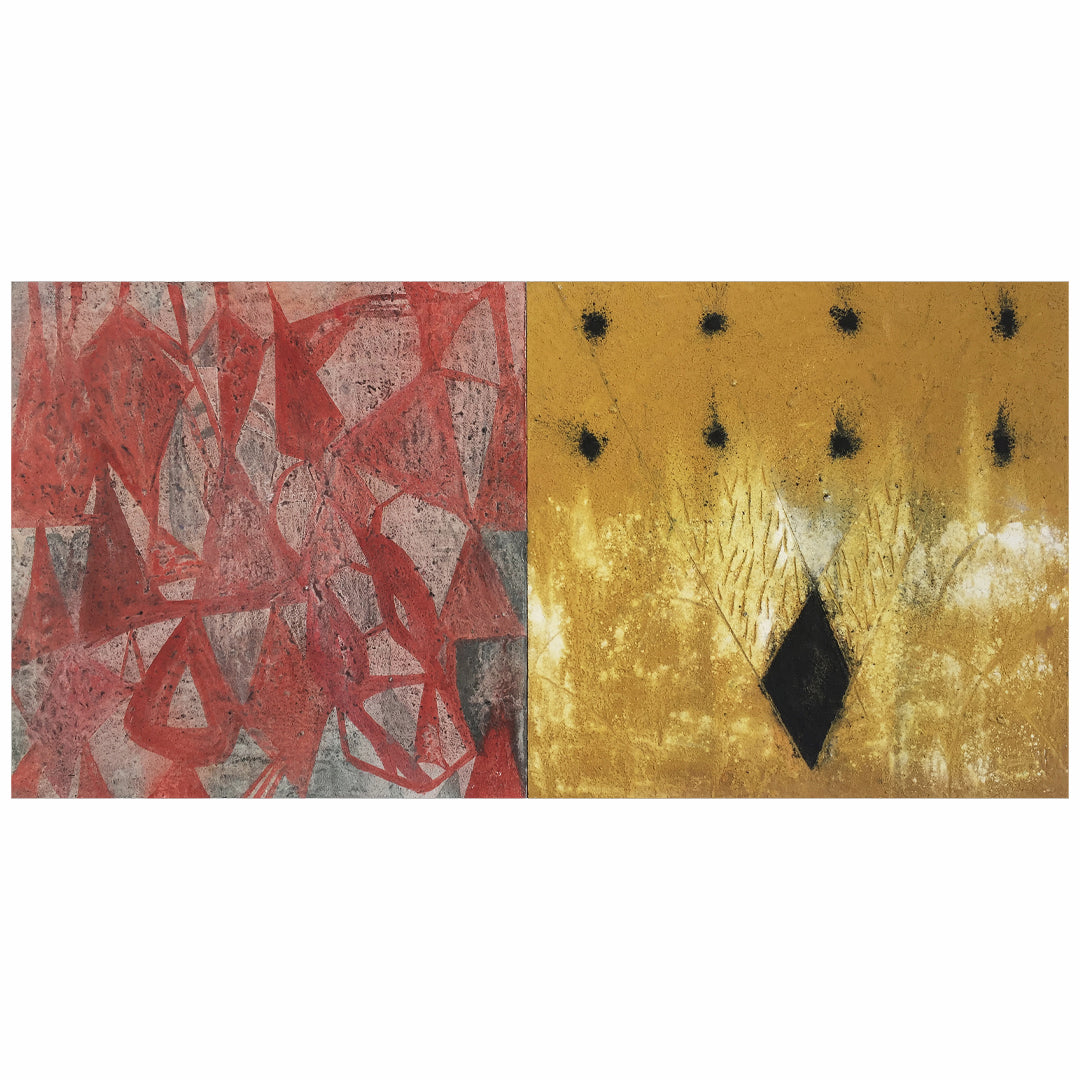 Esta obra forma parte de una serie de pinturas que contienen aspectos de carácter abstracto y simbólico, utilizando la dualidad y el equilibrio como eje principal. La asimetría como eje estético, un elemento para crear composiciones dinámicas usando formatos duales horizontales y verticales. El uso del color, tierras, carbón. ceniza, ceras, oleó, acrílico y pigmentos, materiales que contienen en si aspectos simbólicos, Formas geométricas que interactúan con ambientes orgánicos.