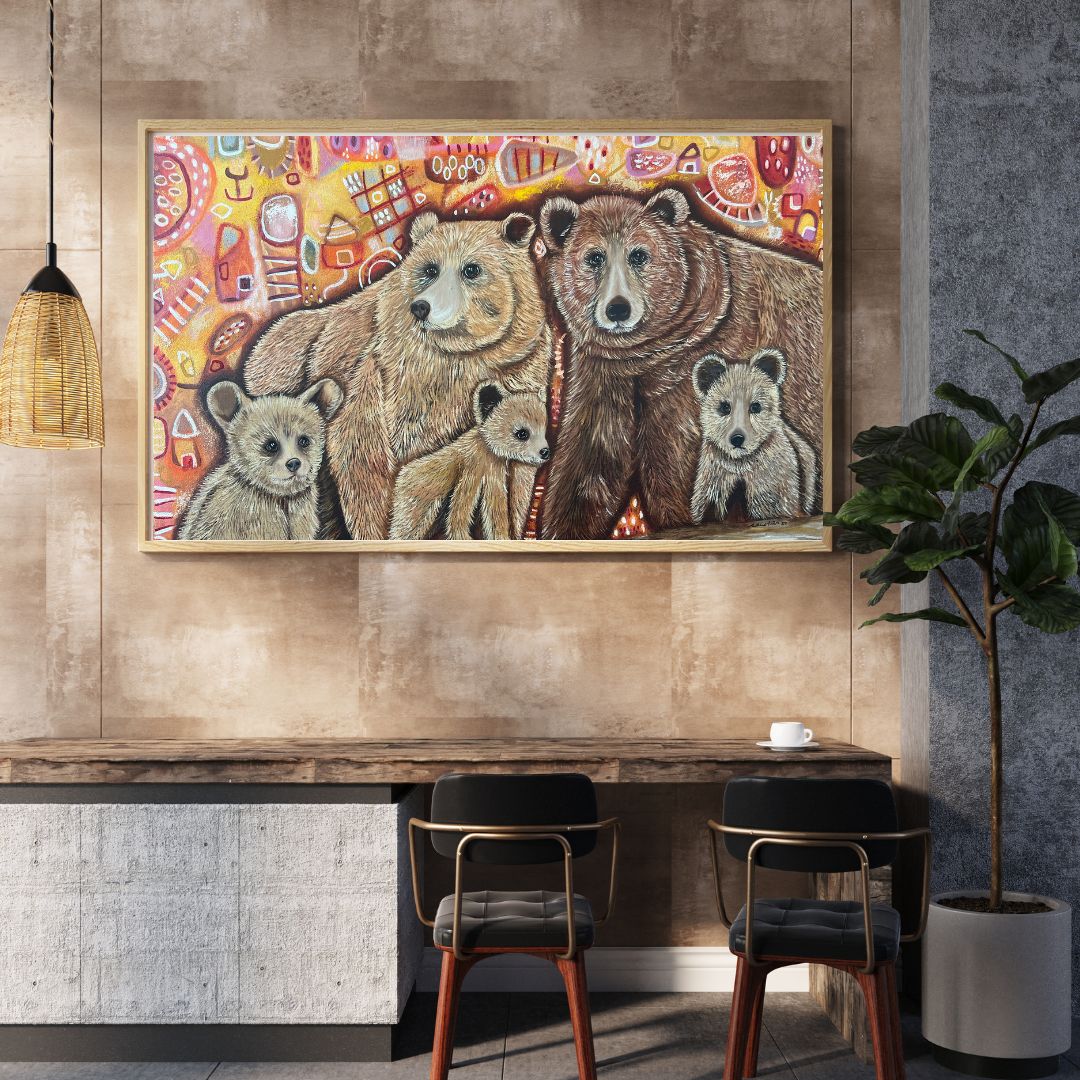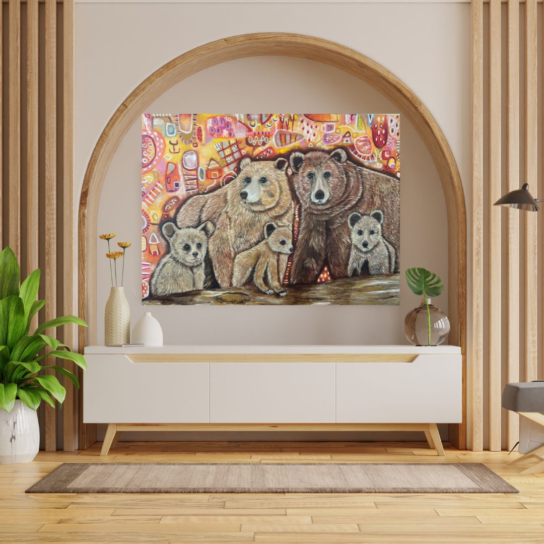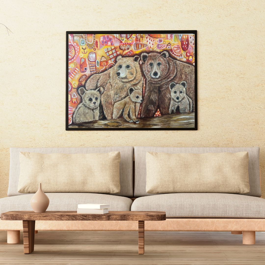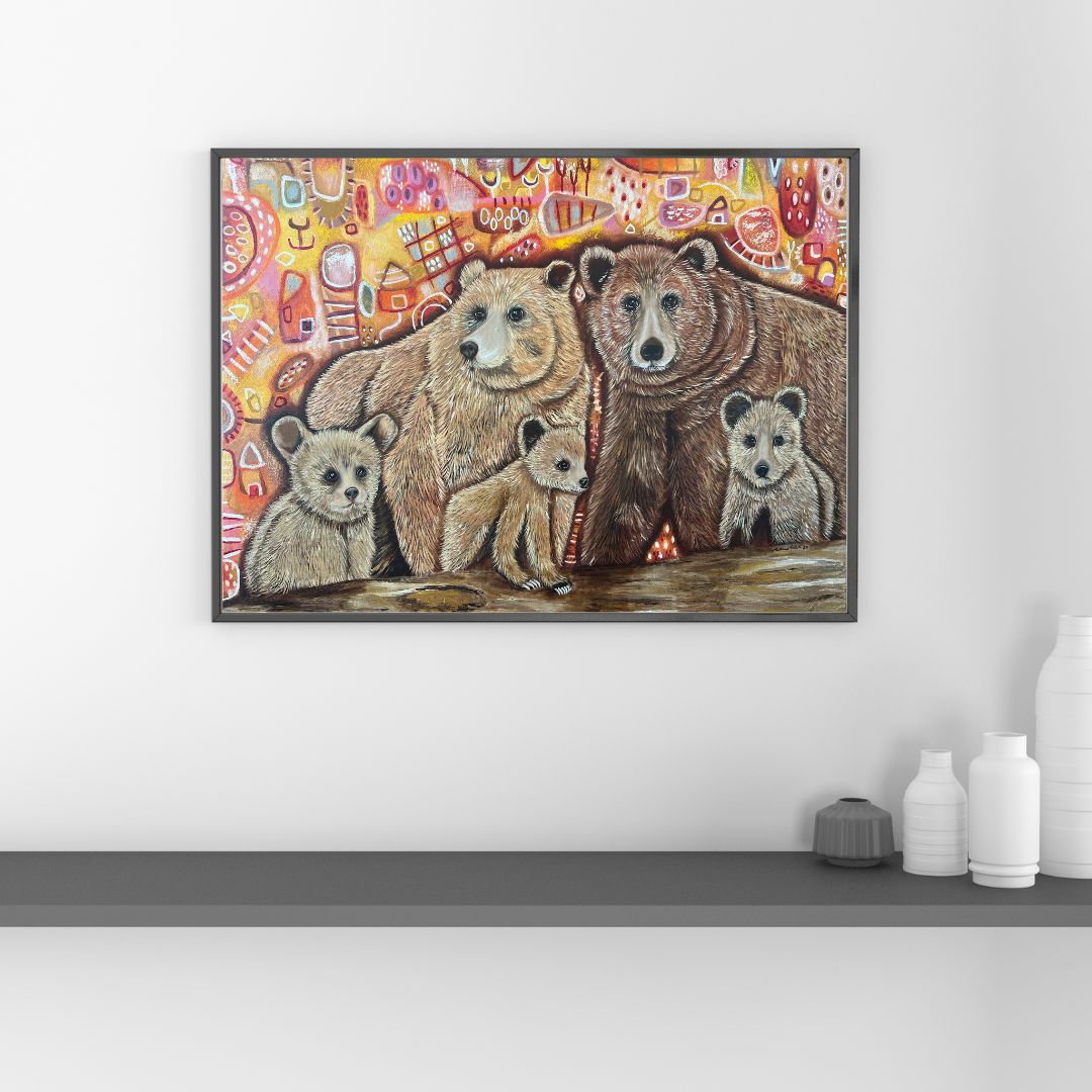 "Paseo de los Osos en el atardecer". La obra representa la unidad familiar, al disfrutar de un momento calido, en esta podrás encontrar variedad de colores y símbolos que se dejan a la interpretación del observador.