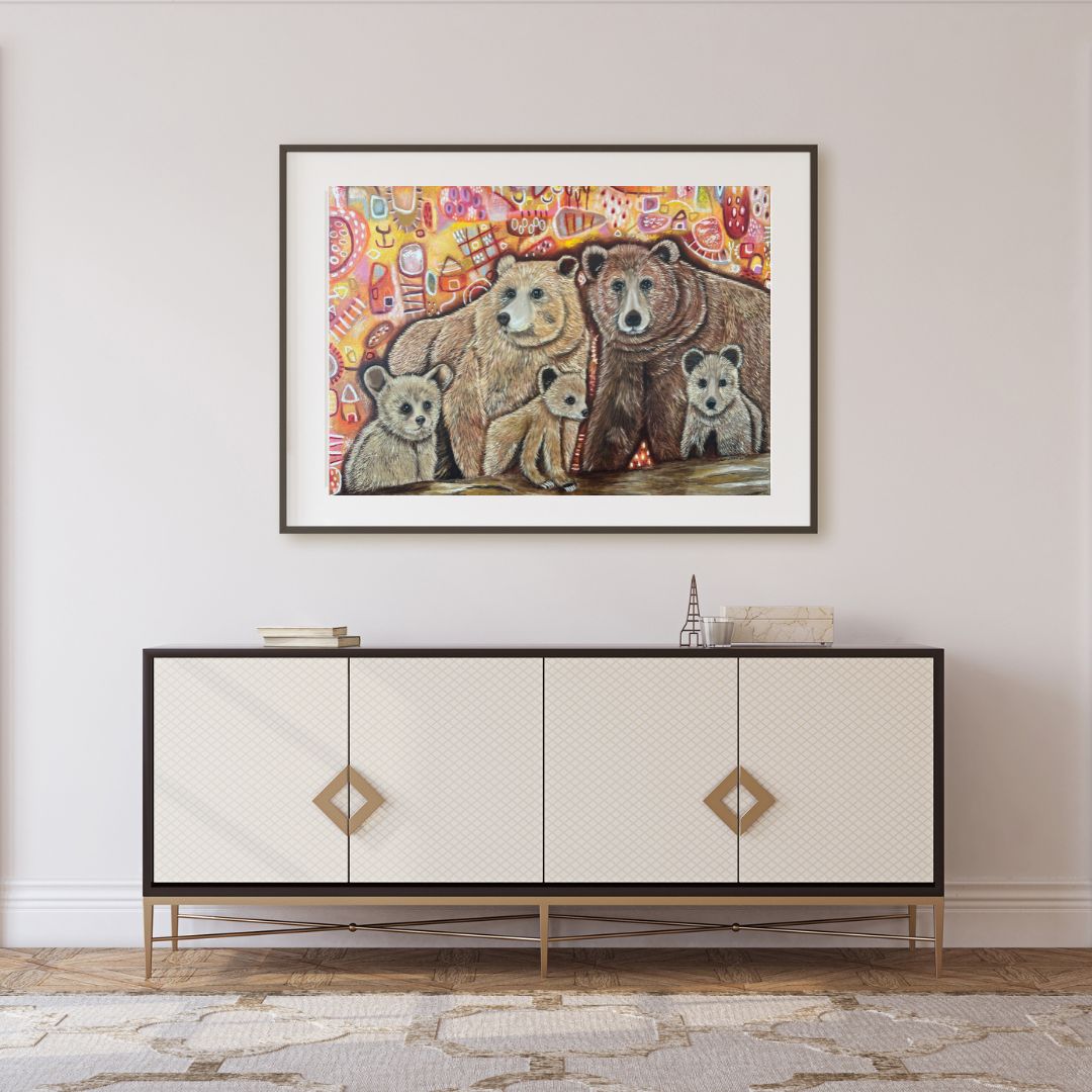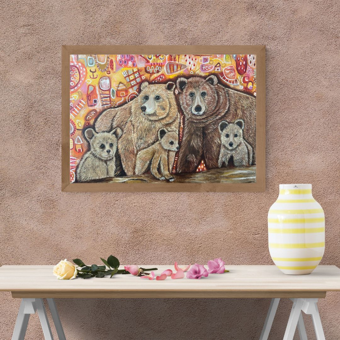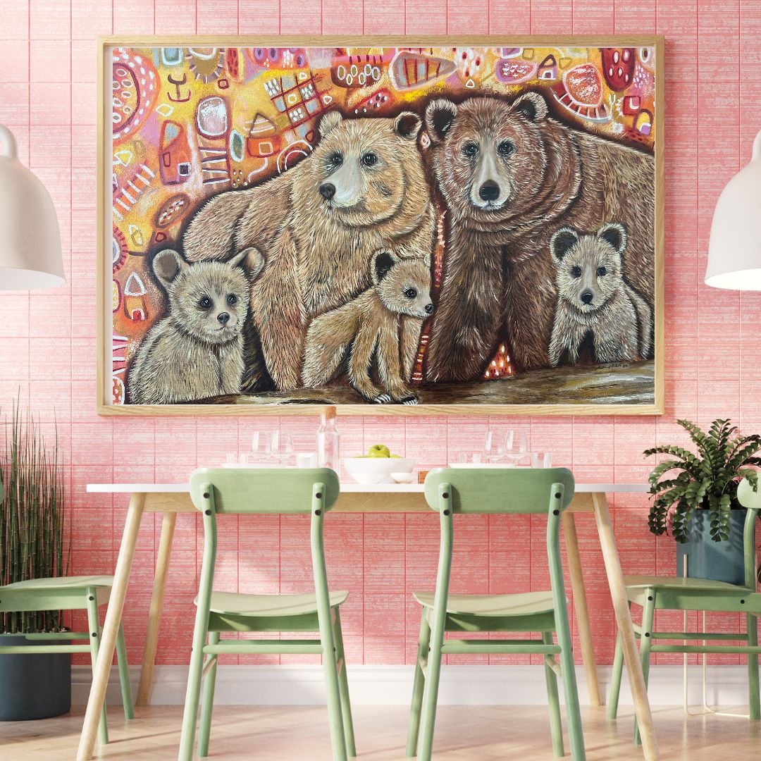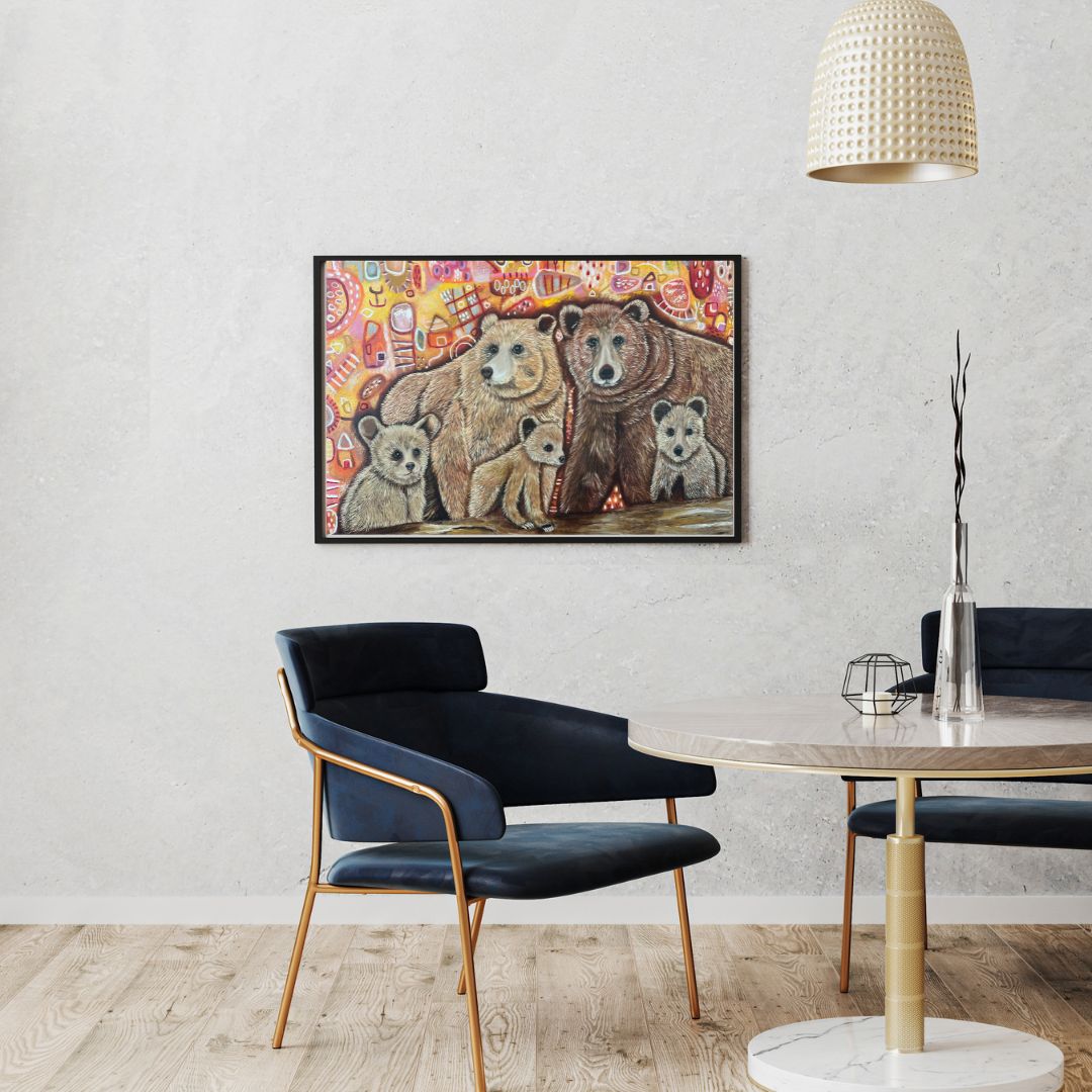 "Paseo de los Osos en el atardecer". La obra representa la unidad familiar, al disfrutar de un momento calido, en esta podrás encontrar variedad de colores y símbolos que se dejan a la interpretación del observador.