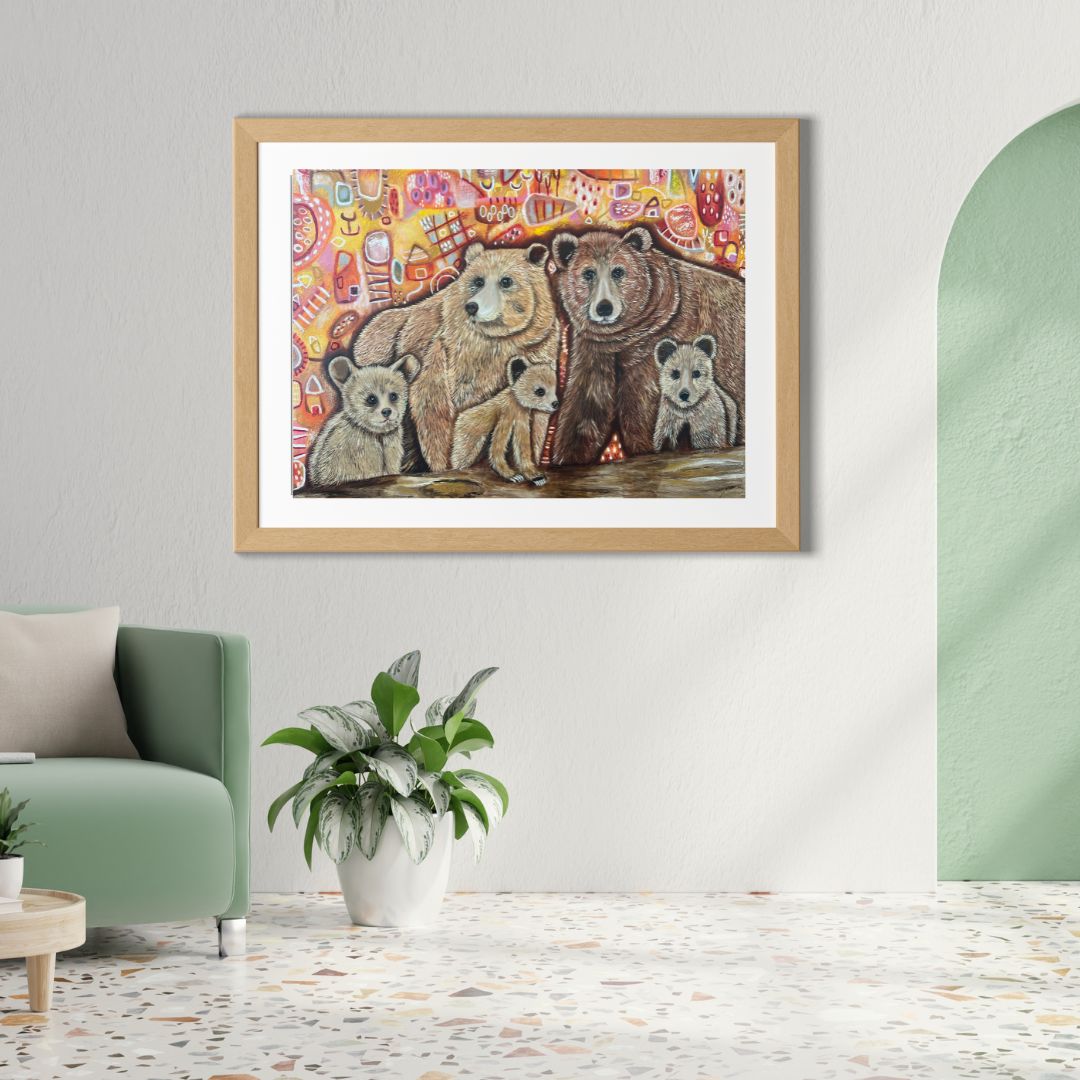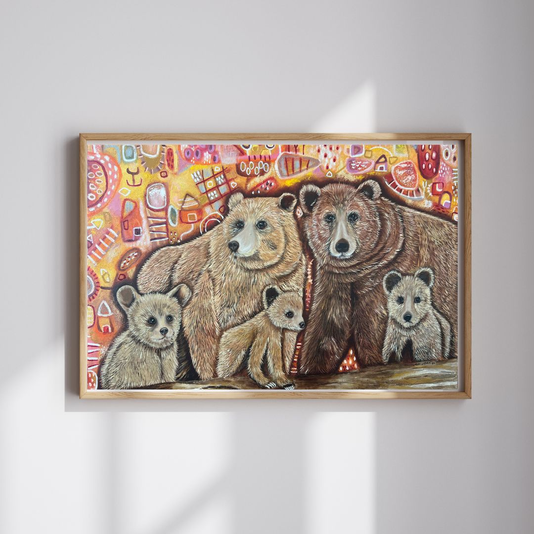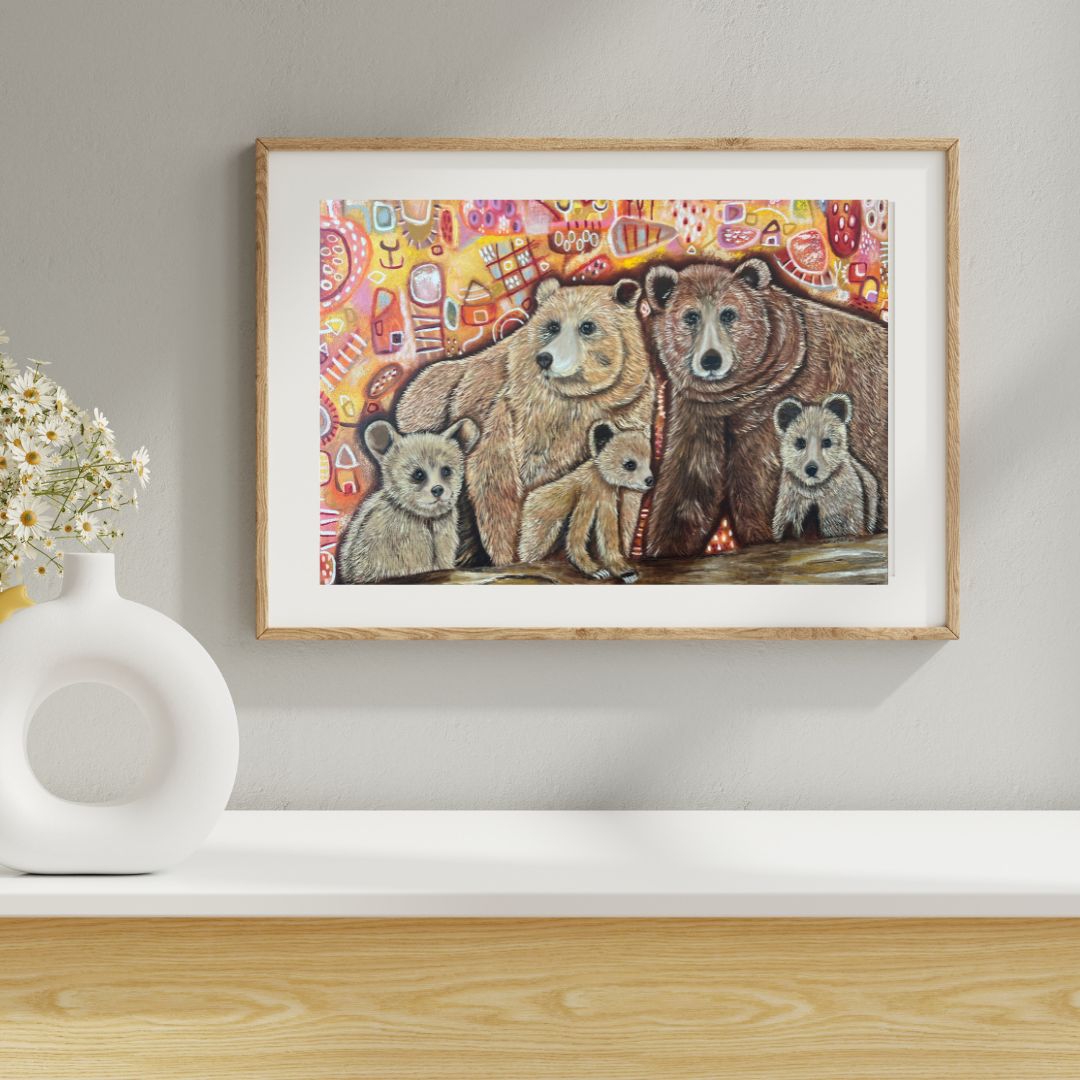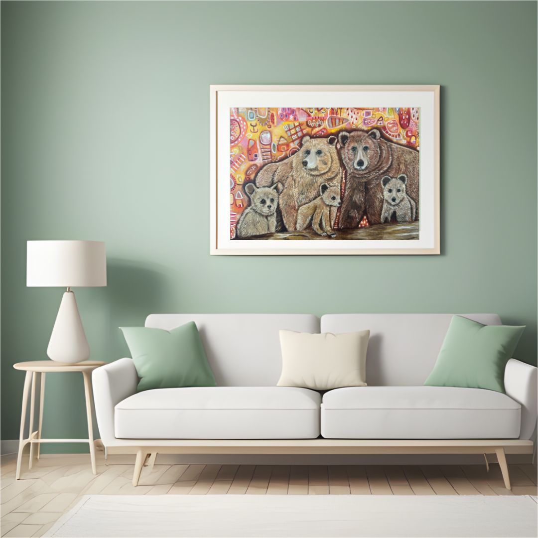 "Paseo de los Osos en el atardecer". La obra representa la unidad familiar, al disfrutar de un momento calido, en esta podrás encontrar variedad de colores y símbolos que se dejan a la interpretación del observador.