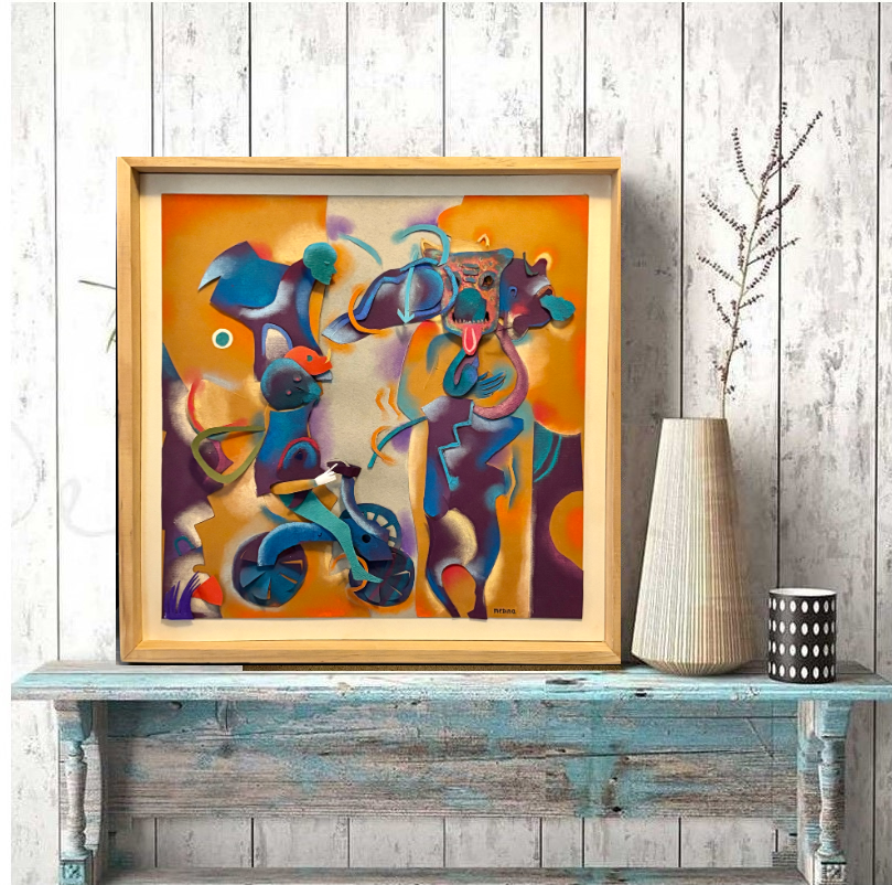 El cuadro titulado "Paseo en Domingo" es una vibrante pieza de arte figurativo elaborada con papel de colores. La obra captura una escena cotidiana llena de alegría y dinamismo, típicamente asociada con un día de descanso y esparcimiento.