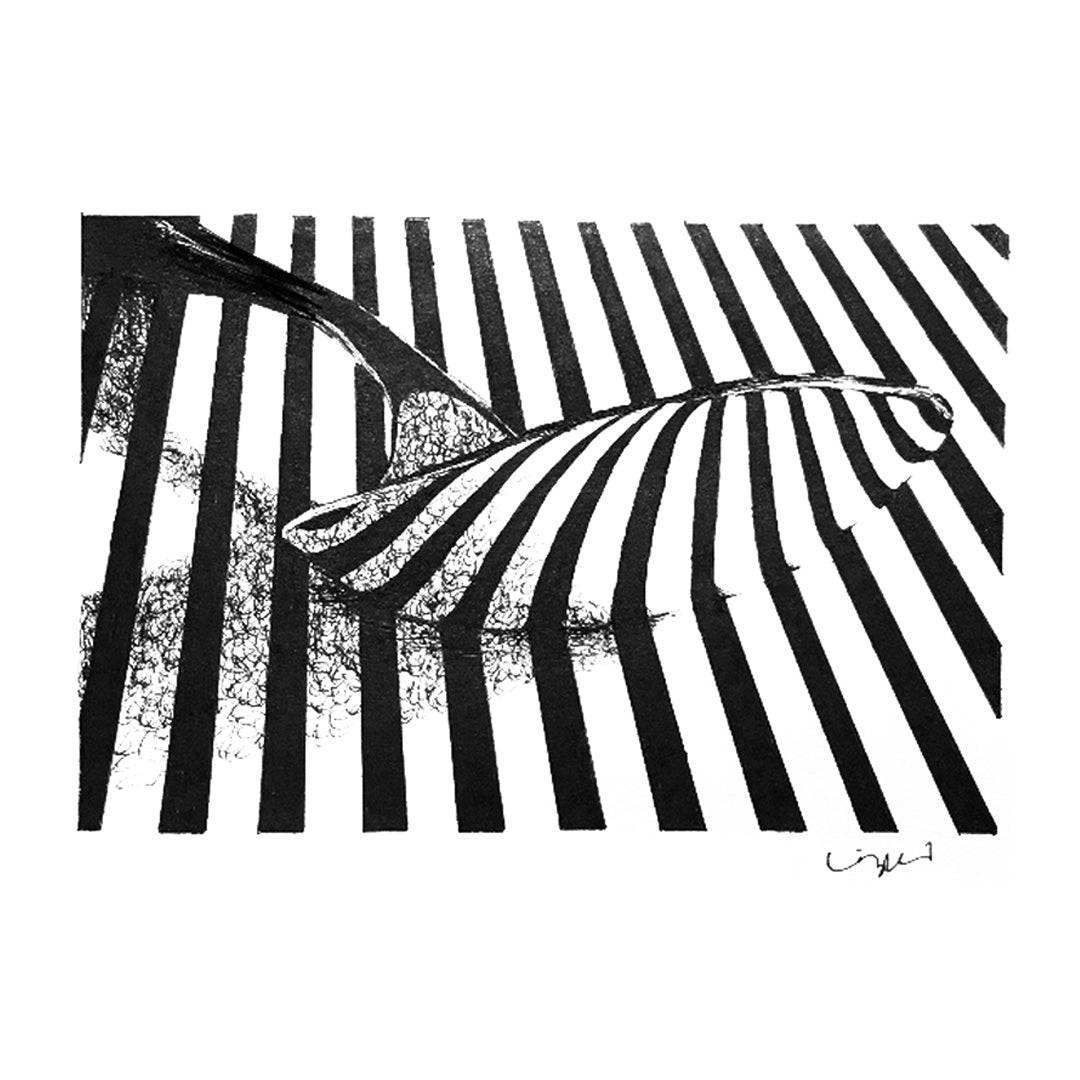 Ilustración realista del reflejo de un patrón en una cuchara de metal. Realizada con estilógrafos sobre papel. Lista para enmarcar.