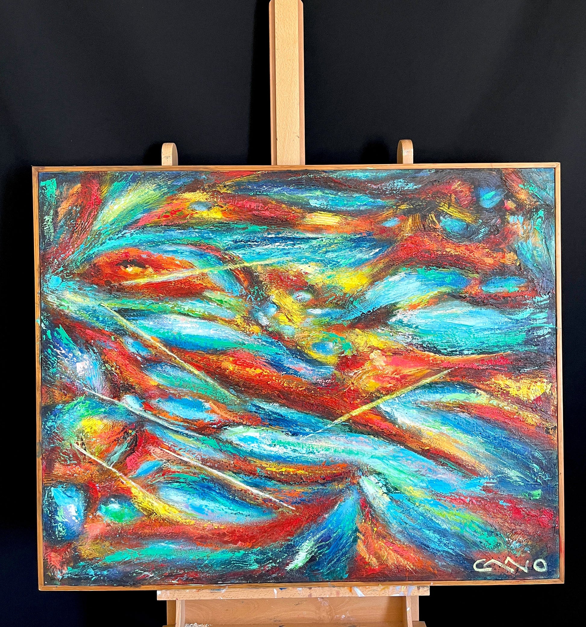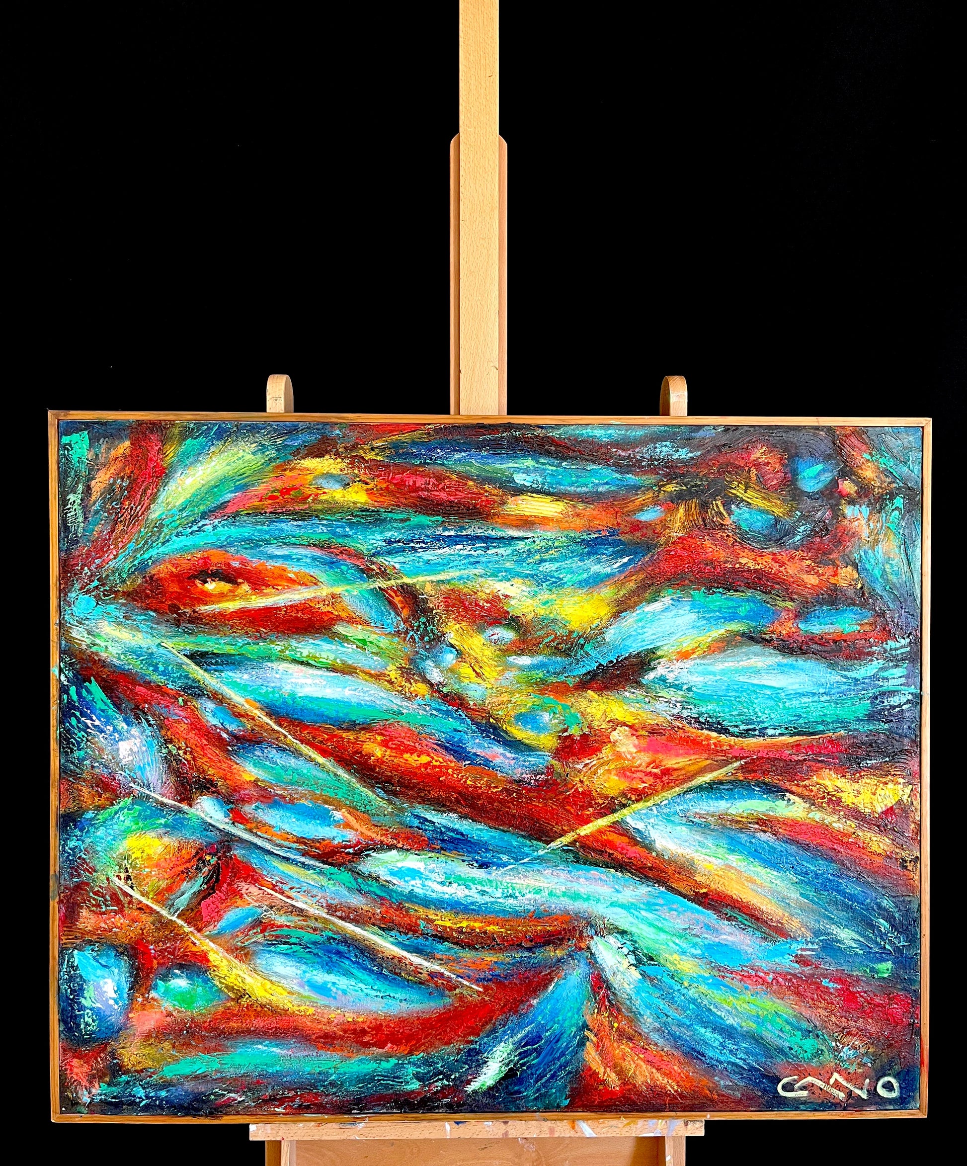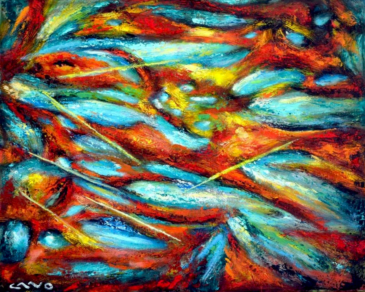 Peces, es rojos mares del amanecer, reconciliación con el mar, en ella mece la incertidumbre, con la luz del sol recurrente, el mar es la única promesa que se mantiene firme.