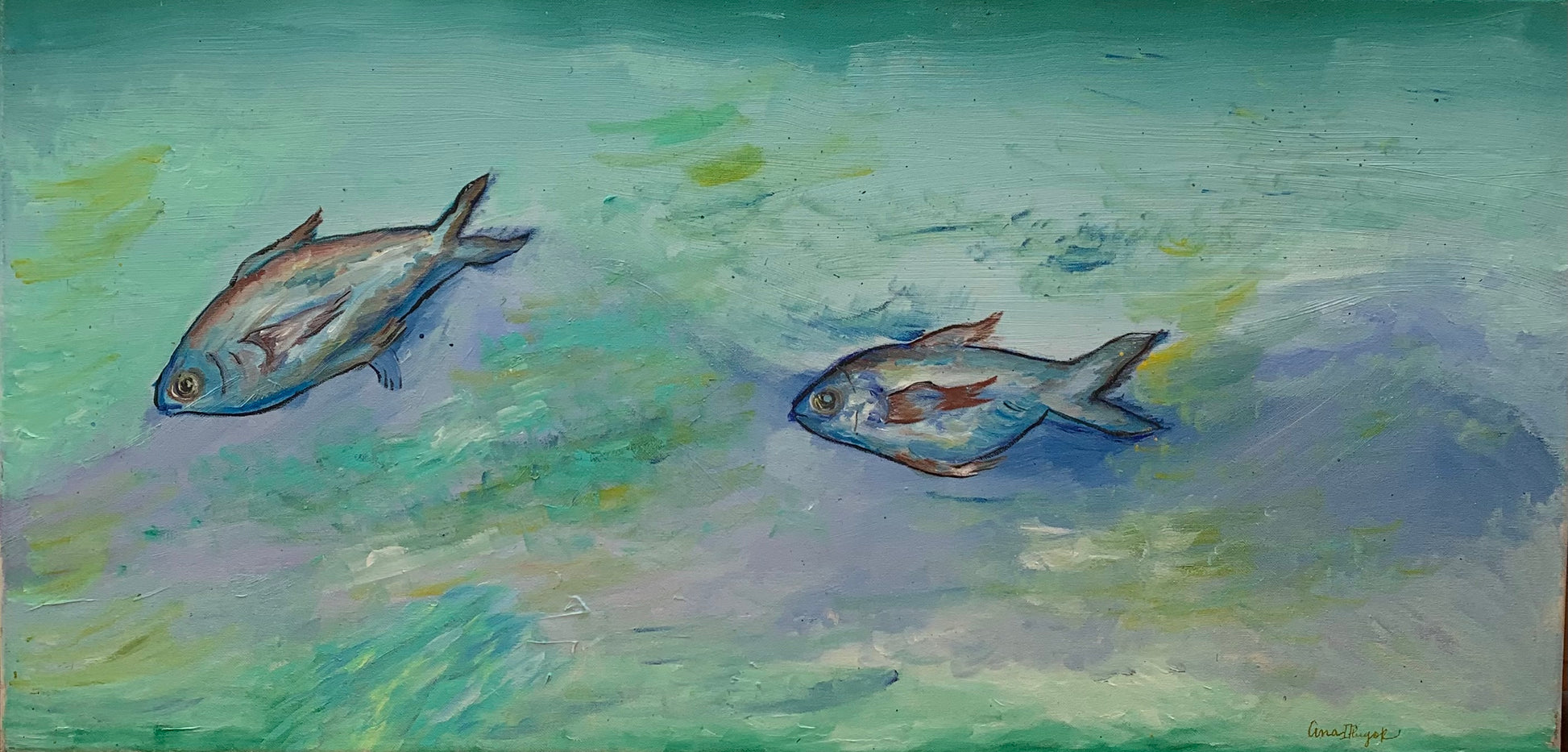 En el océano cerca de la fresca superficie nadan dos peces, dejando que el sol juegue con el oleaje. Esta obra nos recuerda la importancia del presente, y los peces de naturaleza libre e indómita, la afirmación de la libertad.