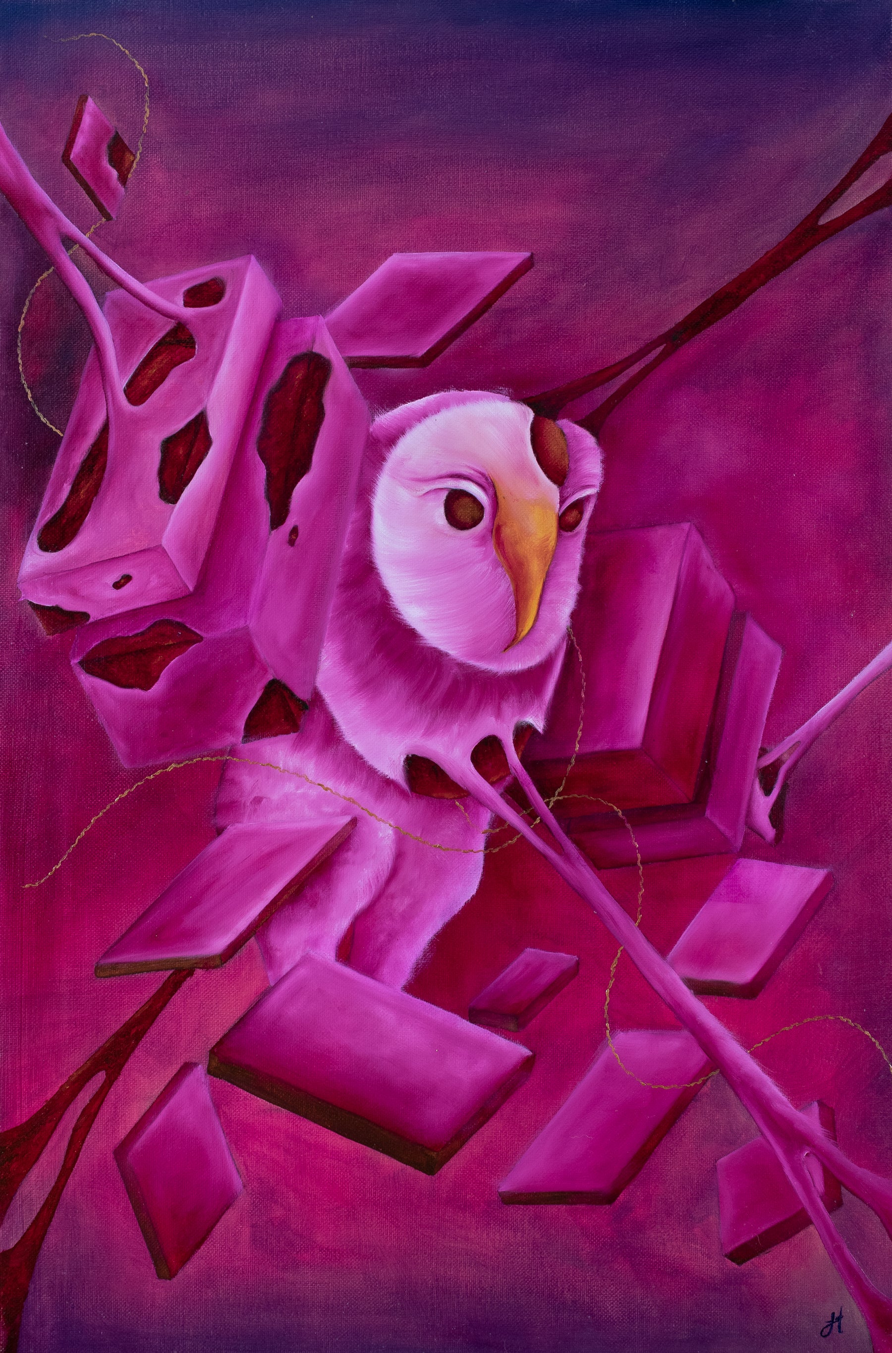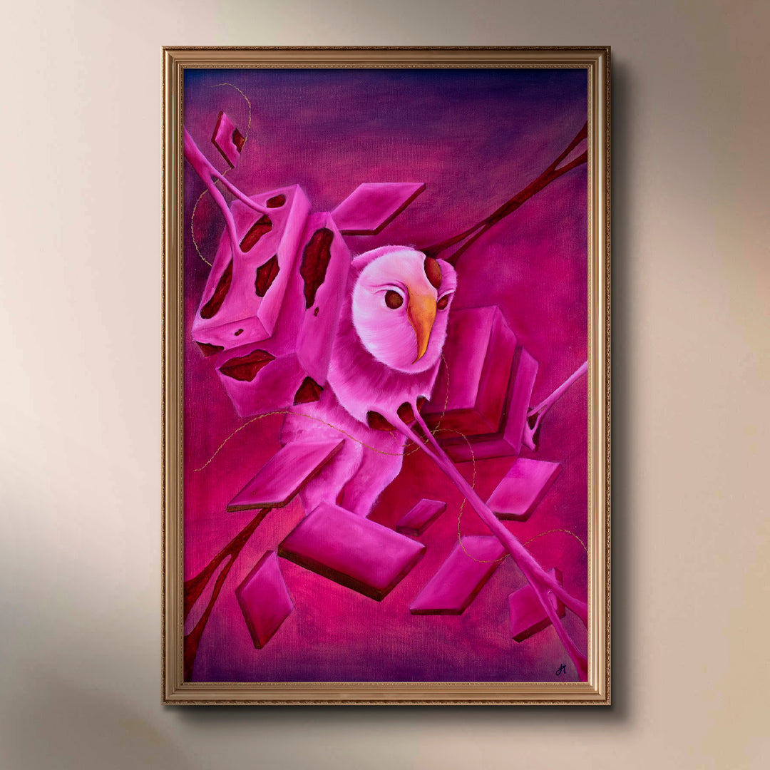 Aves cubiertas en tonos de carne madura, sangre diluida y polvo rosado. No cantan, no vuelan, solo observan, habitan un espacio suspendido entre lo hermoso y lo nostálgico, entre lo que alguna vez fue vivo y lo que ya no puede escapar.