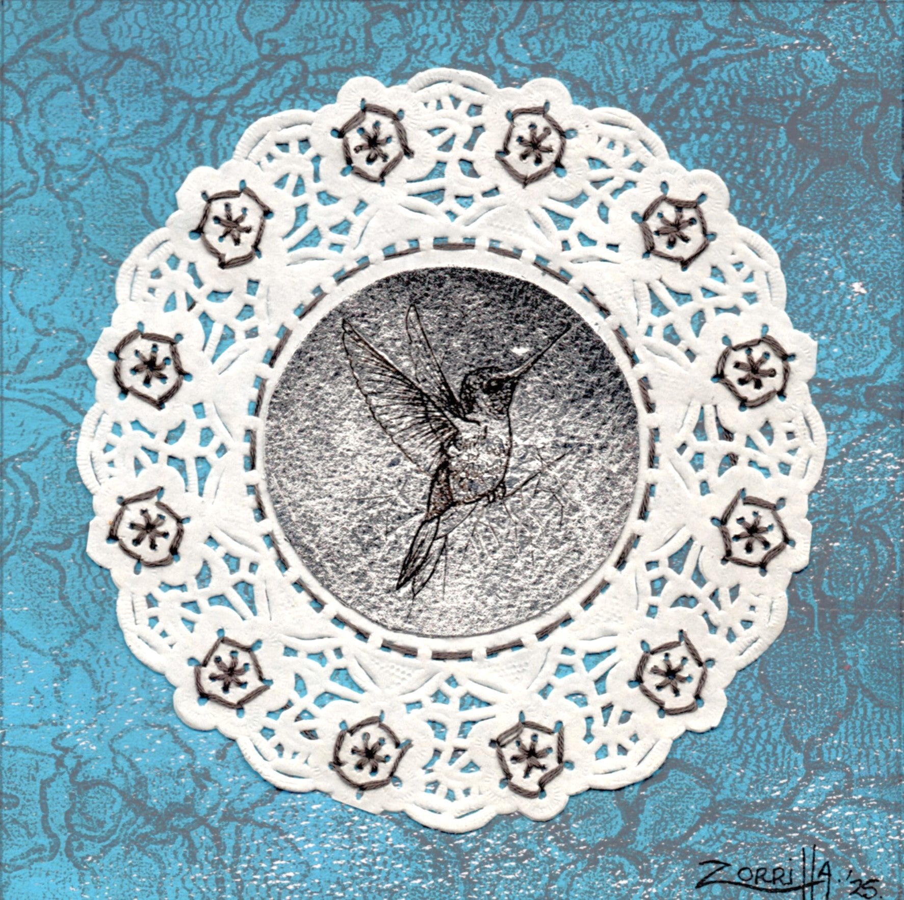 En el centro de la obra flota un hermoso colibrí dibujado a mano con tinta sobre papel algodón cubierto de hoja de plata, el cual está rodeado de una carpetita de papel blanco bordada con hilo de algodón en color gris. Este a su vez descansa sobre un fondo color azul estampado con encaje color gris.