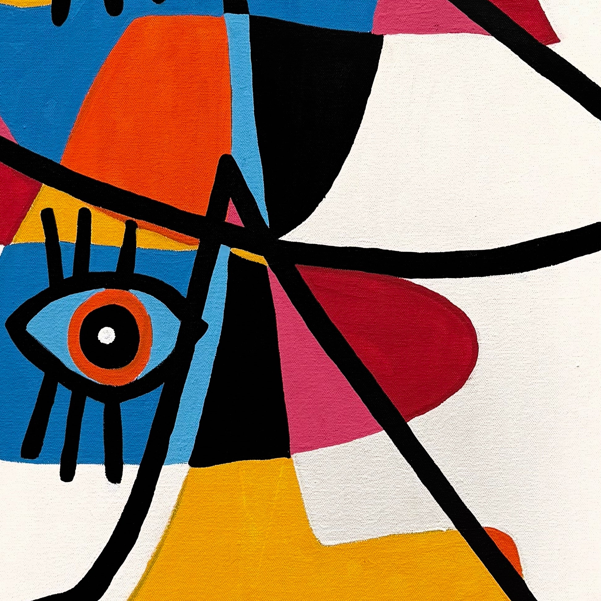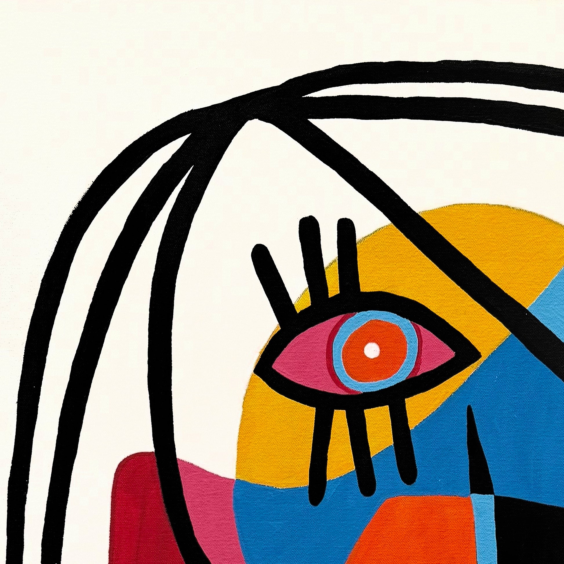 Los ojos, representados de manera sintética, funcionan como centros de atención dentro de la figura, aportando una dimensión gráfica que refuerza la presencia del personaje. Este recurso visual fortalece el carácter simbólico y directo de la obra, manteniendo una lectura abierta y contemporánea.