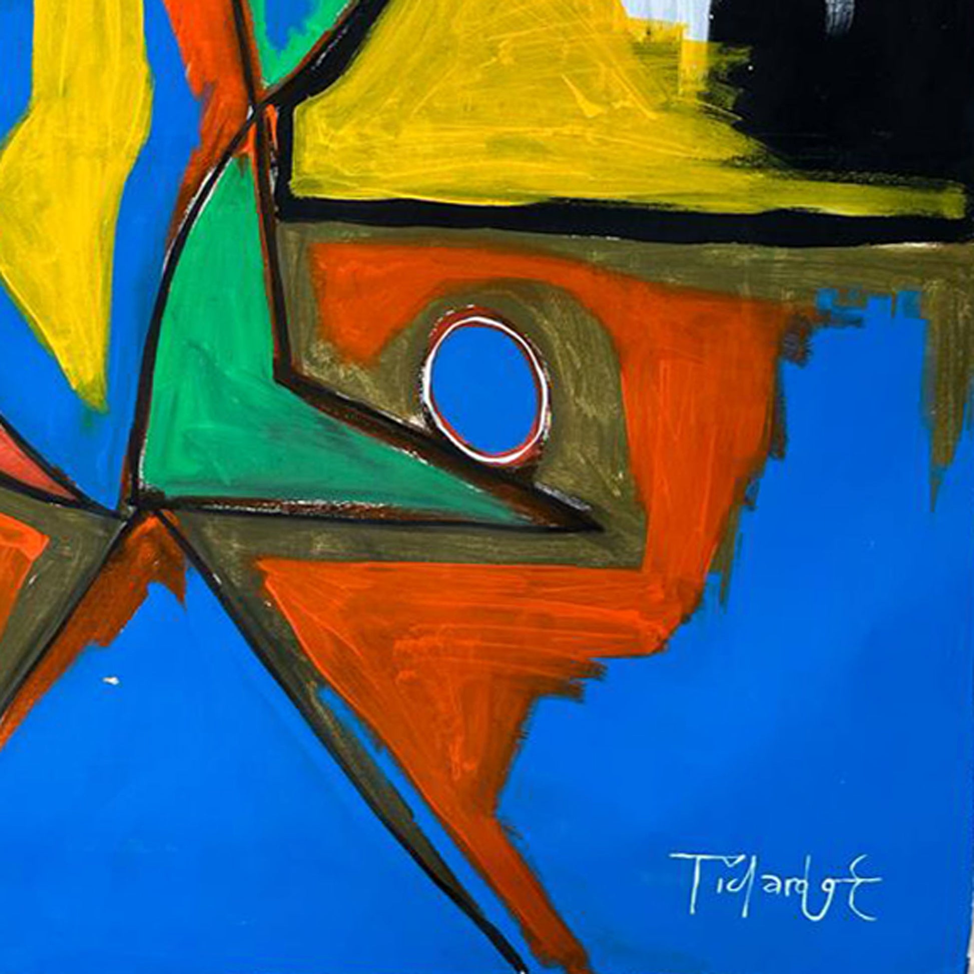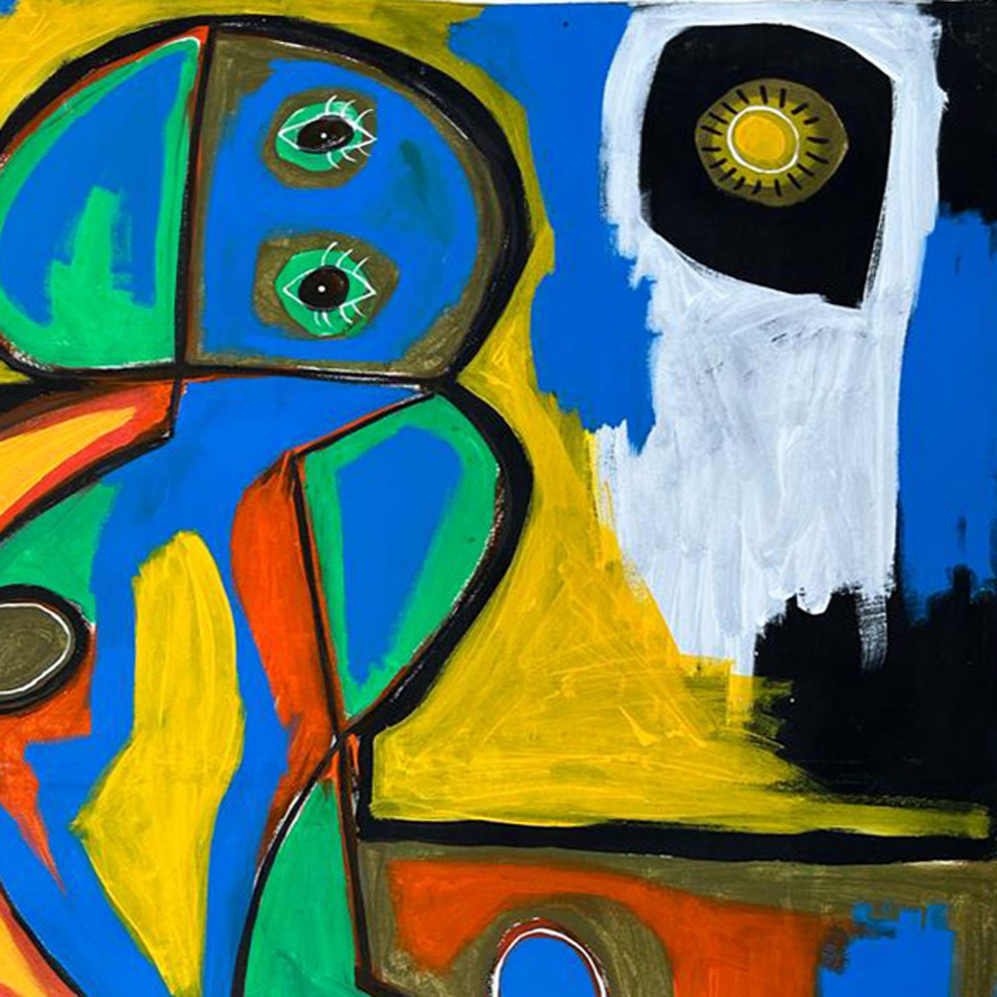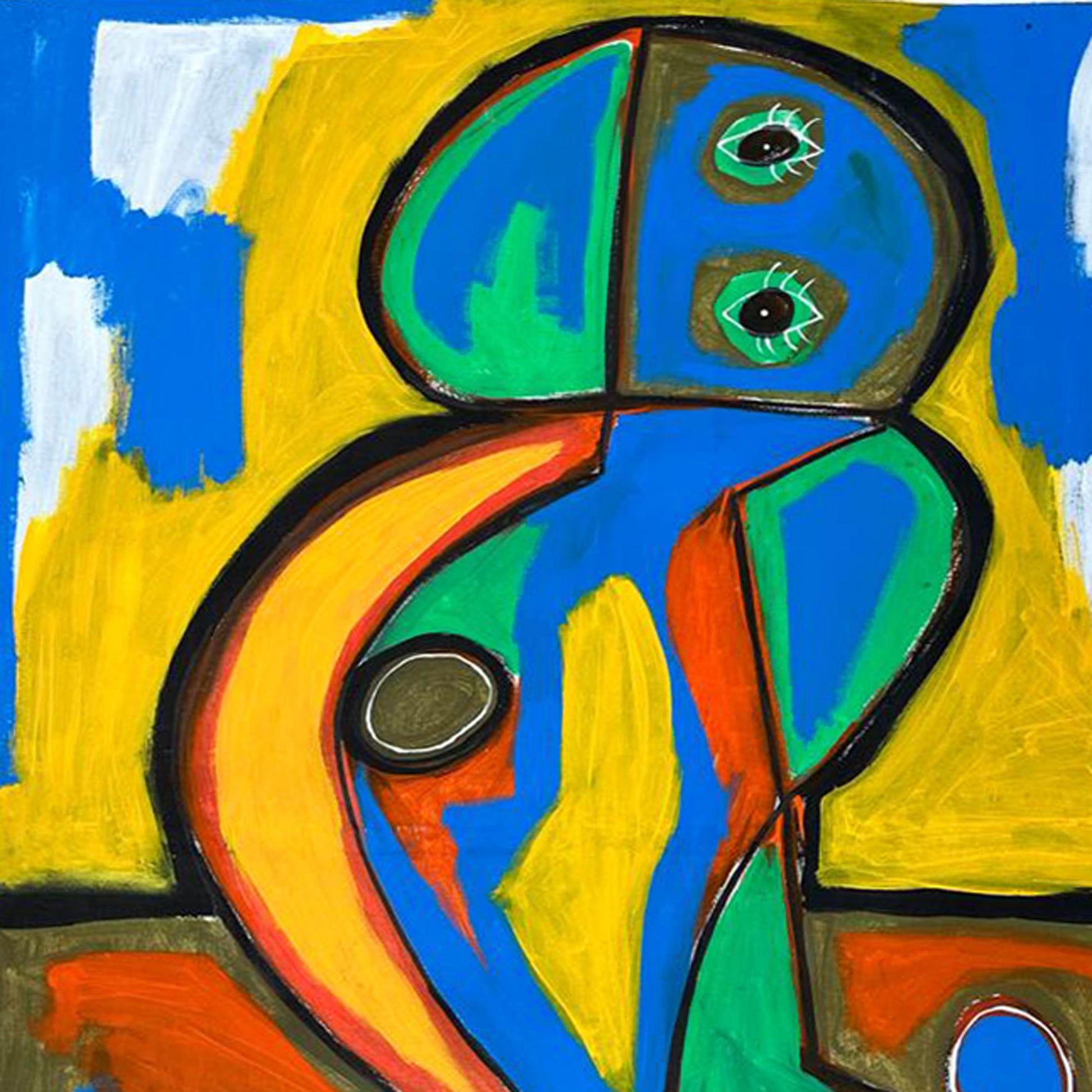 La figura se sitúa de pie sobre un terreno rojizo y azul, delineado por formas geométricas que aportan equilibrio a la escena. Las líneas gruesas en negro articulan cada segmento, guiando la mirada a través del cuerpo y sus volúmenes. El contraste entre colores primarios, planos definidos y contornos fluidos construye una estructura visual sólida, cercana a la estética de artistas como Joan Miró y Karel Appel, con quienes la obra comparte un espíritu lúdico y expresivo.