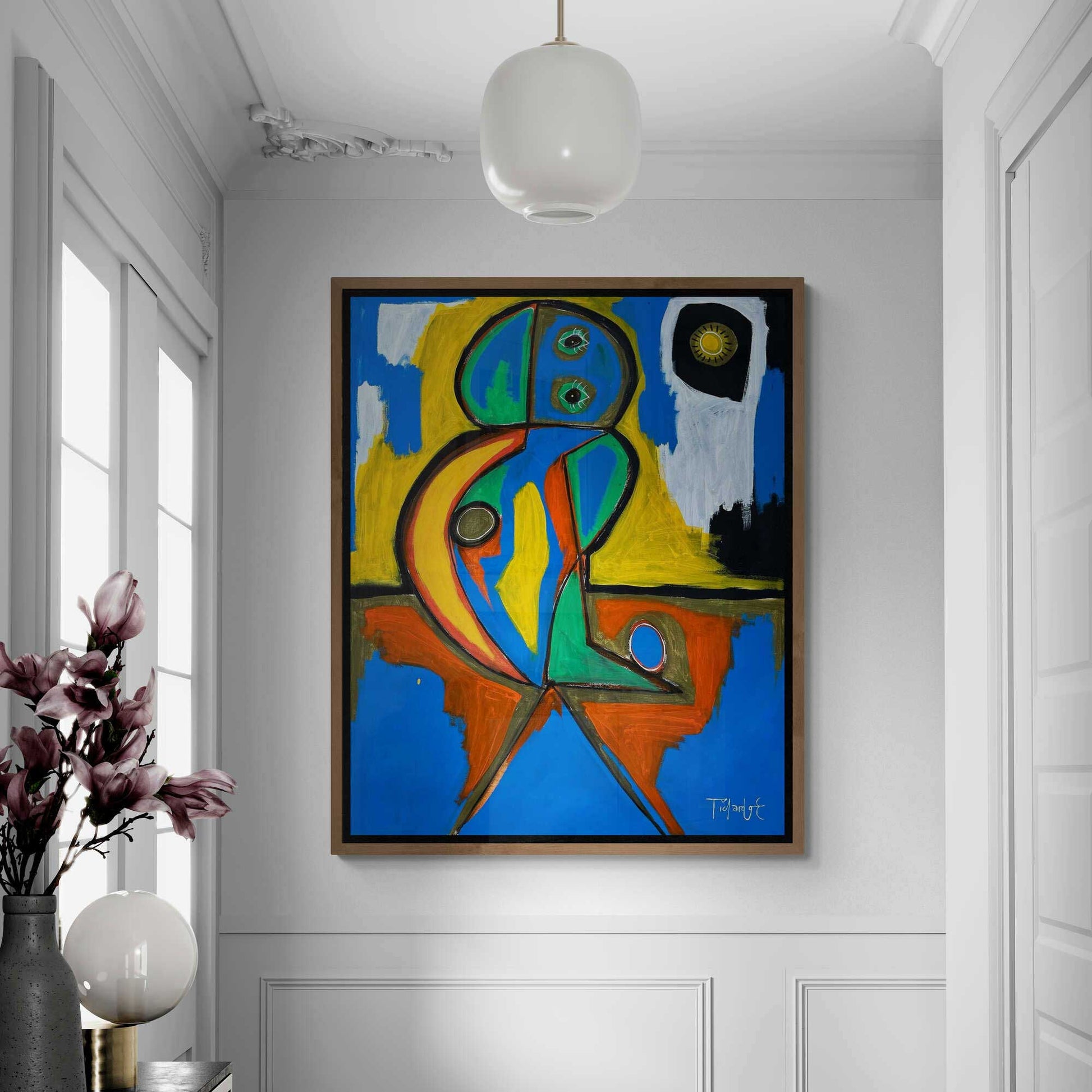 Los tonos cálidos y fríos alternan de manera rítmica, generando tensión y armonía dentro de la figura. Los azules dominan la base mientras los amarillos y naranjas introducen calor, creando un diálogo entre estabilidad y dinamismo. La presencia del sol en la esquina superior derecha refuerza la atmósfera del paisaje, añadiendo un punto focal que equilibra la composición. El uso del color plano, la simplicidad deliberada y la contundencia de las líneas remiten a la tradición del expresionismo figurativo dentro del arte contemporáneo.