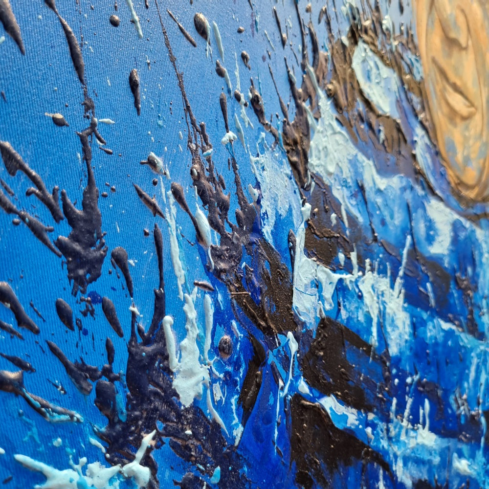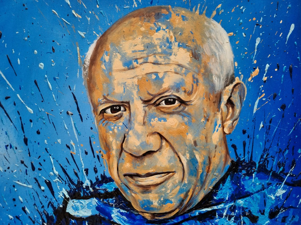 Una pintura irrepetible que captura la esencia de Pablo Picasso, con un fondo azul vibrante y una técnica llena de energía y movimiento, como su vida!!!