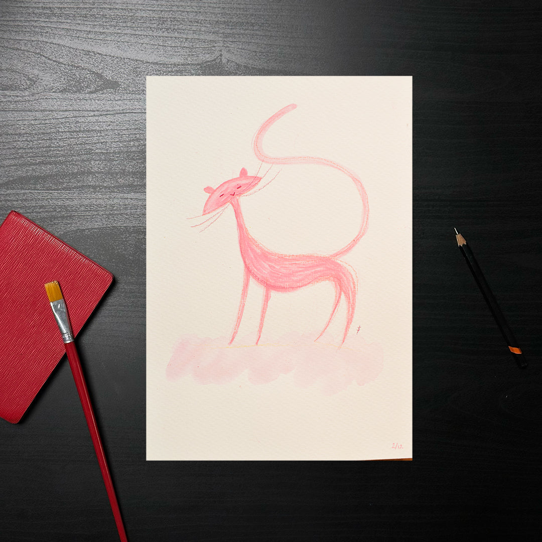 Disfruta del placer artístico con esta obra. Inspirado en la Pantera Rosa, su estilo de vida es transformado en una obra del pop art. Cada pieza es un boceto de un estilo de vida tentador, interpretado en papel para una suculenta experiencia.