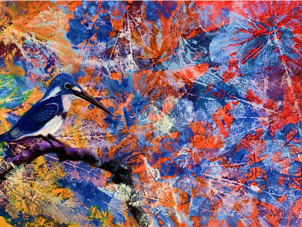 Lo que motiva esta serie es la amalgama entre la impresión colorida de hojas frescas y la transferencia de imágenes de aves; con lo que pretendo reproducir la magia de la naturaleza en el papel o el lienzo y trasladarla a la mirada de quien decida tener a su alcance cotidiano un pedacito de realidad.