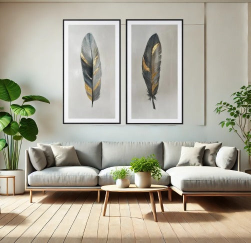Un conjunto que captura la delicadeza y elegancia de las plumas, realzadas por sutiles detalles dorados que evocan pureza, ligereza y un toque celestial.