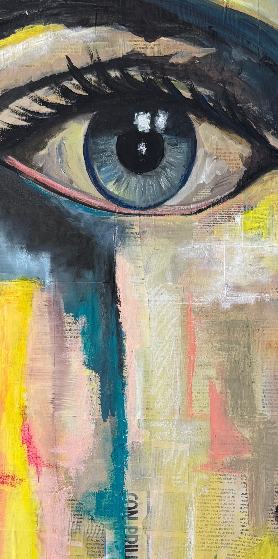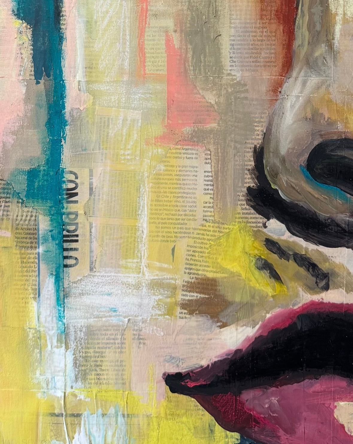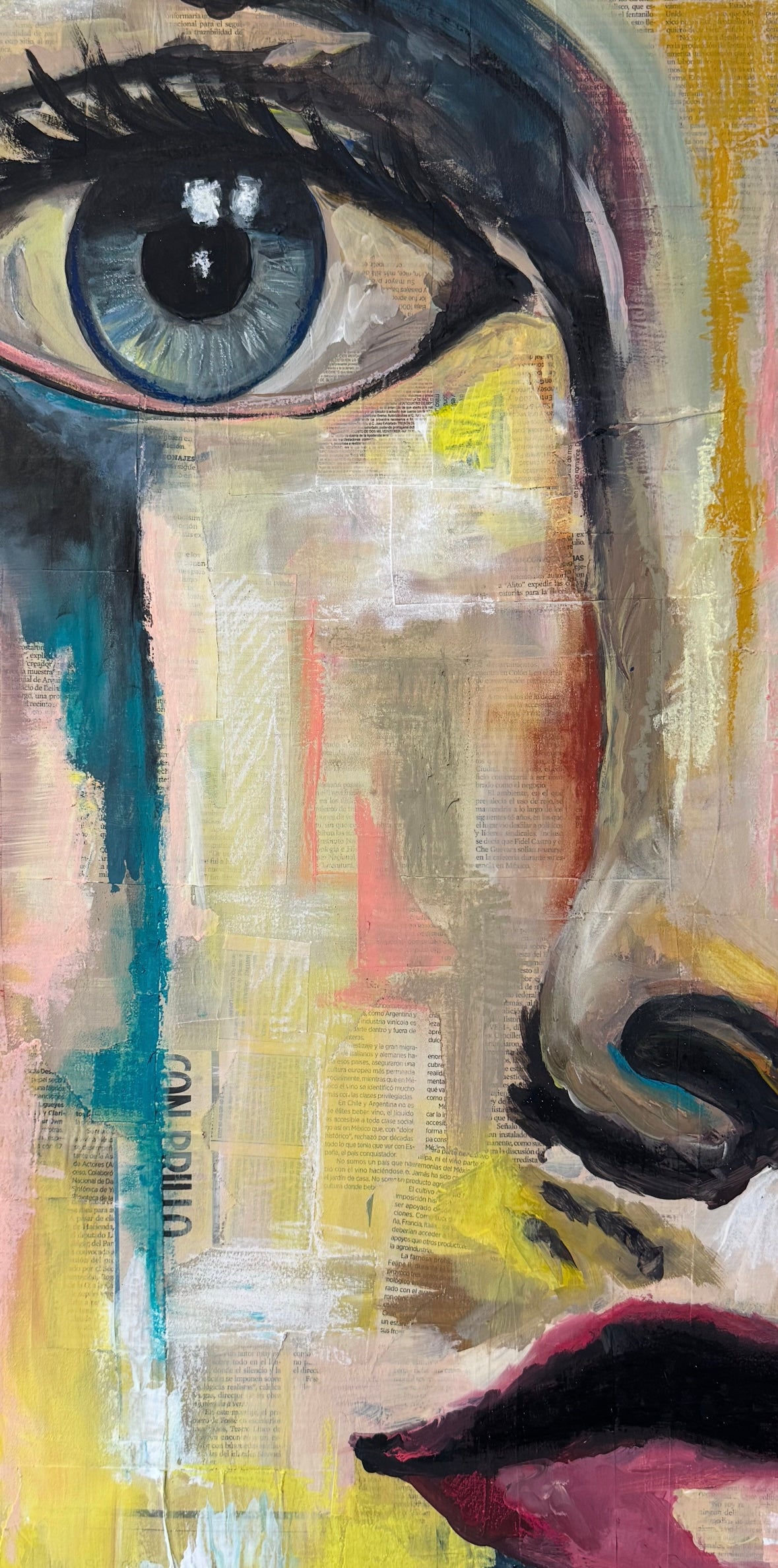 El rostro fragmentado y el ojo en primer plano evocan la idea de mostrarse sin máscaras. La obra es un homenaje a la autenticidad, al valor de habitar lo propio con fuerza y sensibilidad. El trazo y la textura transmiten la huella del instante, como un espejo de lo humano e imperfecto. Por otro lado, la mirada en primer plano se transforma en un símbolo de verdad y transparencia. Aquí la materia pictórica y los trazos gestuales se mezclan con el collage, reforzando la idea de identidad múltiple. La obra es un recordatorio de habitar la vulnerabilidad como un acto de fuerza.