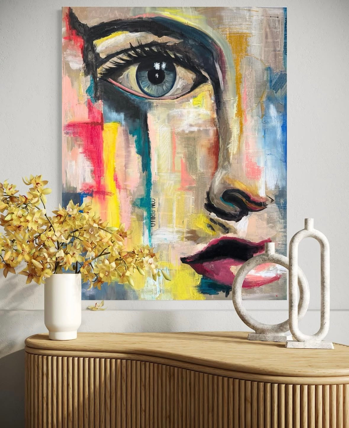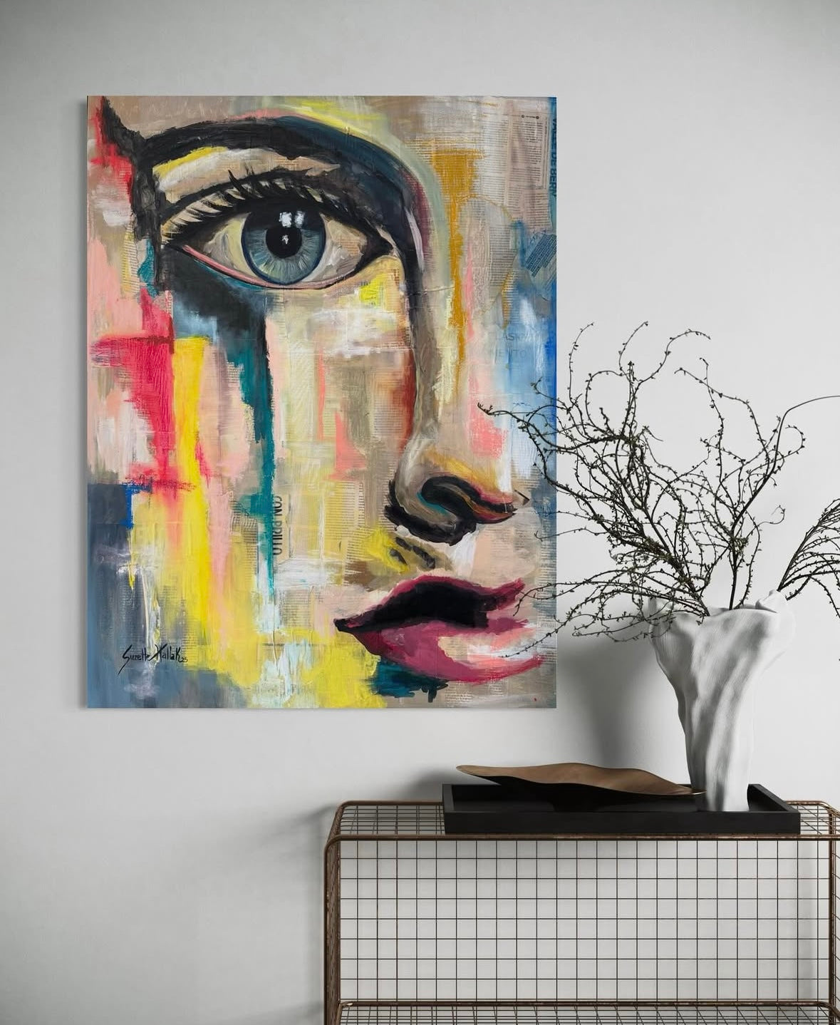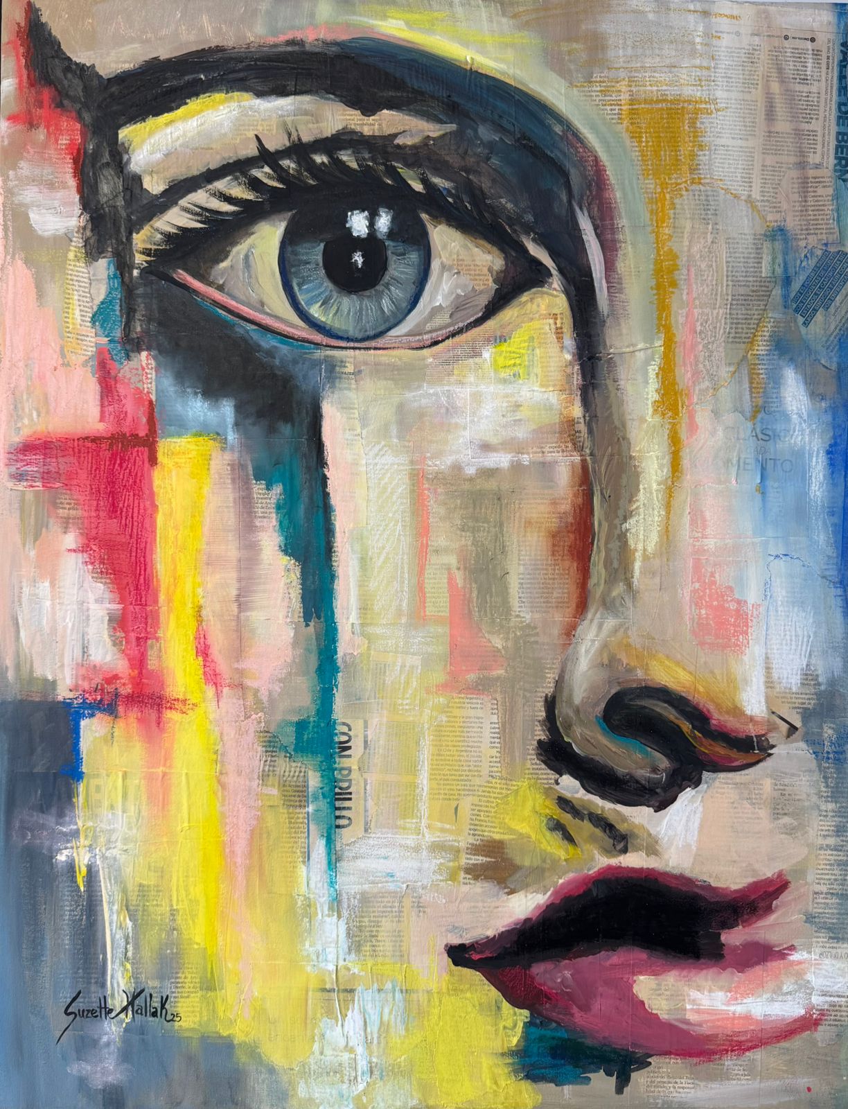El rostro fragmentado y el ojo en primer plano evocan la idea de mostrarse sin máscaras. La obra es un homenaje a la autenticidad, al valor de habitar lo propio con fuerza y sensibilidad. El trazo y la textura transmiten la huella del instante, como un espejo de lo humano e imperfecto. Por otro lado, la mirada en primer plano se transforma en un símbolo de verdad y transparencia. Aquí la materia pictórica y los trazos gestuales se mezclan con el collage, reforzando la idea de identidad múltiple. La obra es un recordatorio de habitar la vulnerabilidad como un acto de fuerza.