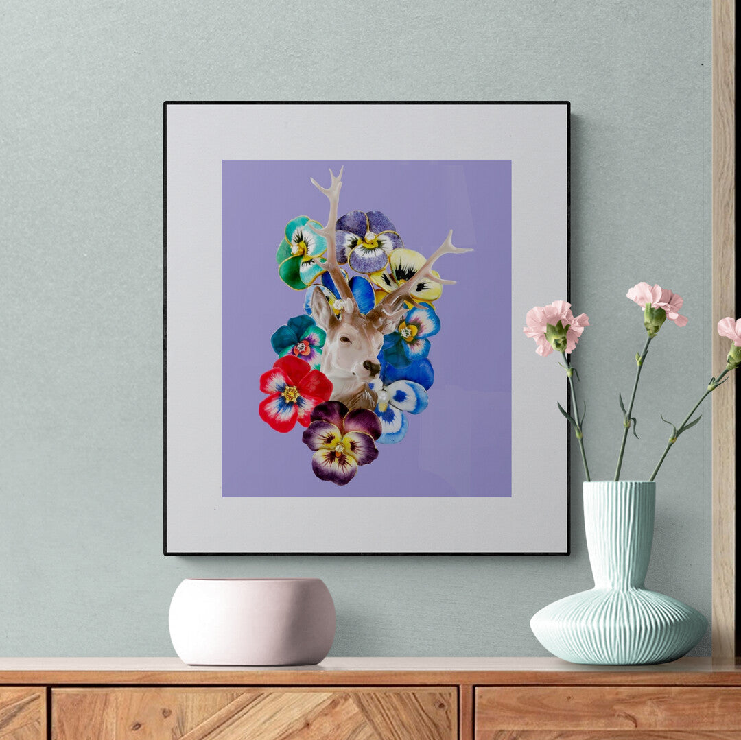 Primavera es un collage digital con la cabeza de un venado rodeado de flores con diamantes, representando la belleza de la estación, la libertad de los animales, y las joyas que representan lo que conforma la primavera.