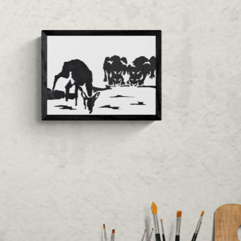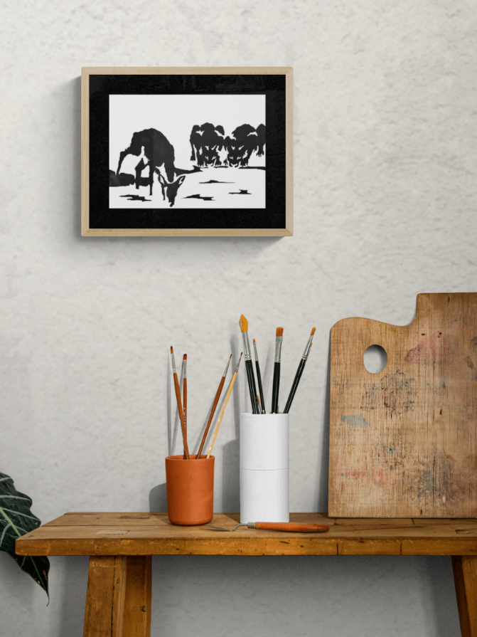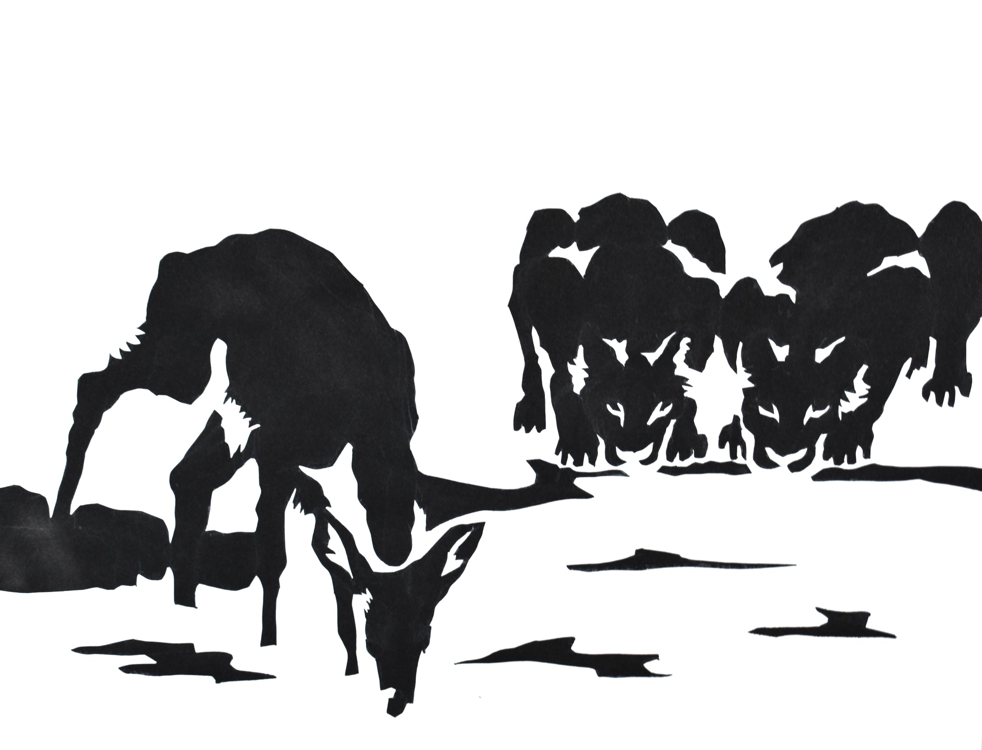 Síntesis monocromática que ensaya las ideas de depredador, presa y la coexistencia de necesidades para la vida.