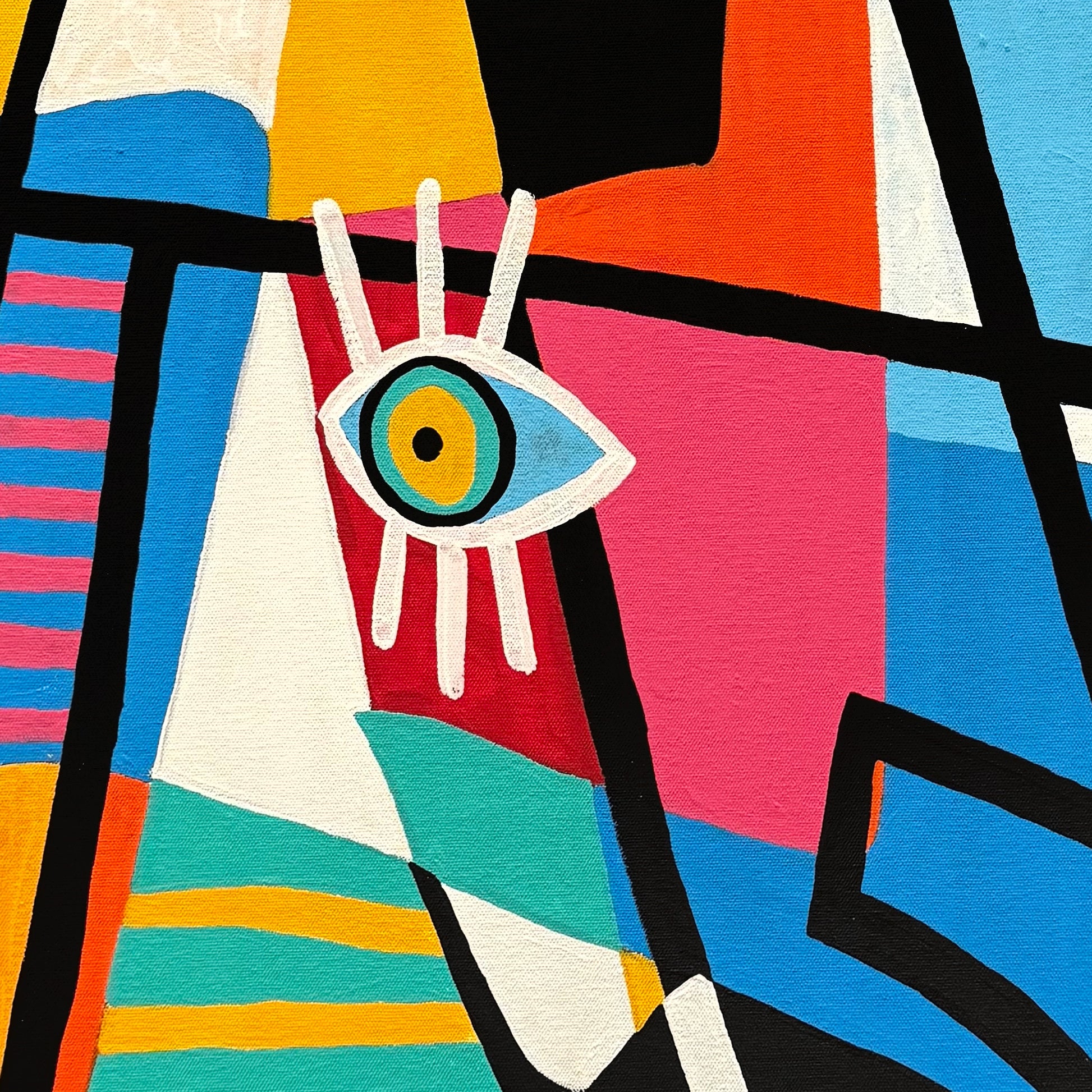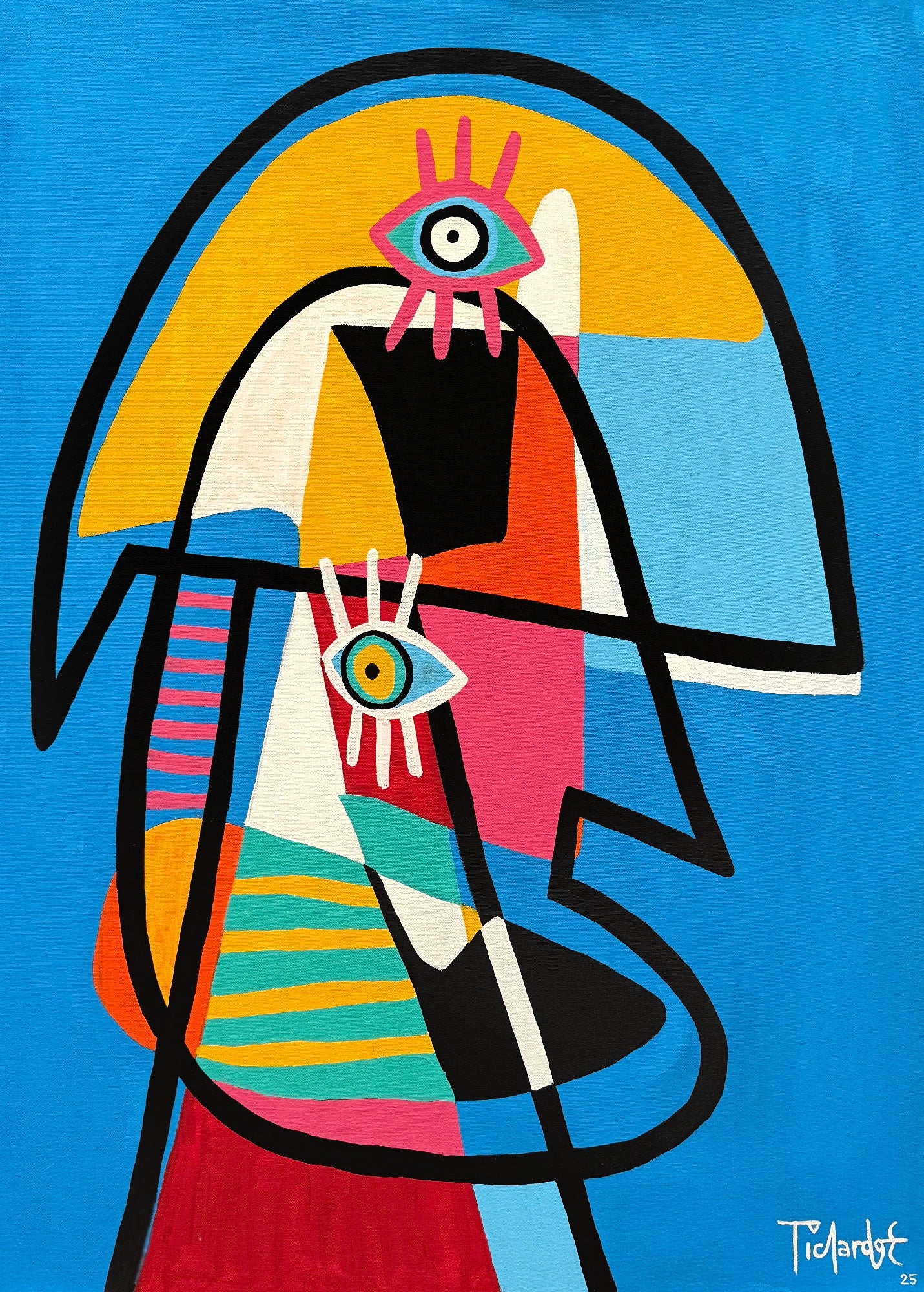 La imagen se organiza a partir de una silueta humana simplificada, donde cada sección del cuerpo se define por bloques cromáticos contrastantes. Los ojos repetidos, integrados como símbolos dentro de la composición, rompen la lectura anatómica tradicional y refuerzan el carácter abstracto figurativo de la obra. Este recurso genera una atmósfera lúdica y contemporánea que invita a una lectura emocional más que racional.