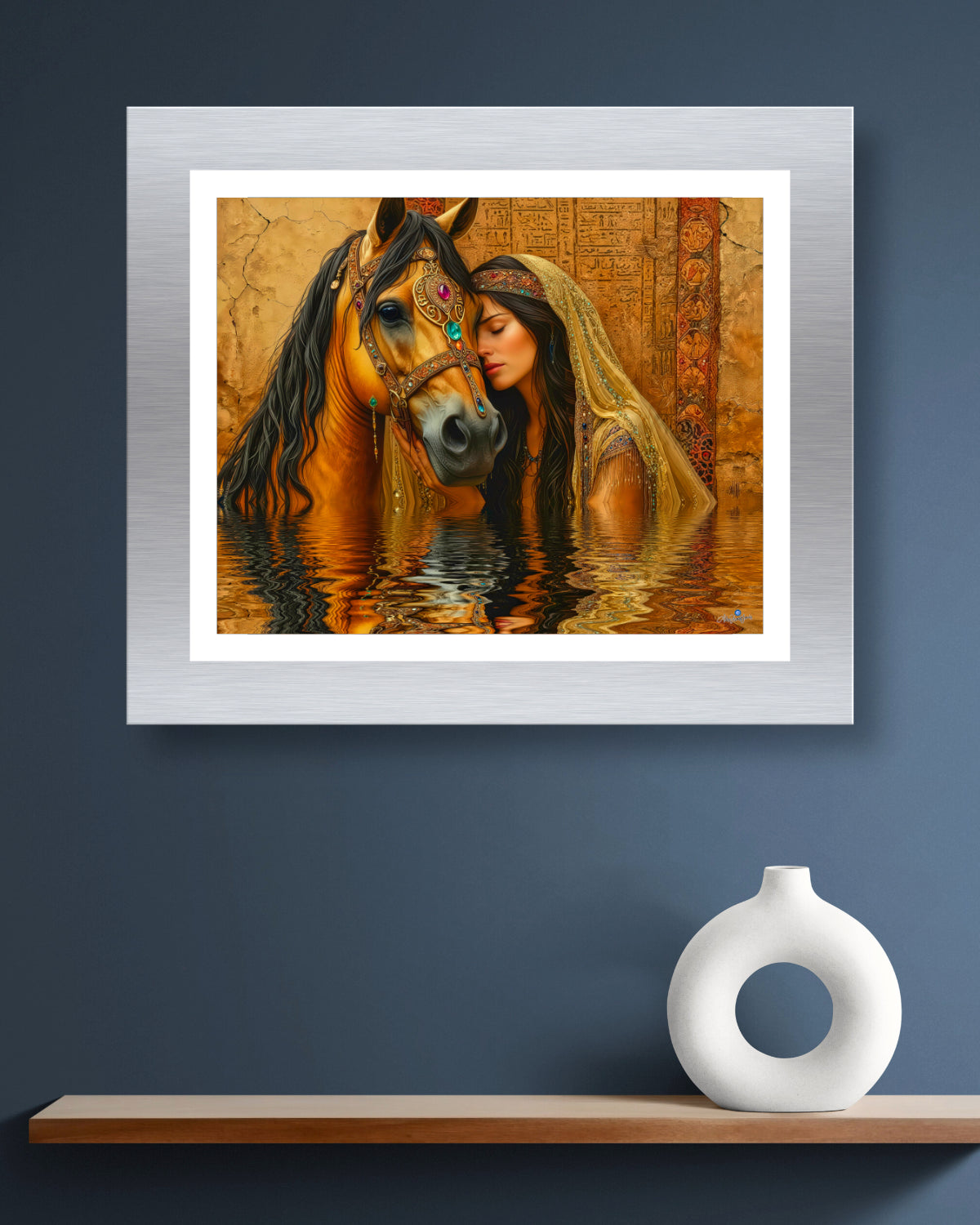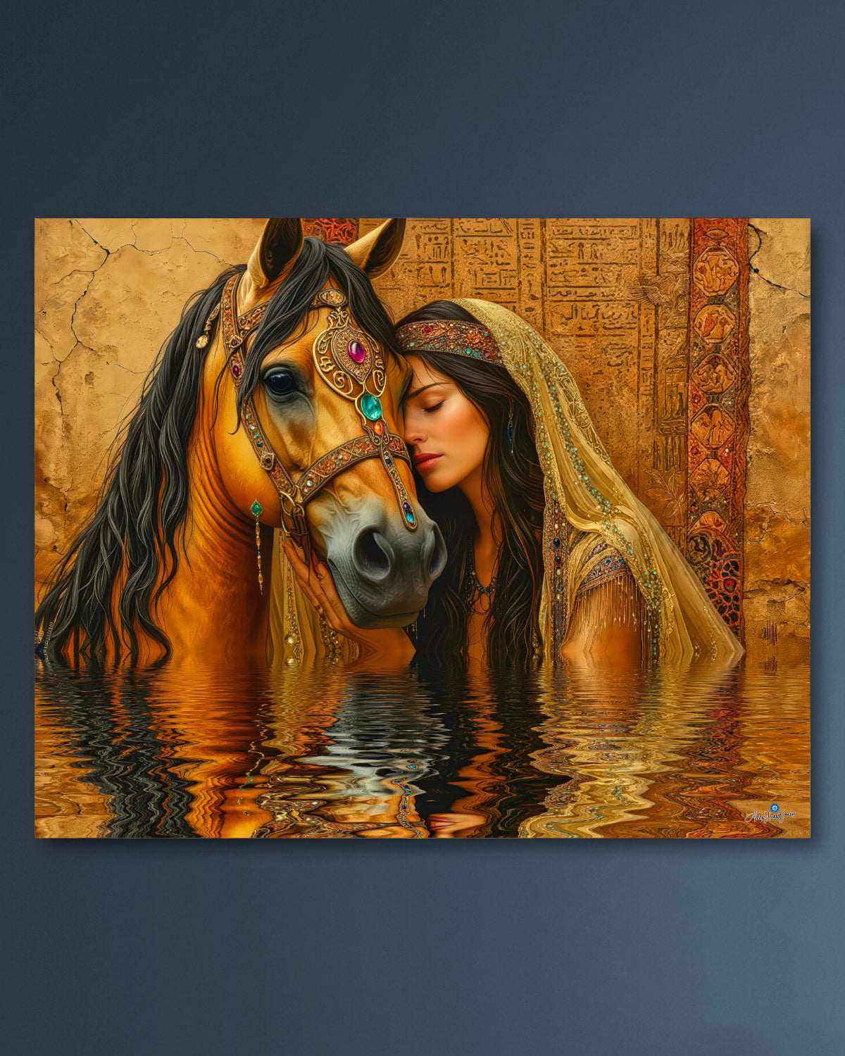 En esta composición, la figura femenina se funde con la presencia majestuosa del caballo dorado, símbolo universal de nobleza, poder interior y lealtad sagrada. La cercanía entre ambos revela un vínculo profundo que trasciende lo terrenal: no es dominio, es conexión espiritual.