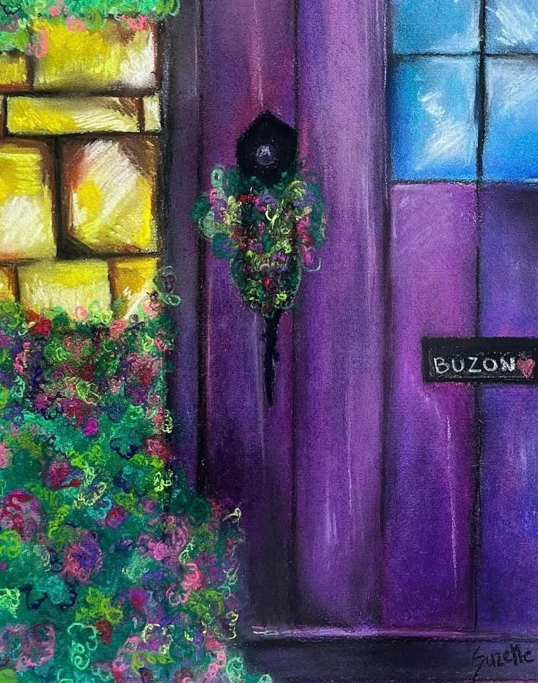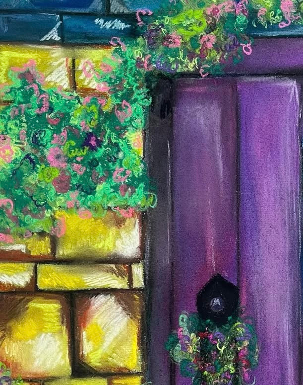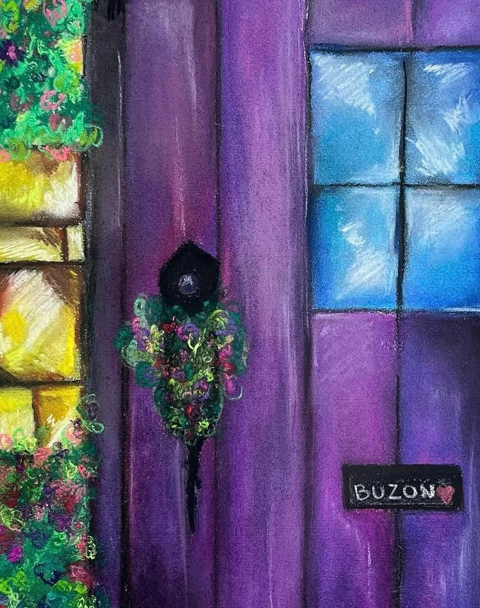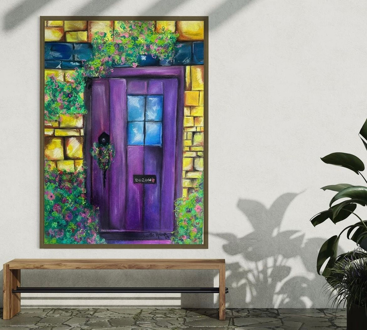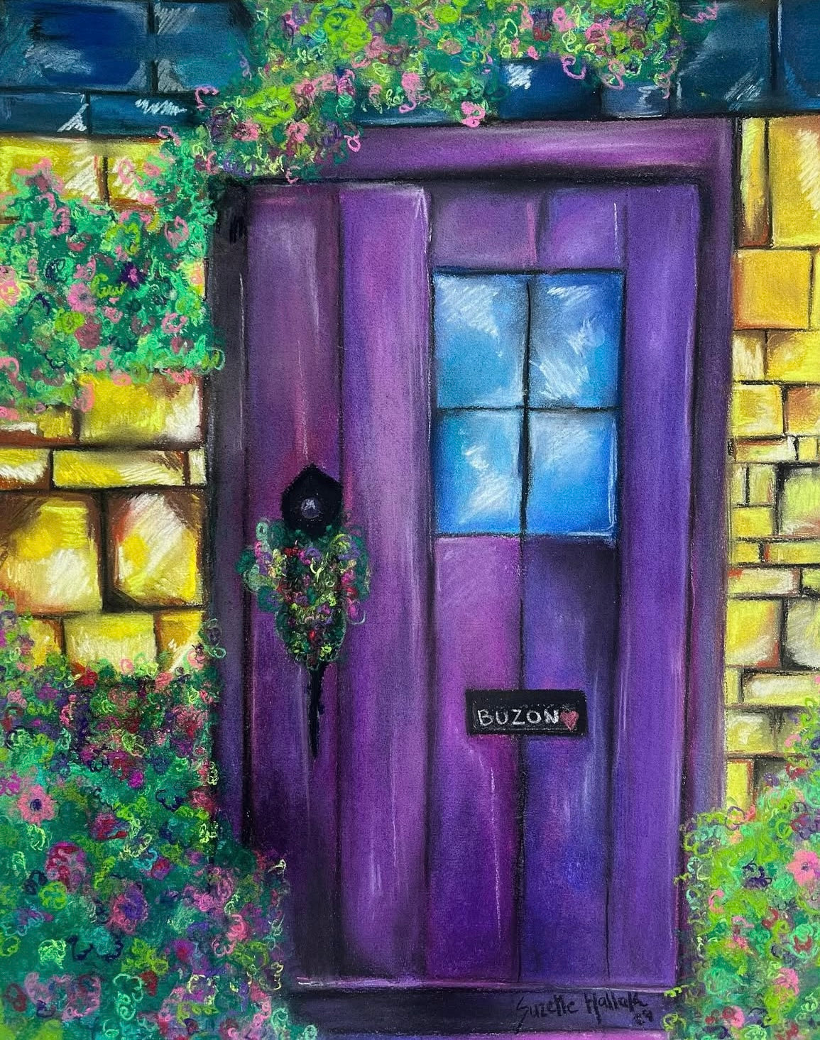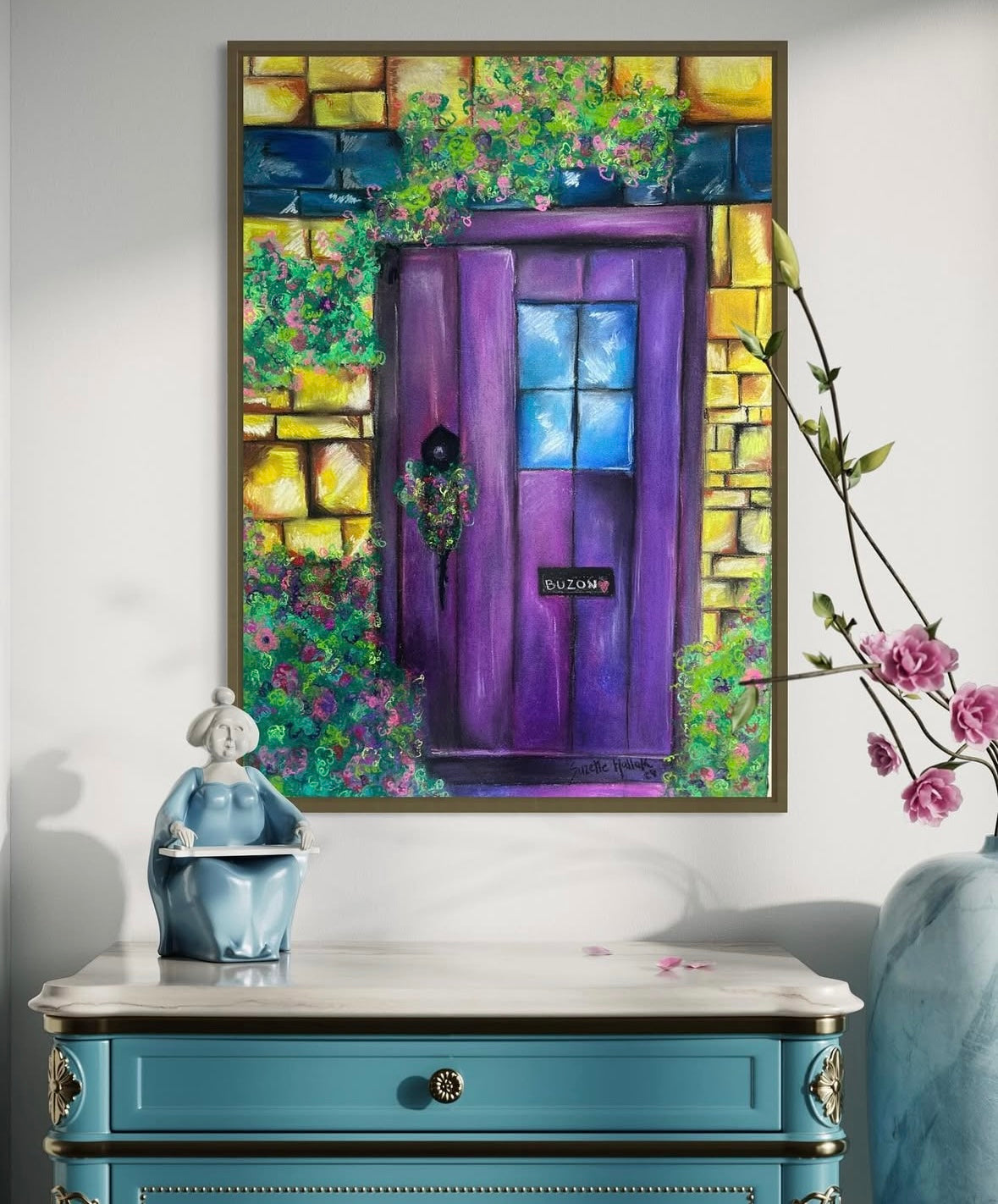 Una puerta morada se erige como umbral entre lo que fue y lo que está por venir. Los muros dorados conservan la memoria del pasado, mientras la luz azul del interior sugiere esperanza, intuición y renacimiento. En esta obra, el color se vuelve símbolo de tránsito: el momento exacto en que el alma decide cruzar hacia su siguiente versión.