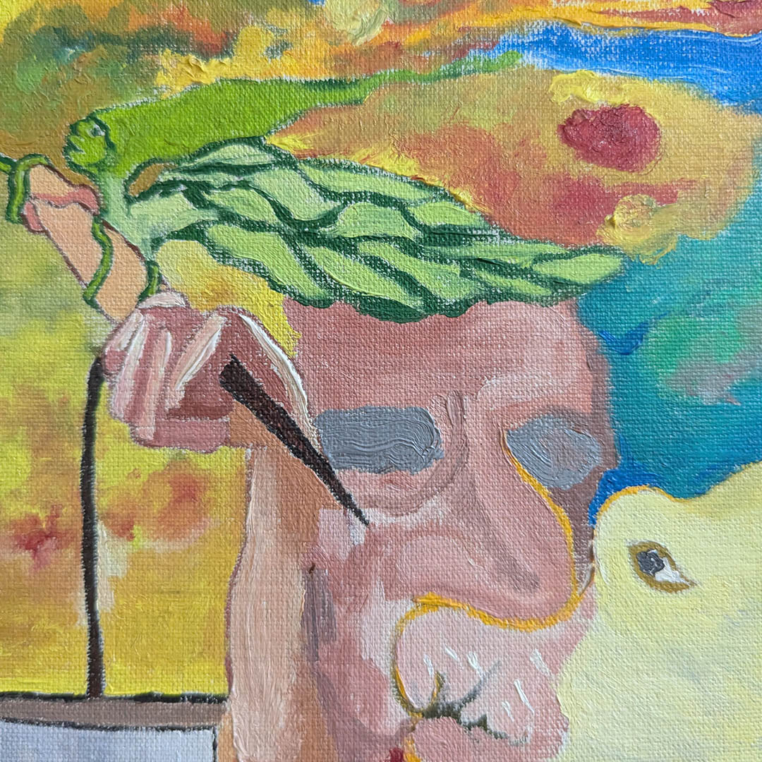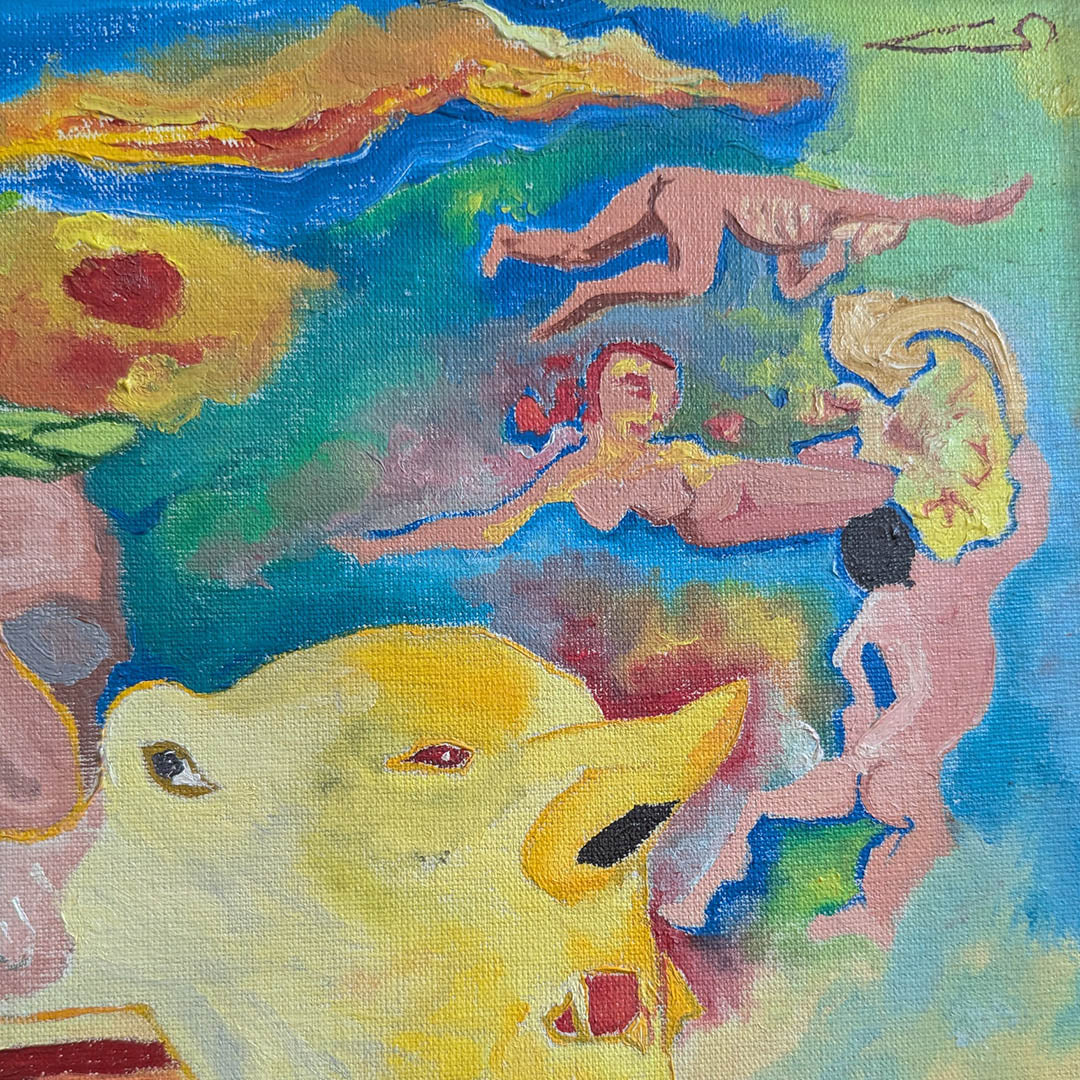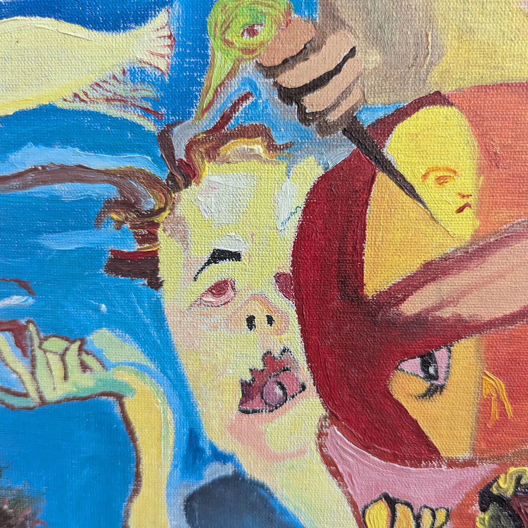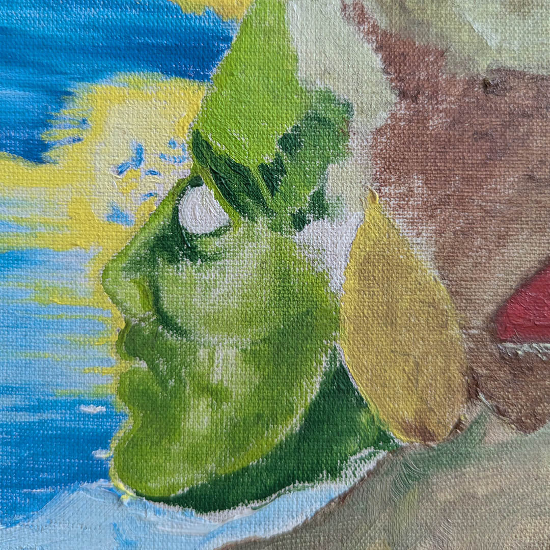 Hay un hombre verde, ciego, frente a un horizonte reconfortante, pide limosna. También hay otros seres, animales irracionales, peces, aves y puñales.