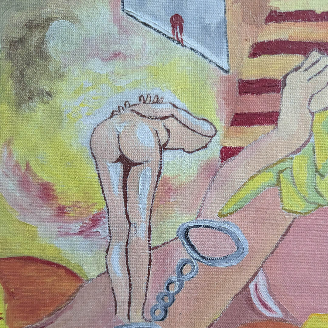 El que arrastra la carga de maldad es el demonio. El demonio es la policía, ahí están las esposas, ante la cual se inclina alguien esperando la decapitación. La afilada guillotina es sostenida por el brazo fuerte, masturbatorio, el pene es secuestrado por los duendes.