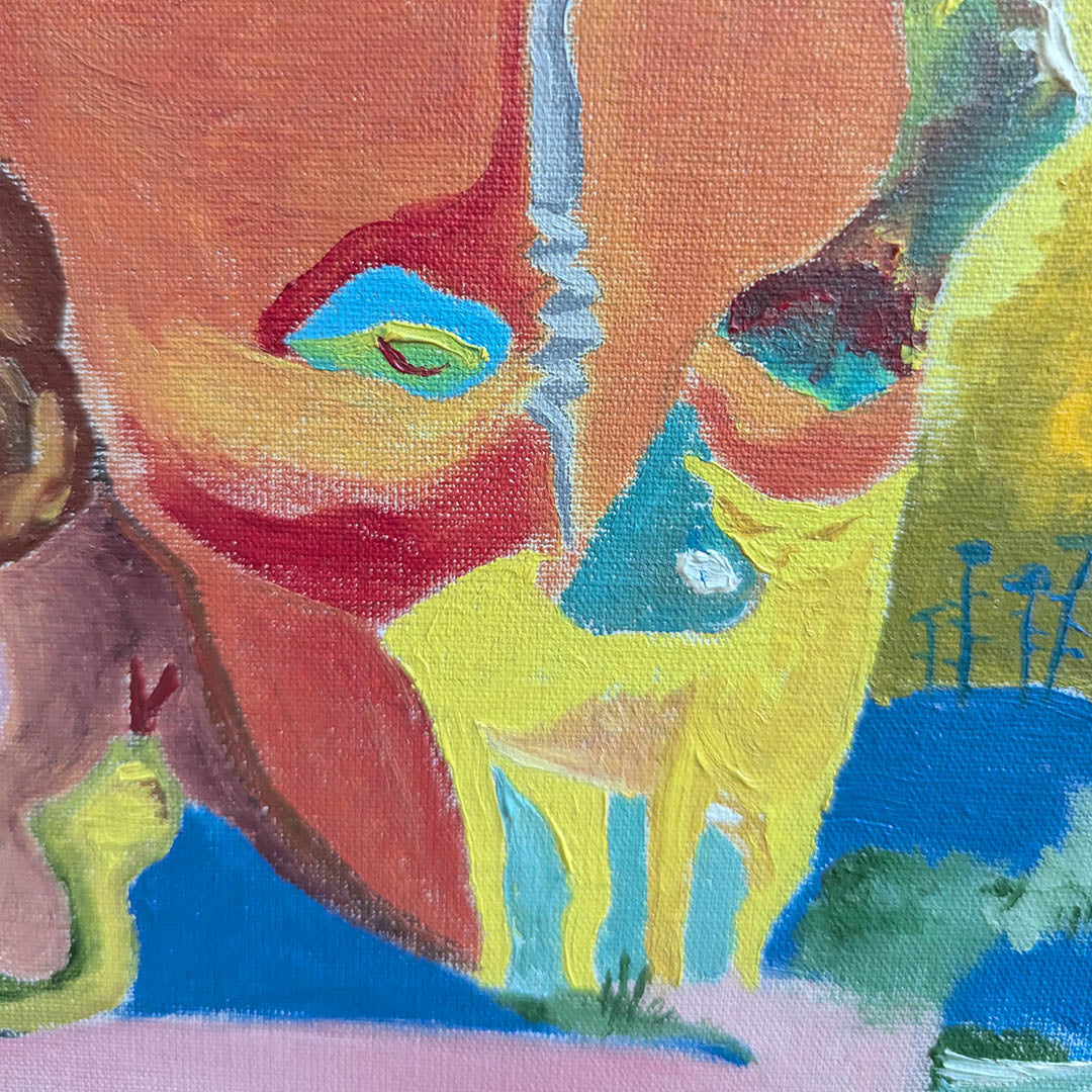 La pierna izquierda es un cerdo que deambula en la obscuridad acariciando un perro. La pierna derecha es una cabeza naranja, un gato montés, y una herramienta de tortura, instrumento que maneja el diablo.