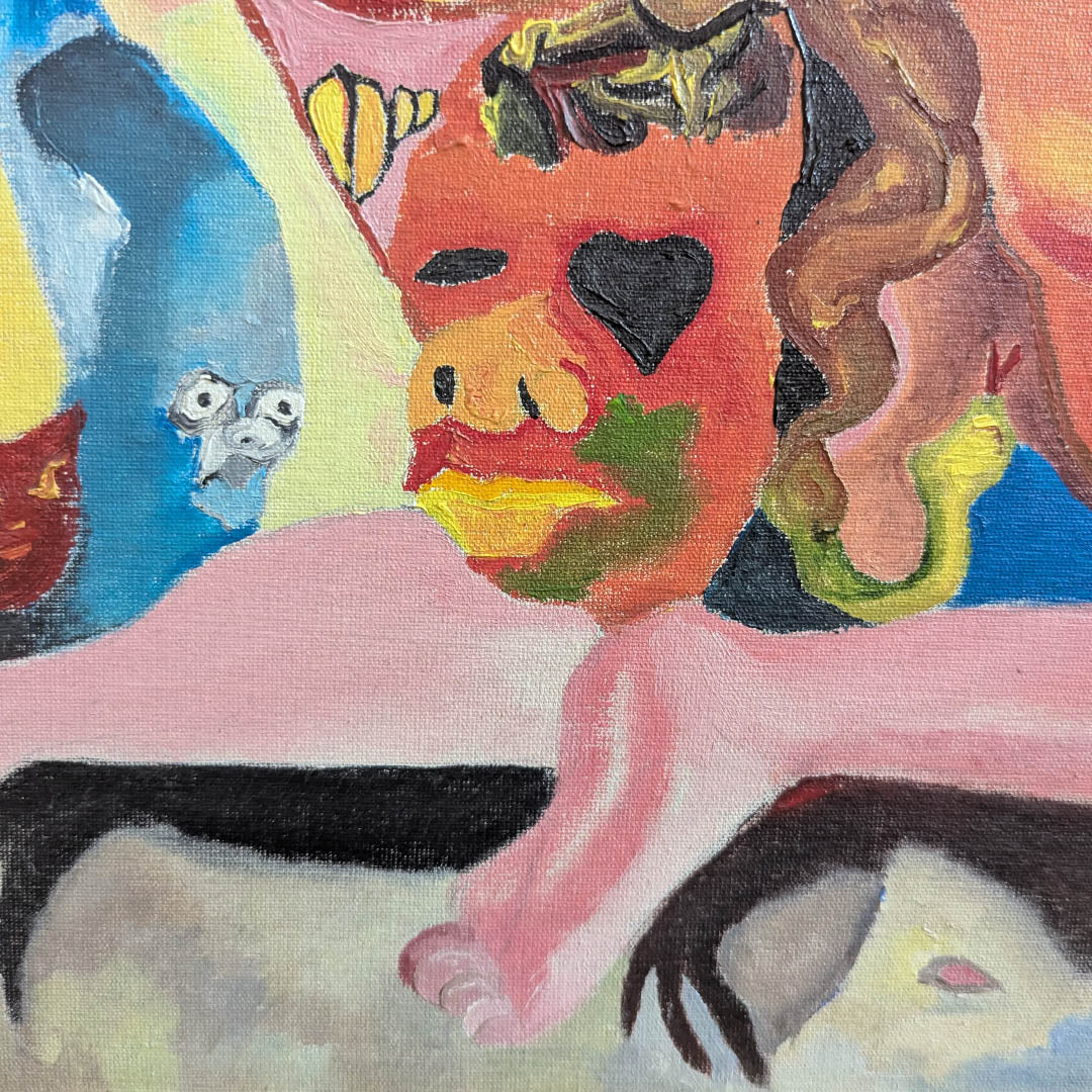 Hay un señor con las manos juntas , camisa a rayas, de prisionero, su sexo es una vagina. Descansa sobre las nalgas delirantes, hay una argolla entre ellas de donde se derrama la mierda que es la pestilente serpiente, el mal.