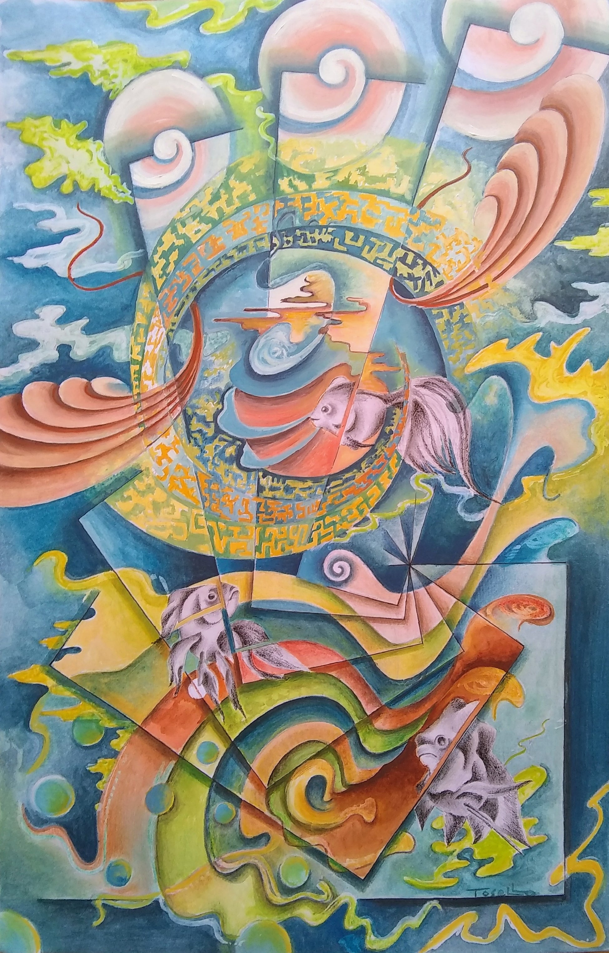 Composición de vibrante colorido en la que convergen mar y cielo. Líneas rectas y onduladas se combinan creando ambientes de etérea fantasía por los cuales se antoja flotar y deslizarse sin preocupaciones. El punto de encuentro está determinado por una sucesión de planos consecutivos que sutilmente geometrizan y, a la vez, dinamizan la atmósfera.