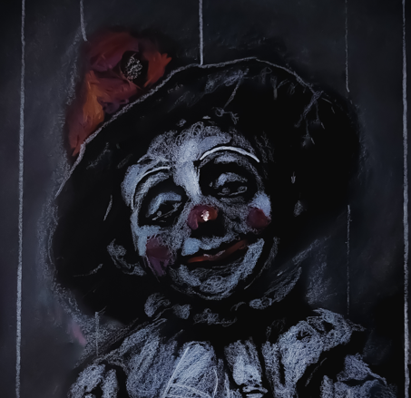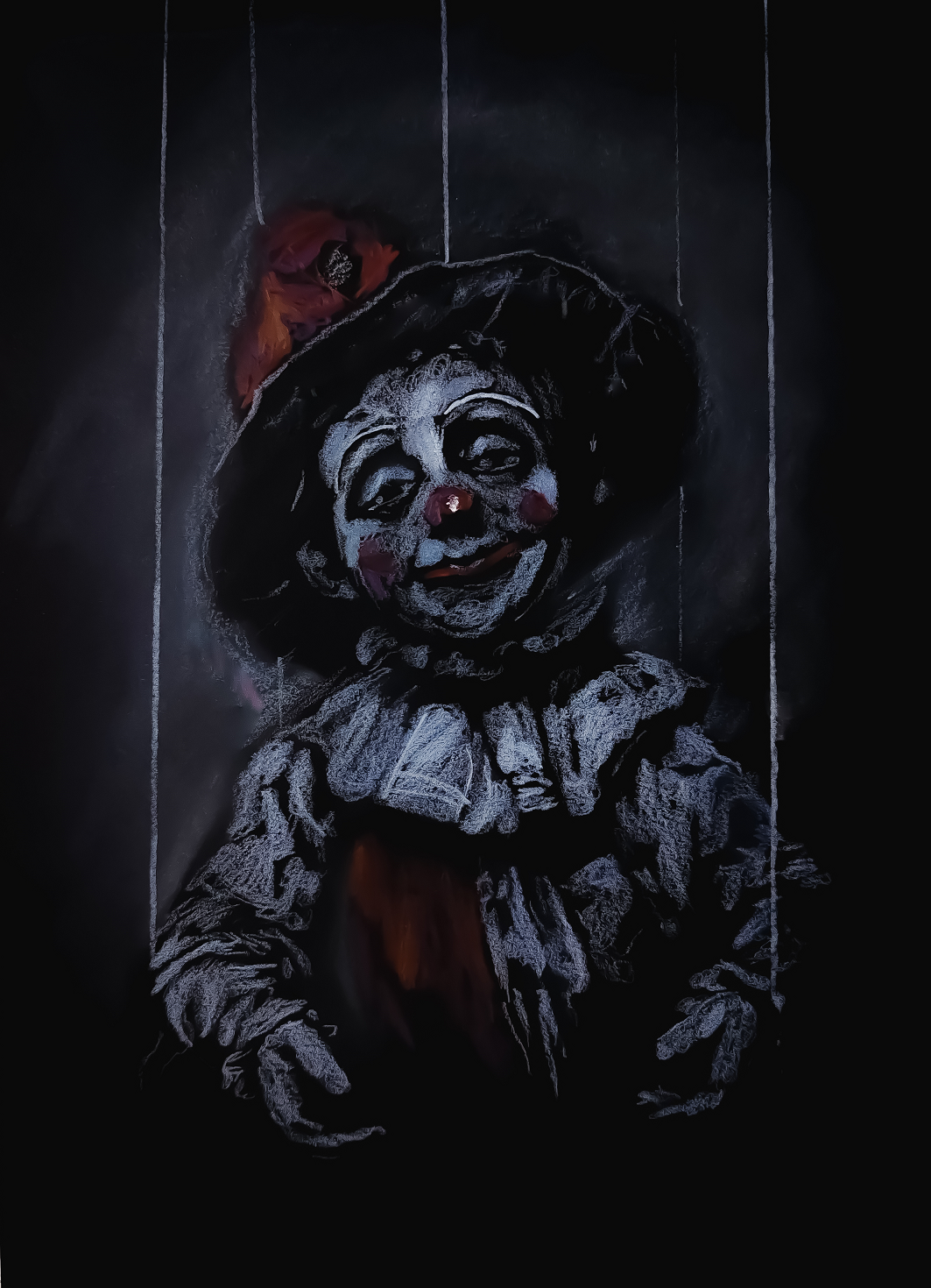 Un títere deformado, colgado de hilos que nunca eligió. Su sonrisa es una herida abierta, su mirada vacía clama por libertad en un mundo que solo lo usa, lo exhibe y olvida. Un ser roto, sin voz.